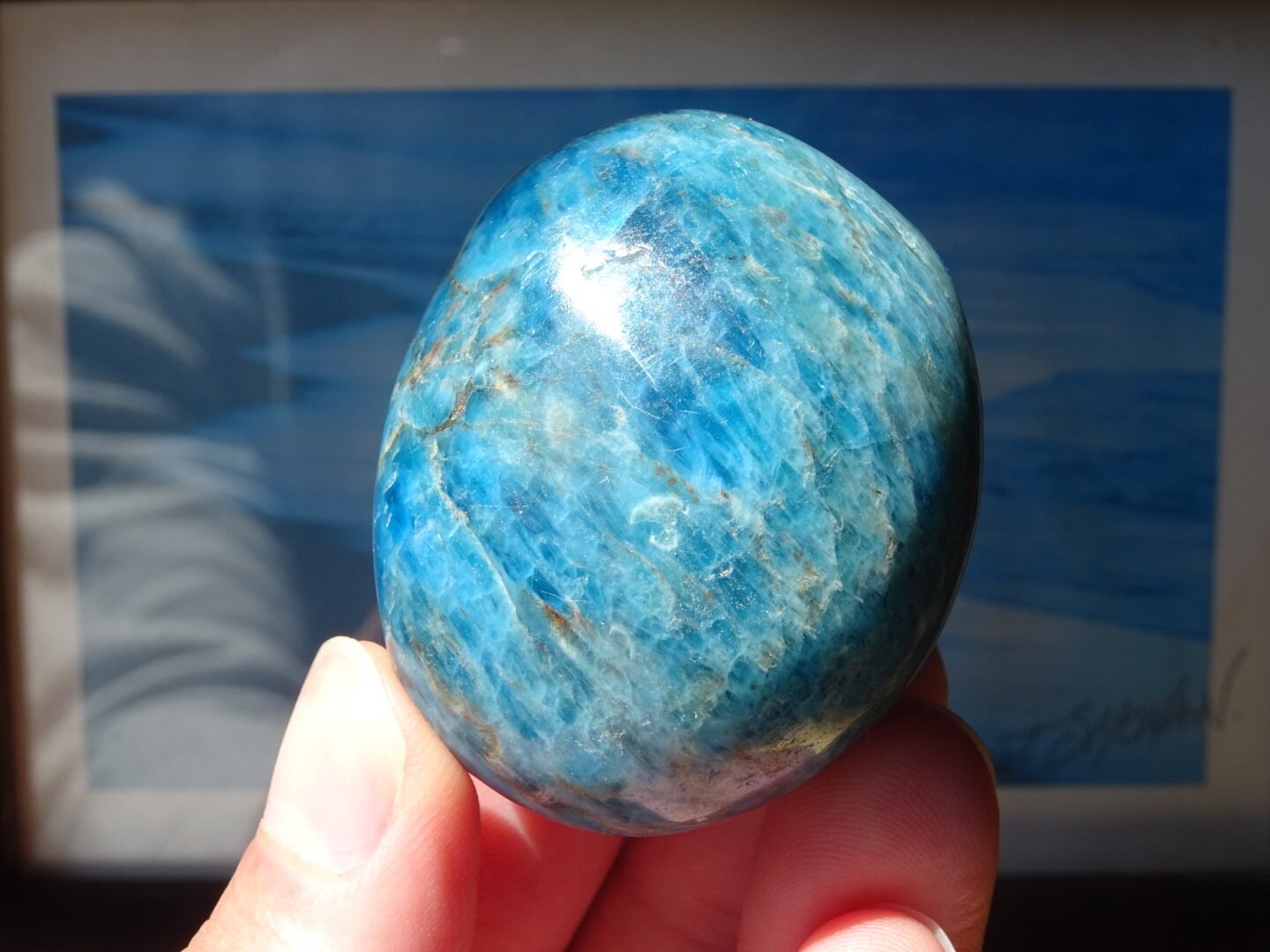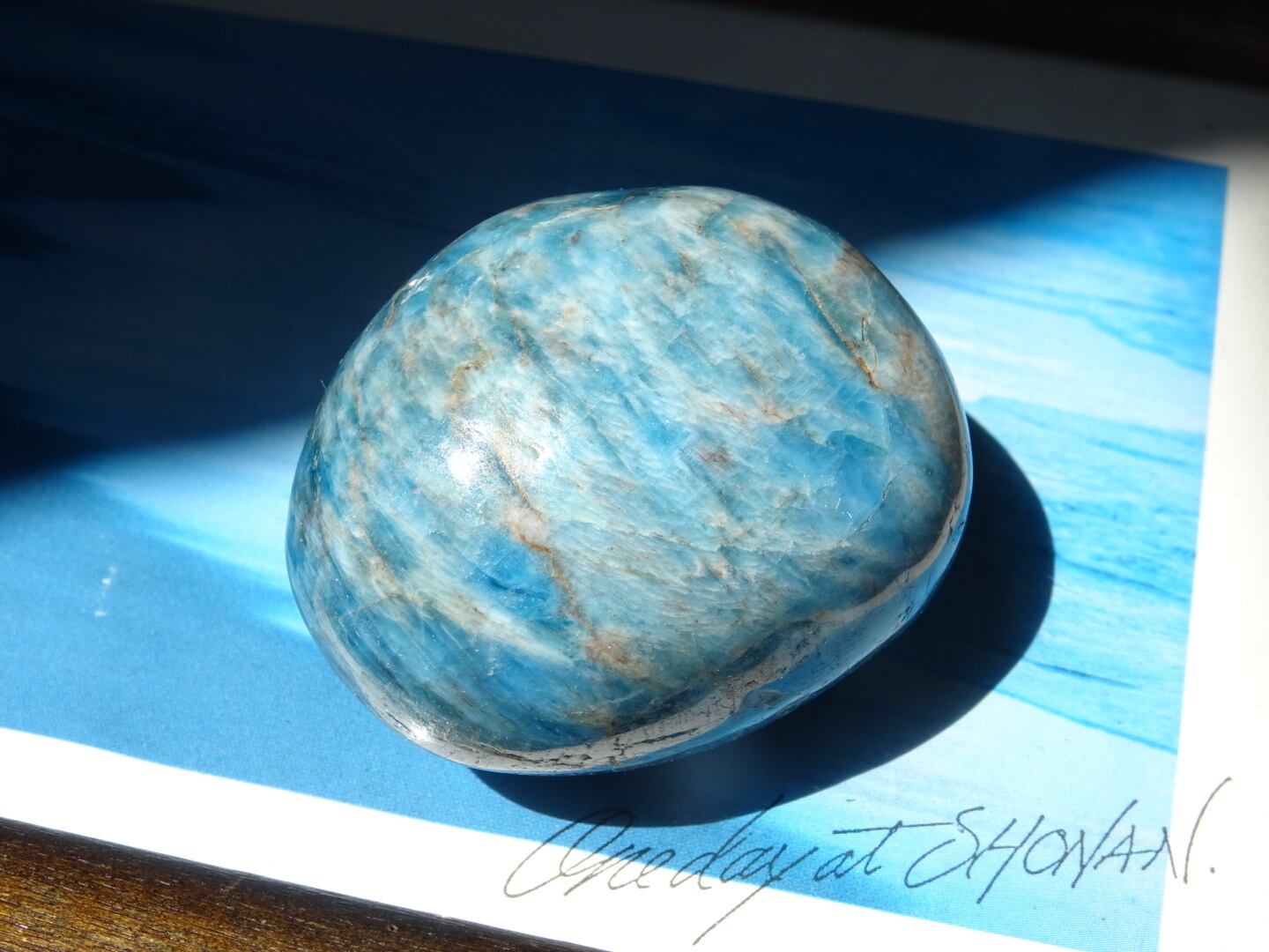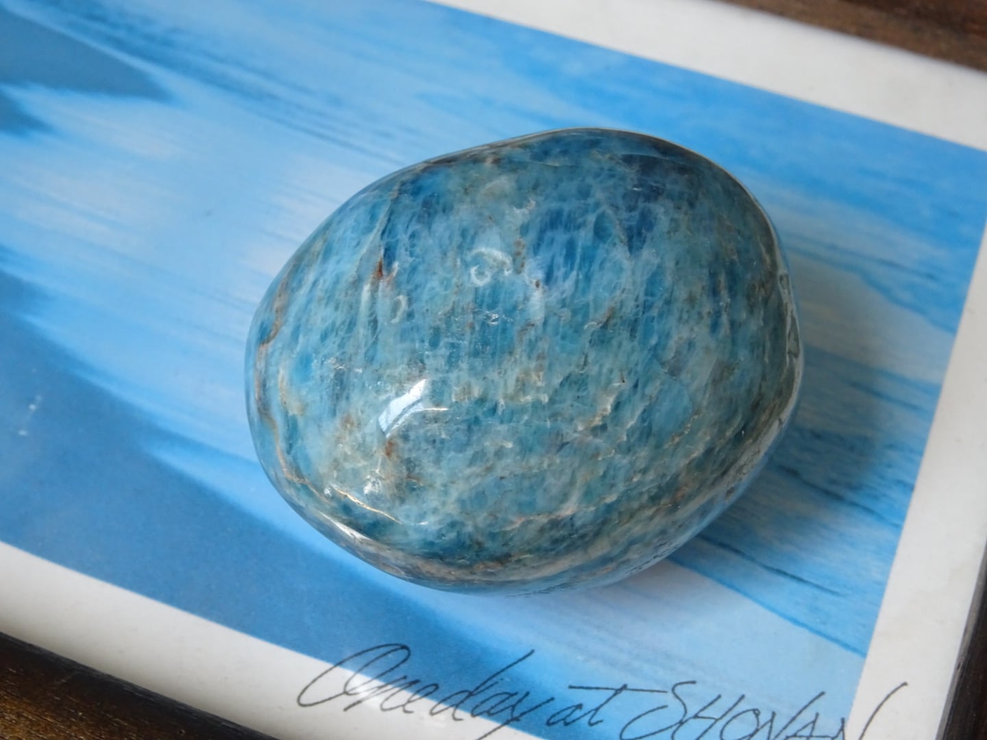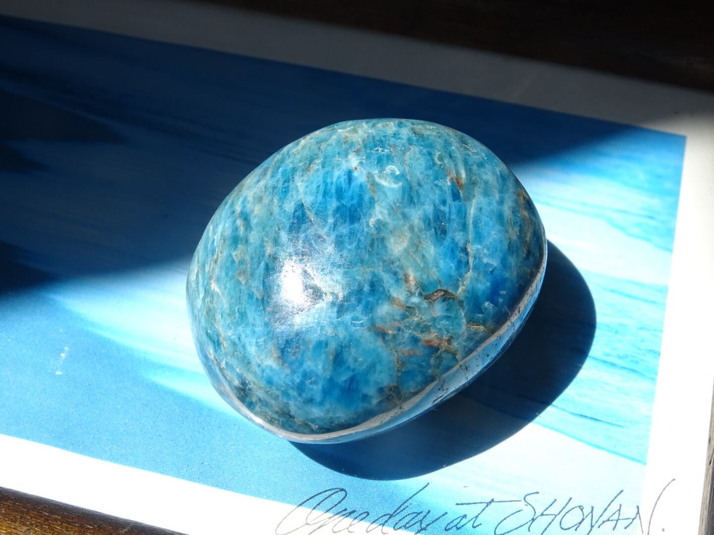 コロンとまるみを帯びた姿が可愛いブルーアパタイト。こちらはブルーに加えてホワイトが混ざっています。見た目の割に不思議に重さがあります。
