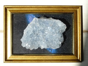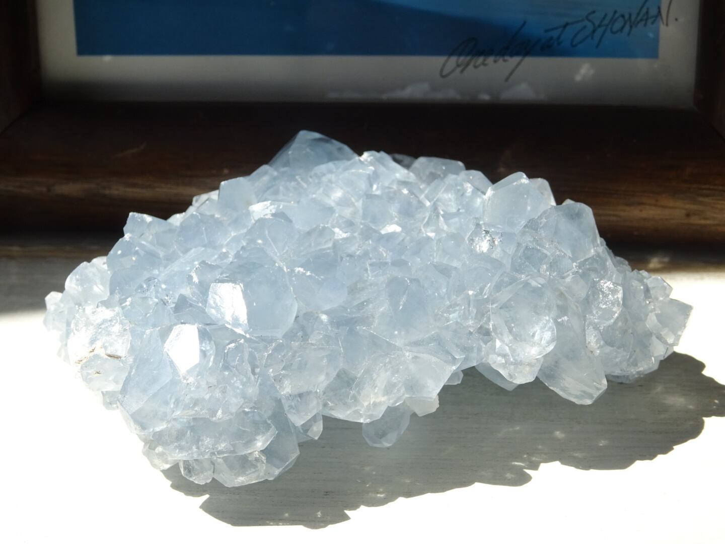 まるでセレスタイトの聖域そのもののよう。とても珍しい母岩のない全面結晶タイプです。裏表両面にセレスタイトらしい淡いブルーがびっしり結晶しています。結晶はひとつひとつがしっかりしていて照り照り、きらきらの石肌。非常にハイクオリティで美しいクラスターです。
