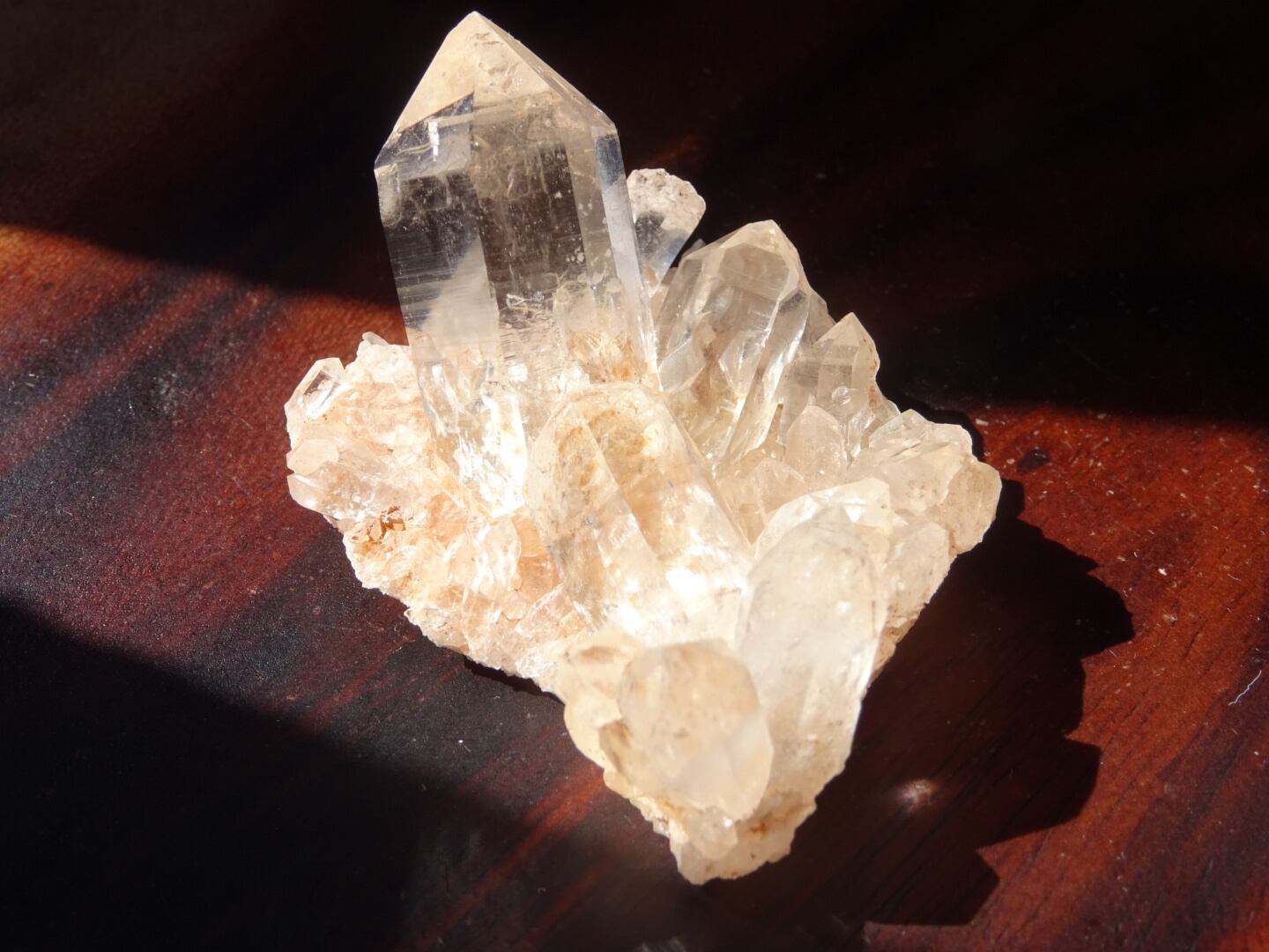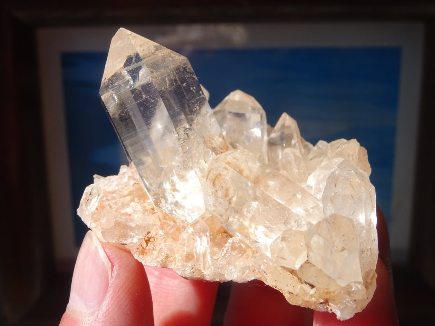 マニカランの石はアイスクリスタルもしかり、こういった鉄分の影響でピンクがかった石も多いのですが、とにかく可愛いですねぇ…このうっすらピンクの石世界。一番大きな結晶はカタチもよくてそしてとてもクリア。小さなクリスタルの箱庭のような世界観をもっています。