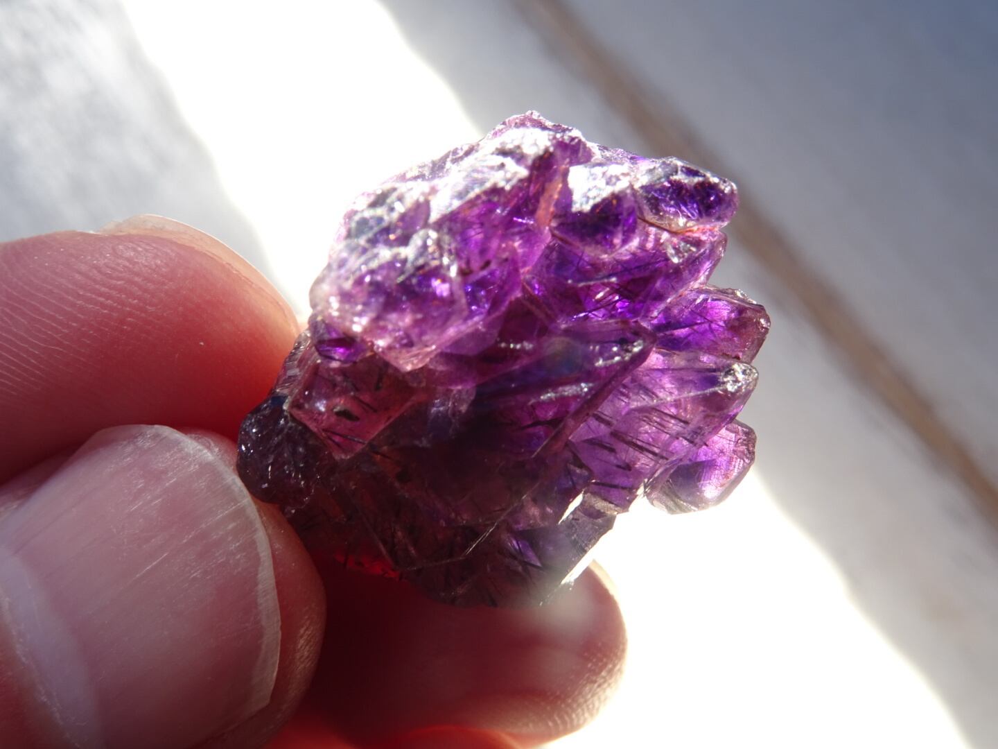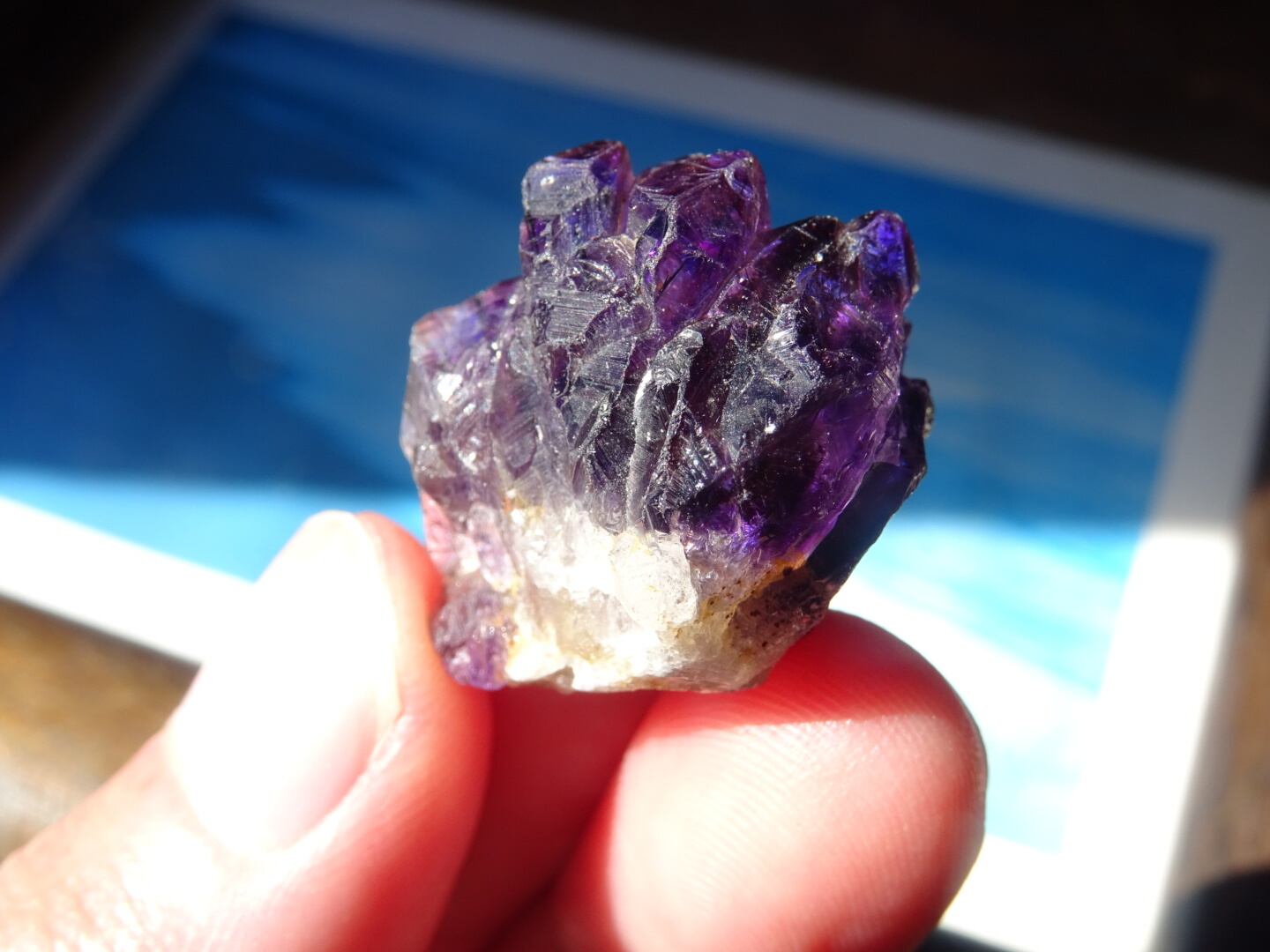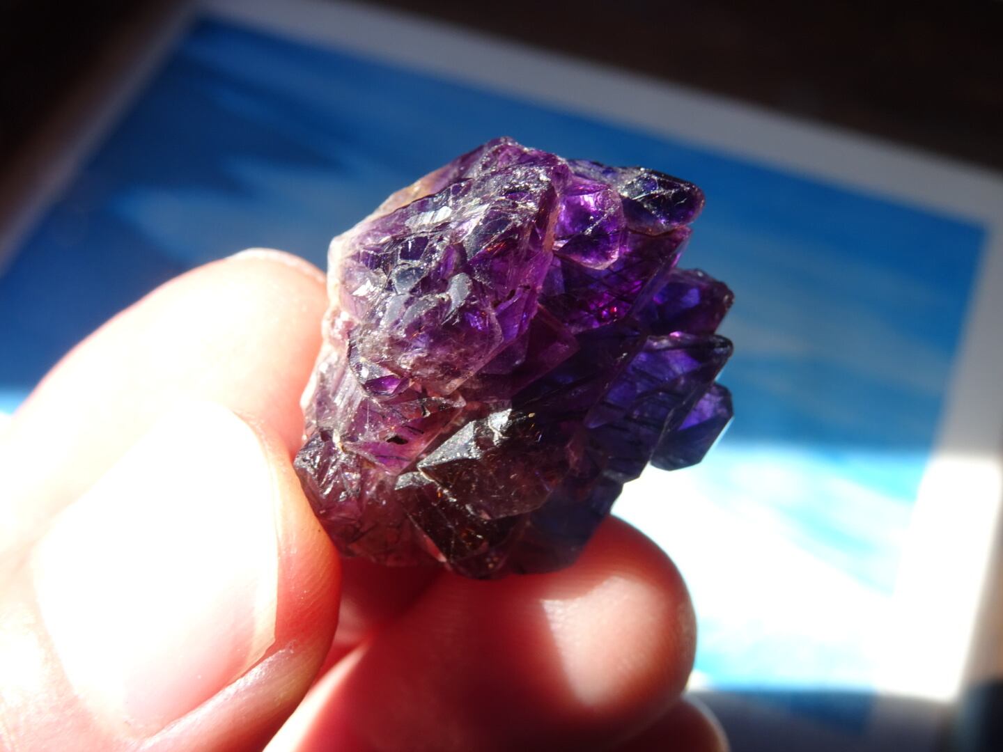 いわれ云々を抜きにしてとっても美しいアメジストです。発色がいいのはもちろん、お城のように連晶している姿が美。ここまで綺麗に結晶しているものって少ないのではないのかな。光に透かしたときの内包物たちの表情もいいです。