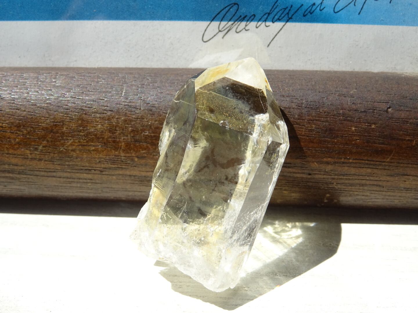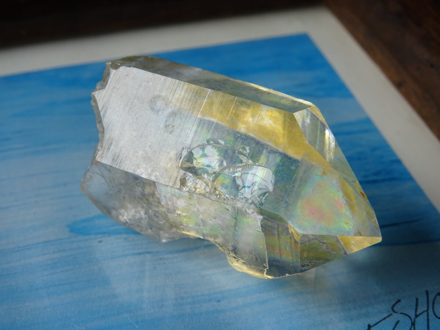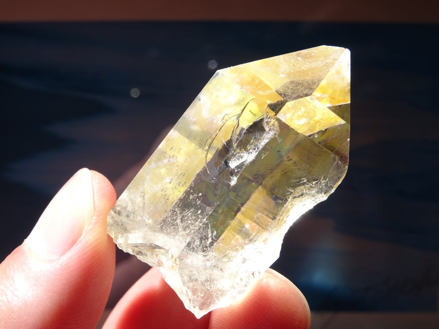 リモナイトによって部分的にシトリンのようなイエローカラーになっているタンザニアマスター。いくつかの結晶面には酸化鉄の被膜によるグリーン&ピンクの虹が浮かんでいます。透明度もあり、自立もしてくれる可愛いマスターです。よく見ると右向きの平行四辺形である「フューチャータイムリンク」も。