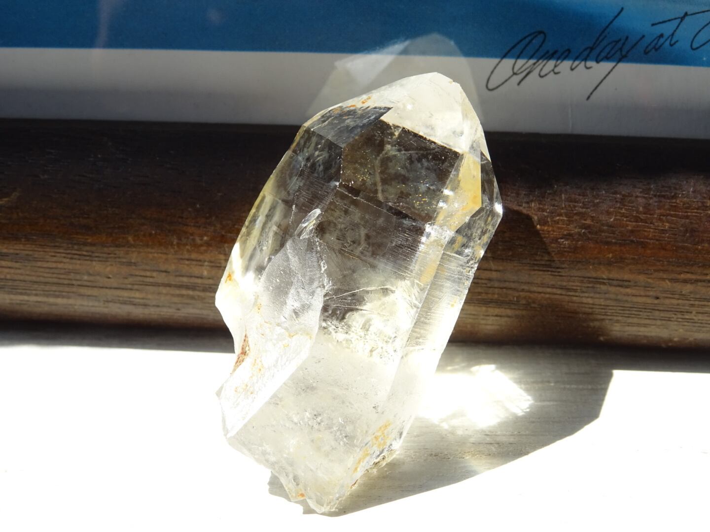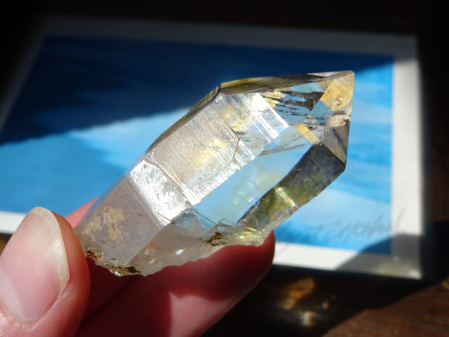 シトリンのようにうっすらと色づいているからか、とても優し気で「まろやか」な雰囲気の結晶です。写真ではあまり映せなかったのですが、虹彩も出ていてうっすらイエローの宝石のよう。ふっくらしたフォルムも愛らしく、手のひらの上で愛でたくなる素敵な結晶です。