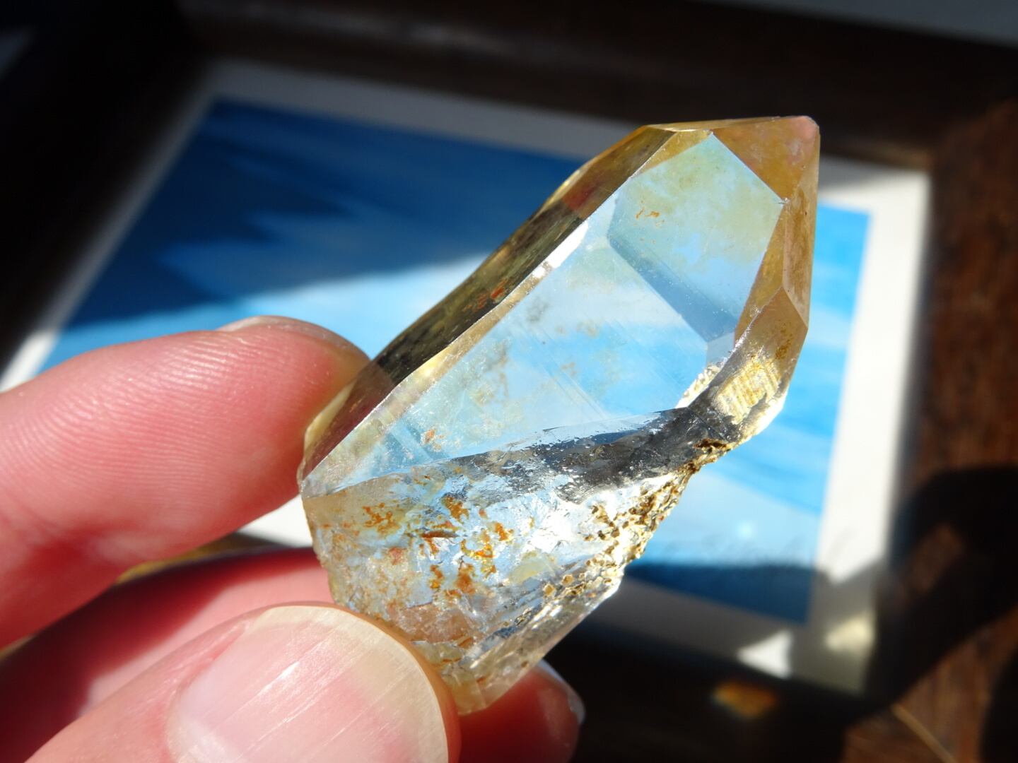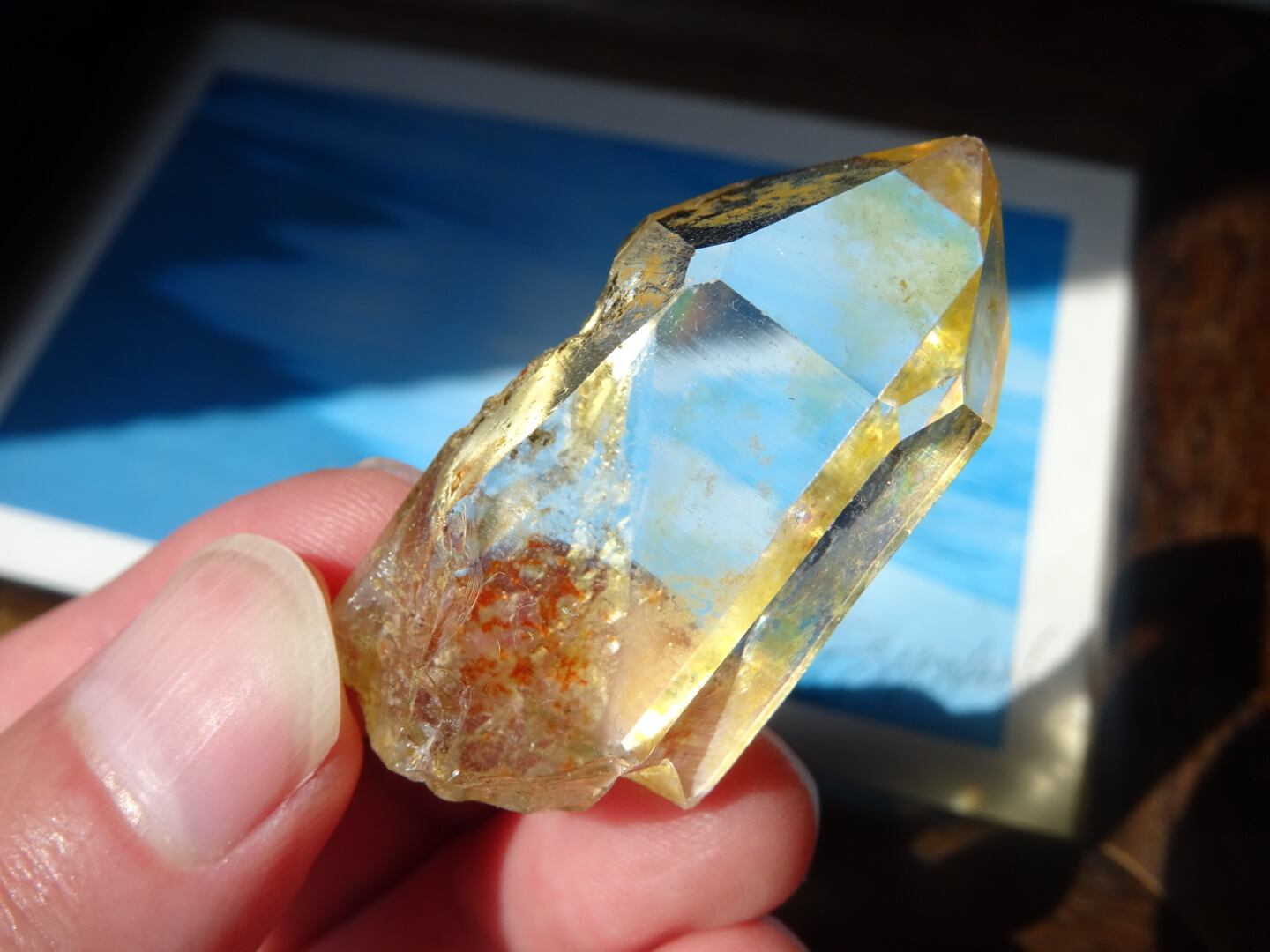 もはや説明ご不要の美しさのこのマスター。イエローゴールドの光がただただ美しいです。内側はクラックもインクルージョンもなくクリアそのもの。表面に付着している黒い粒々やオレンジレッドもいい味出しています。背面は他のクリスタルの剥離痕がありますがカタチも整っていて、とーーてもお勧めの美しいイエローレインボーのマスターです。