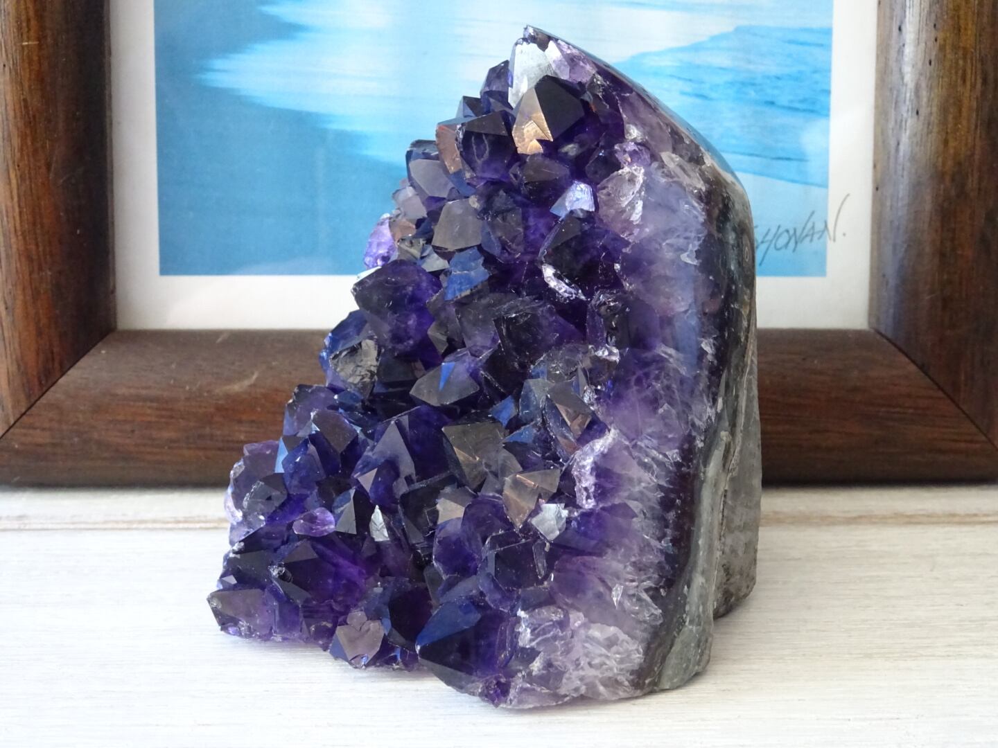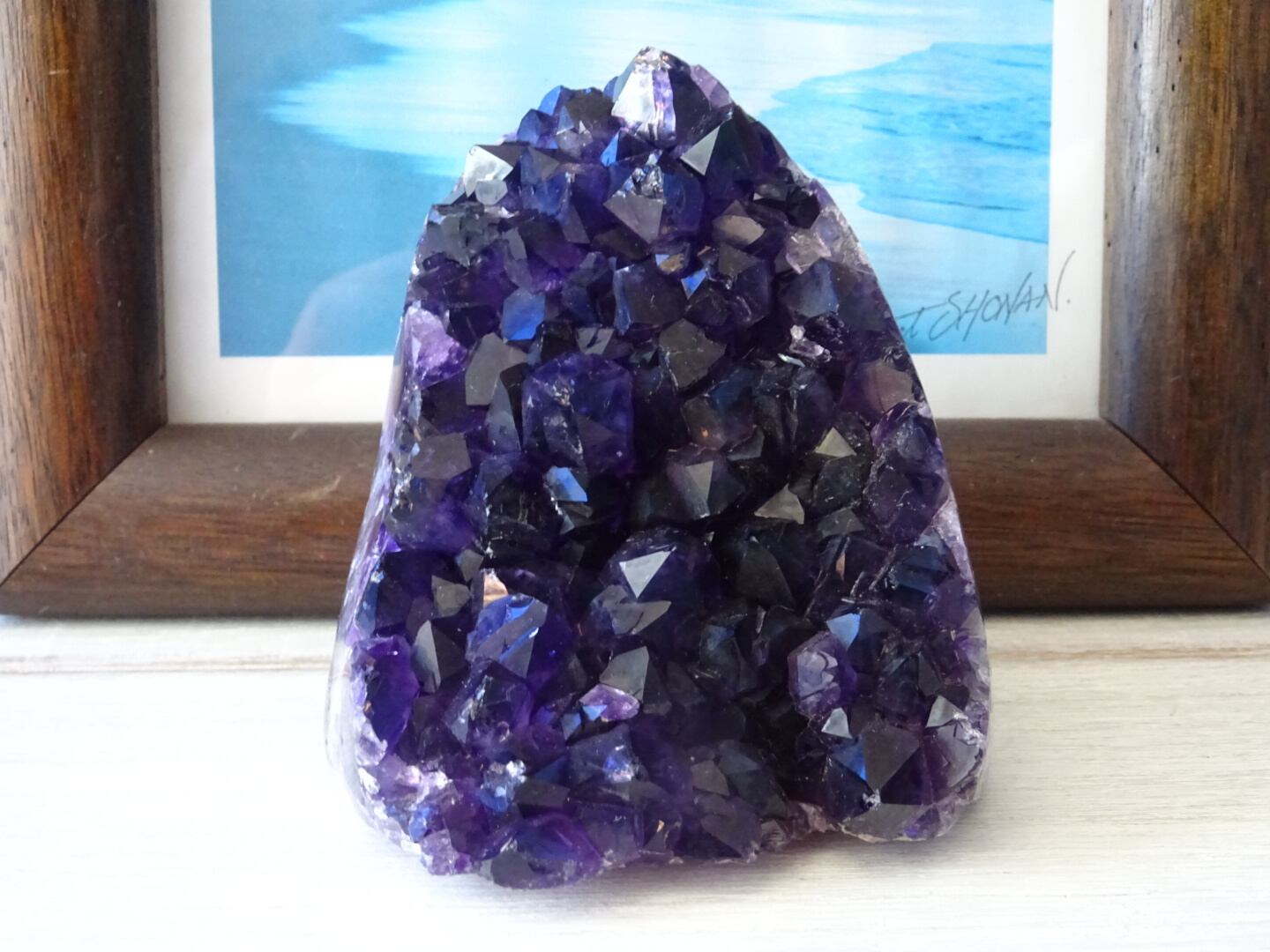 ブログ記事でも書いていますが、こういったアメジストの大きなクラスター(店主はマウンテンと呼んでいます)、またはカペラやジオードってそこにあるだけで神聖な雰囲気を放ってくれます。空間に清浄さが生まれる感覚で、聖域づくり、サンクチュアリにもとてもよい石です。クラクラするように濃密な響きを放っていて、エネルギーの汚れを洗ってくれる感覚があります。