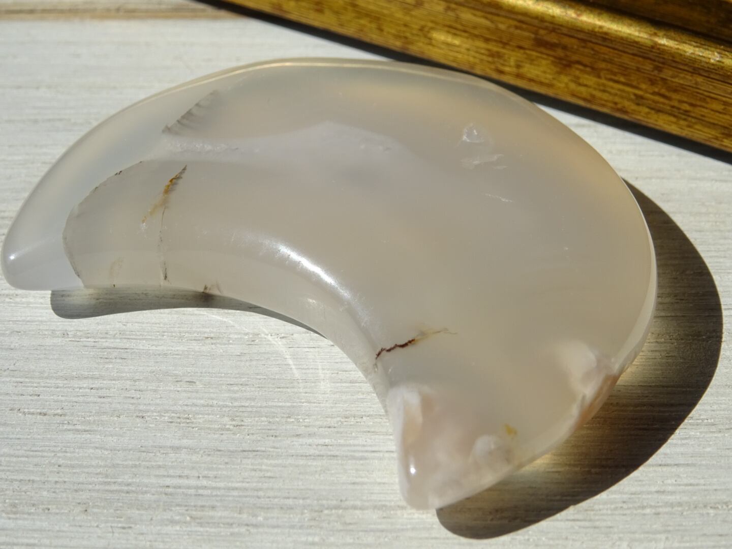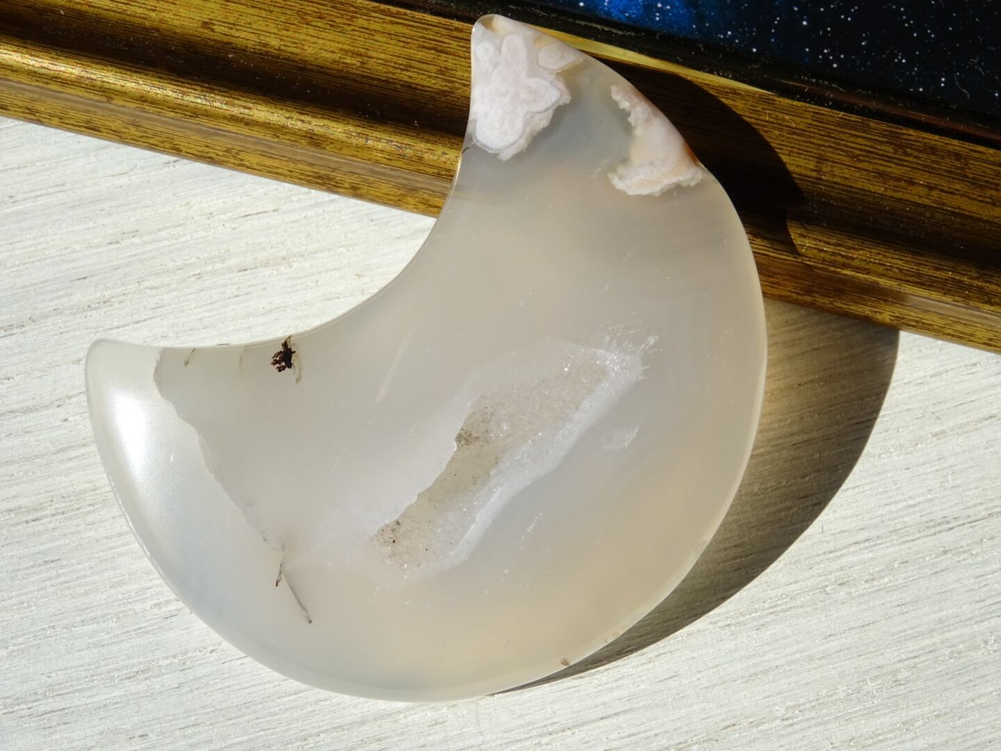 愛らしいミルキーホワイトのアゲートムーン。中心部分がミニジオードになっていてきらきらの光が綺麗。そして光に透かすとジオードの周りが層状になっているのがはっきりと覗えて幻想的です。白い花のような成分、植物のかけらのようなデンドリティックになっている部分も(実際は鉱物です)。押し花のように内包物を閉じこめた、優しい雰囲気のお月さまです。お迎えされた方はぜひ光を透過させて眺めてみてください。