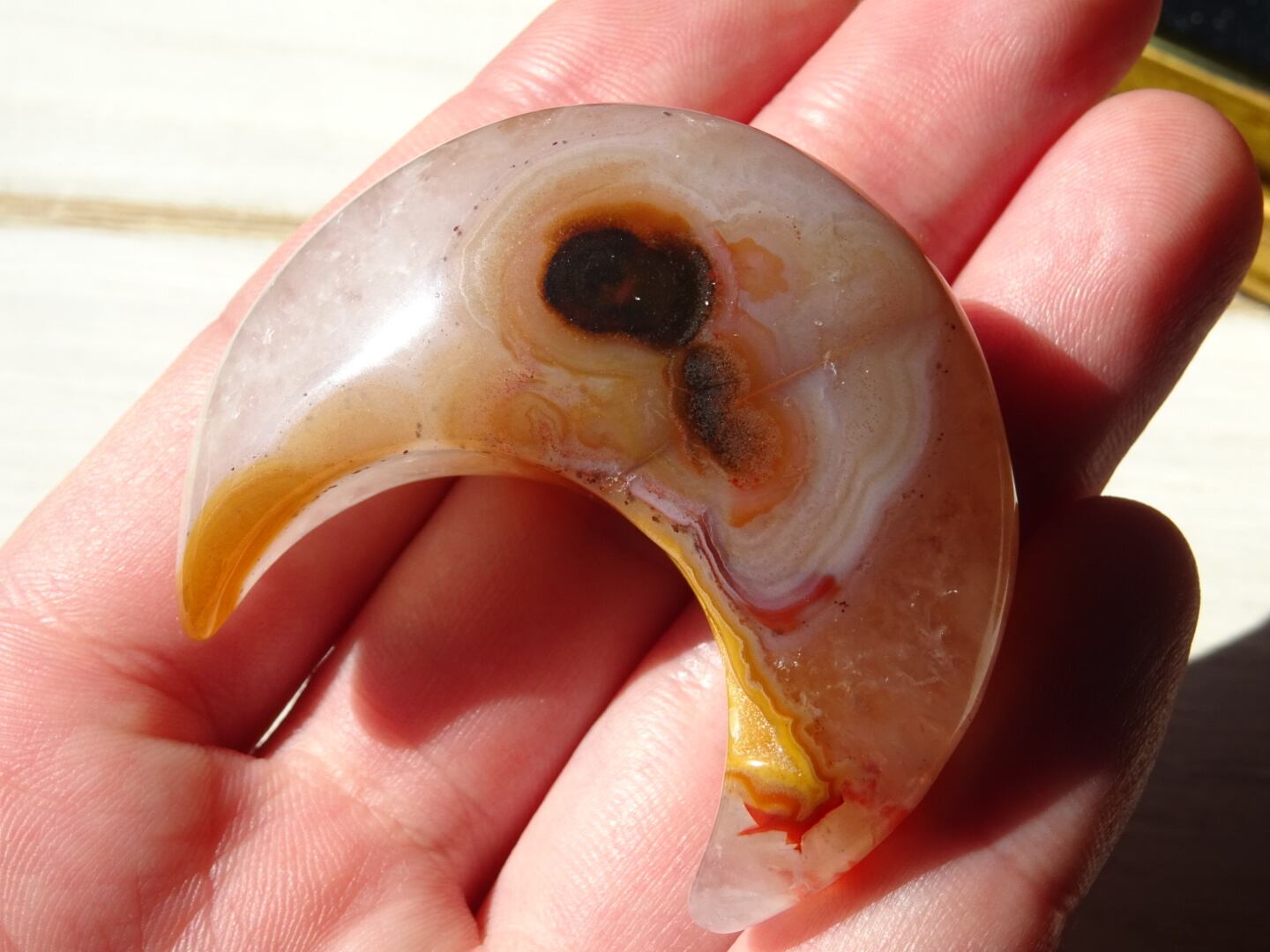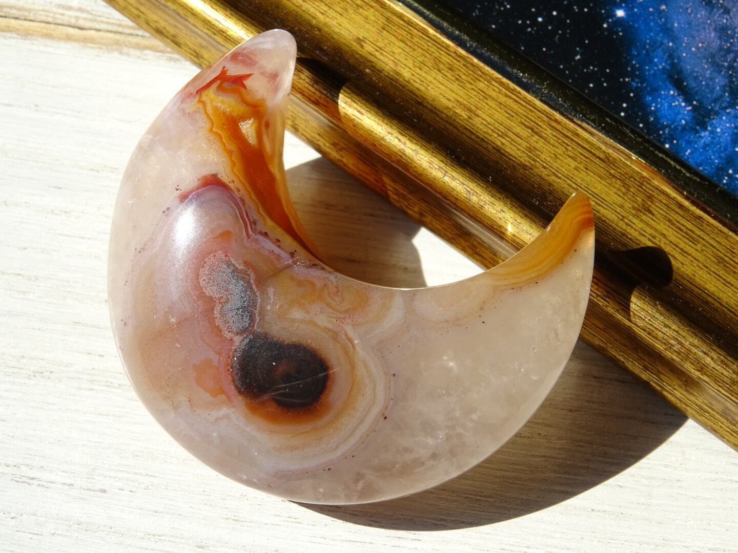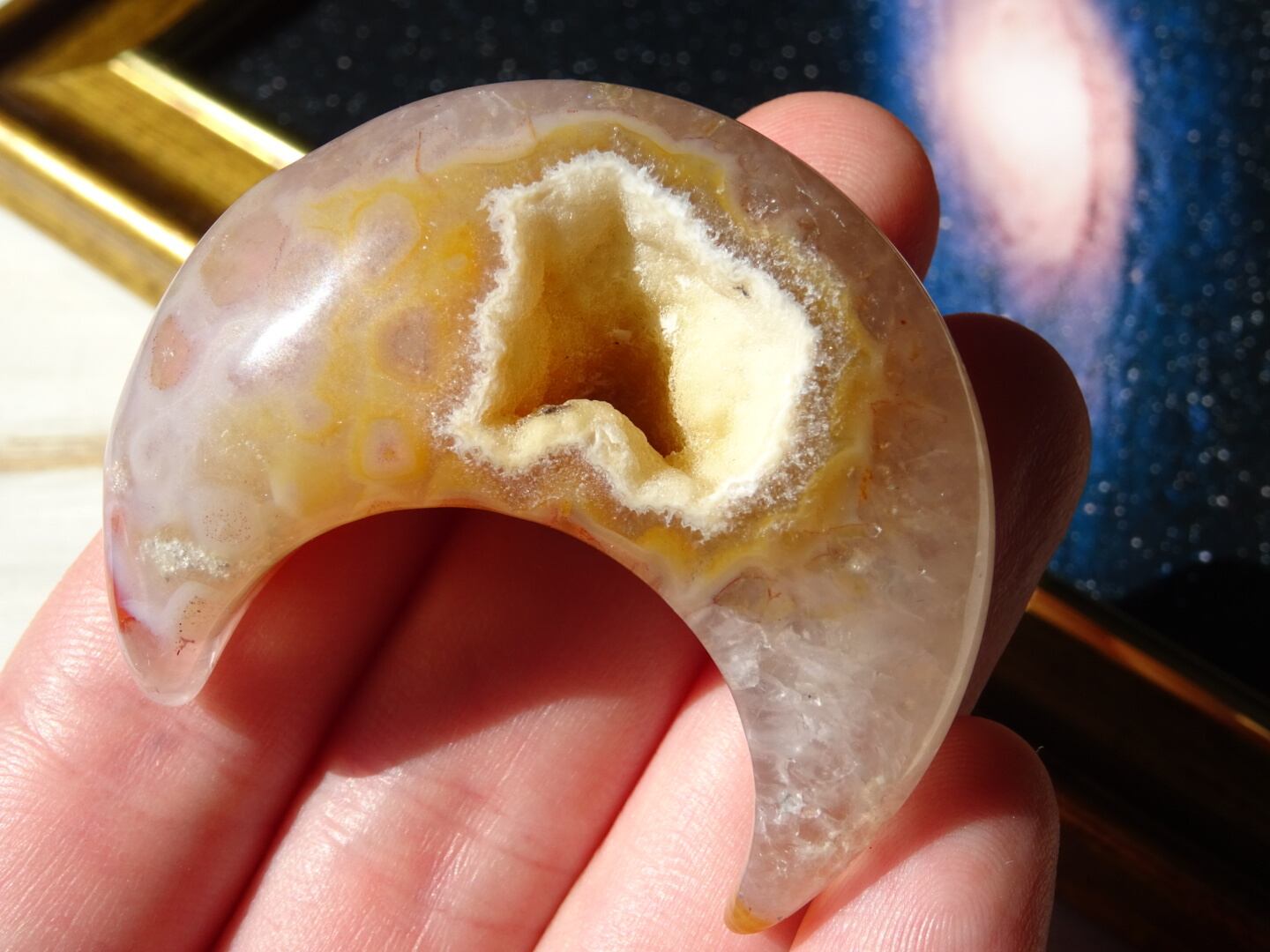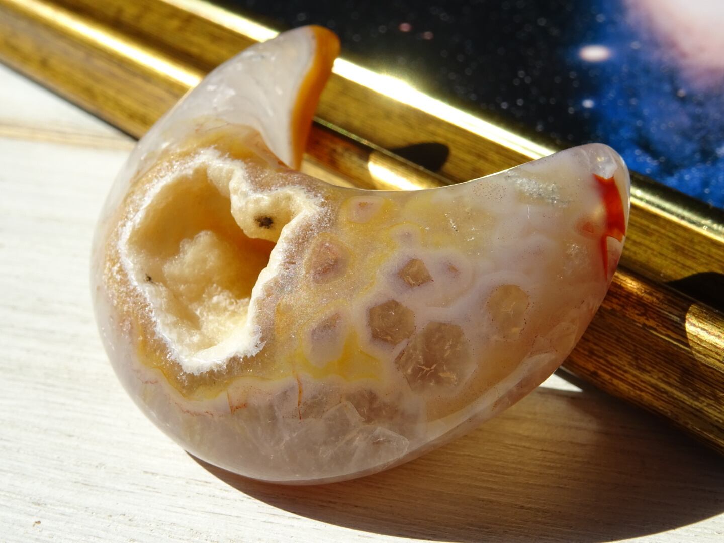 透明な抜け殻のような模様が可愛いアゲートムーン。ぽっかり空いた面白い質感のジオード(とても微細にきらきらしています)は側面まで洞窟のようにつながっています。レッド~イエローなどの成分も素敵。内側に幻想的な世界を広げたアゲートのお月さまです。