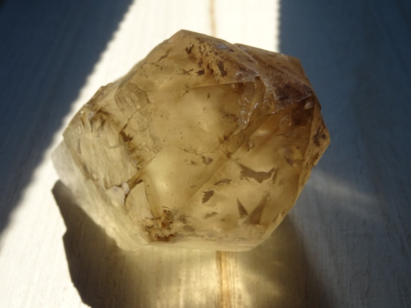 イエロー&スモーキーカラーをやわらかに広げた天然シトリン(非加熱です)。ゴツゴツと迫力のあるカテドラルタイプで、根元はうっすらイエロー、ファセットは焦がしたようなブラウンになっています。ファセットには白い成分をたくさん内包しており、背面のクラックからは虹が。光の角度によってその他にもいくつかの虹が出ます。
