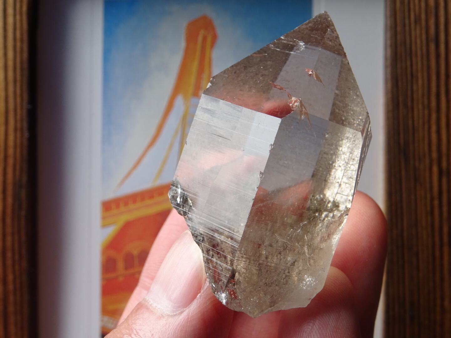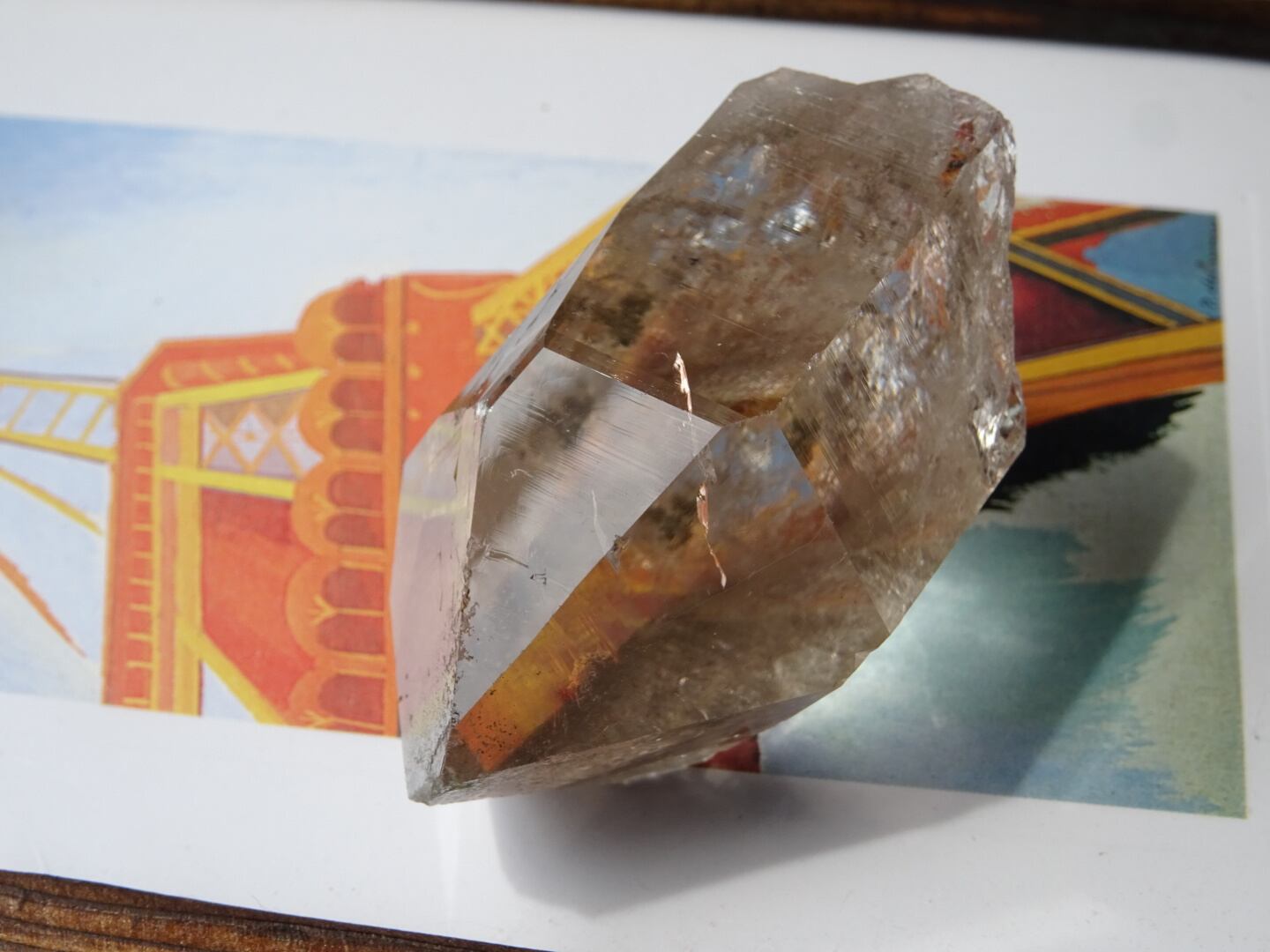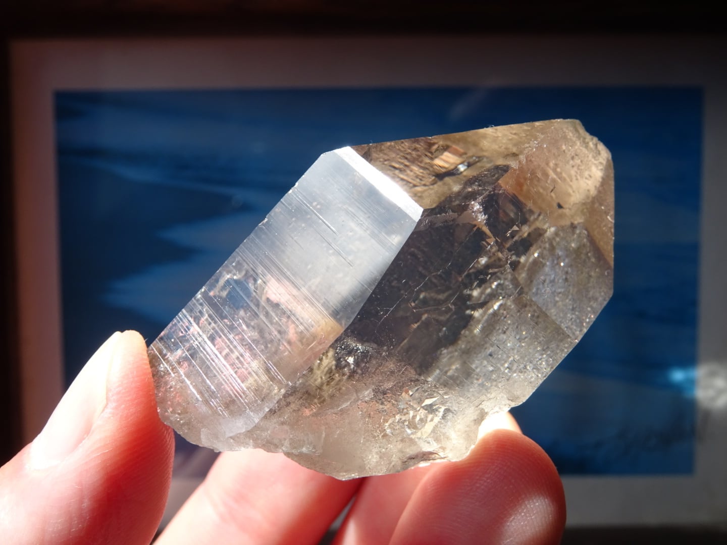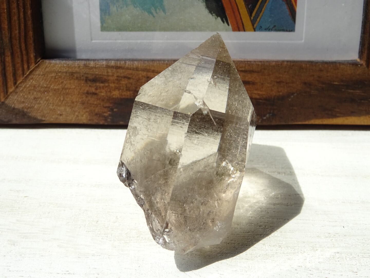 クリアグレーのスモーキーカラーが美しいアルプスクリスタル。コロンと自立してくれる愛らしいフォルムは正面に2つのファセットが向いている「ツーフェイス」でハンサム。とても繊細なリッジや照り照り&クリアな石肌が美しい子です。