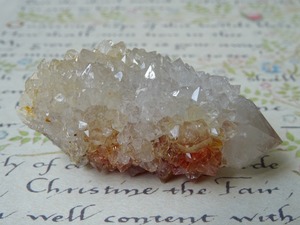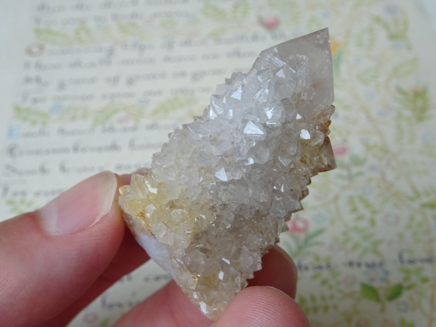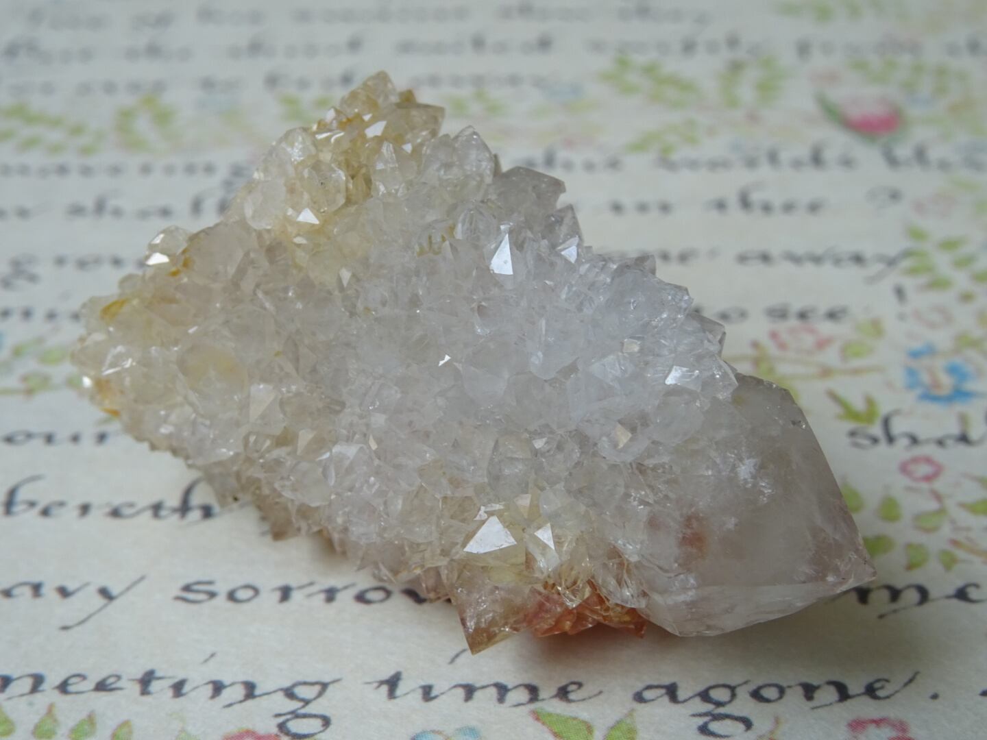 南アフリカ産、カクタス(サボテン)のきらきら結晶が美しいスピリットクォーツ。綺麗な六方晶系のクリスタルを微細な結晶たちが覆っています。やさしいホワイトの色合いをしていますが、部分的にリモナイトによってブラウン~ゴールドになっているのもチャームポイント。