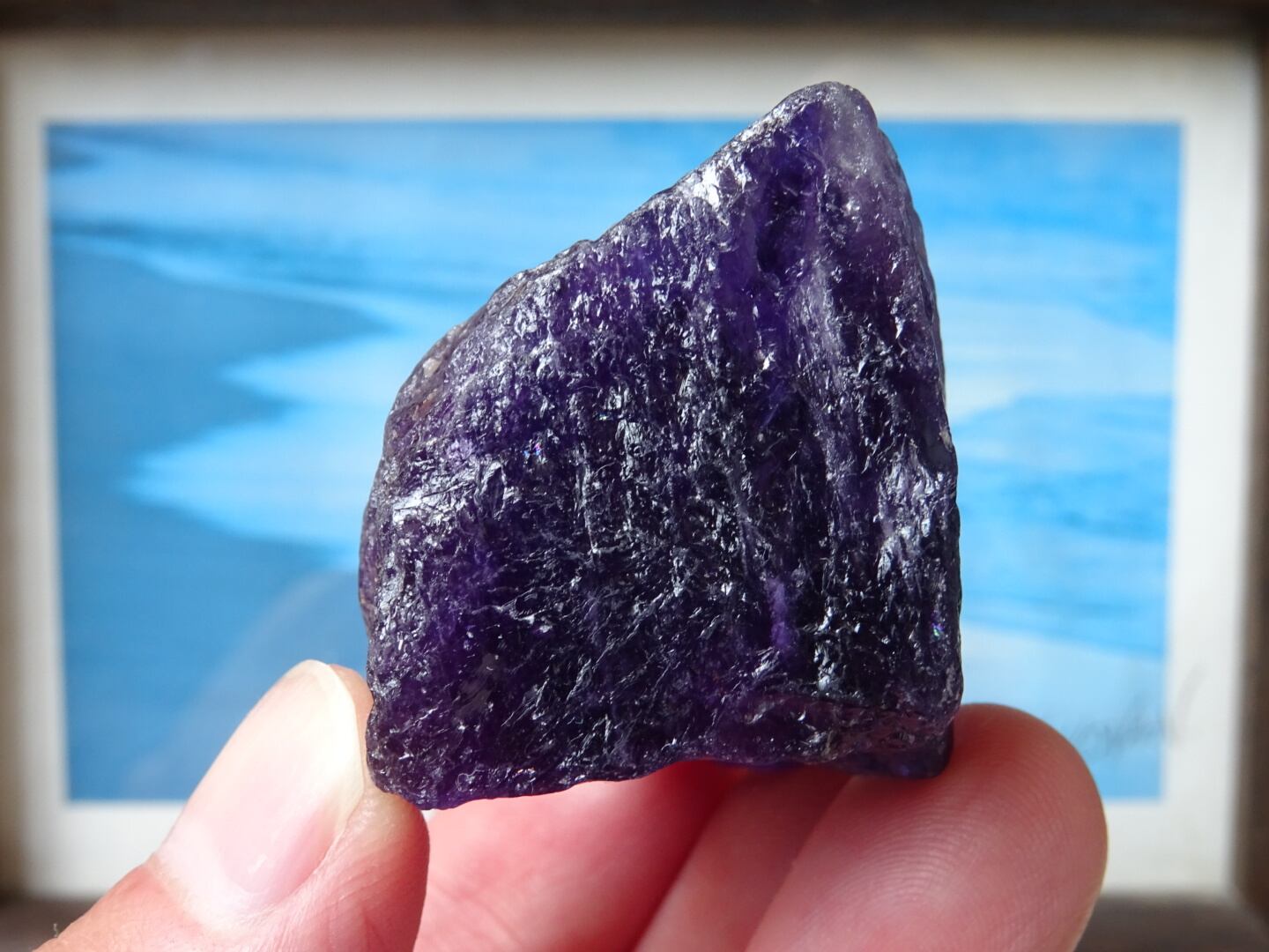 おおむね暗所では黒に近いパープルに見えます。原石によってサイズや暗所・明所での色の出方が異なるので、どうぞフォトでご確認ください。