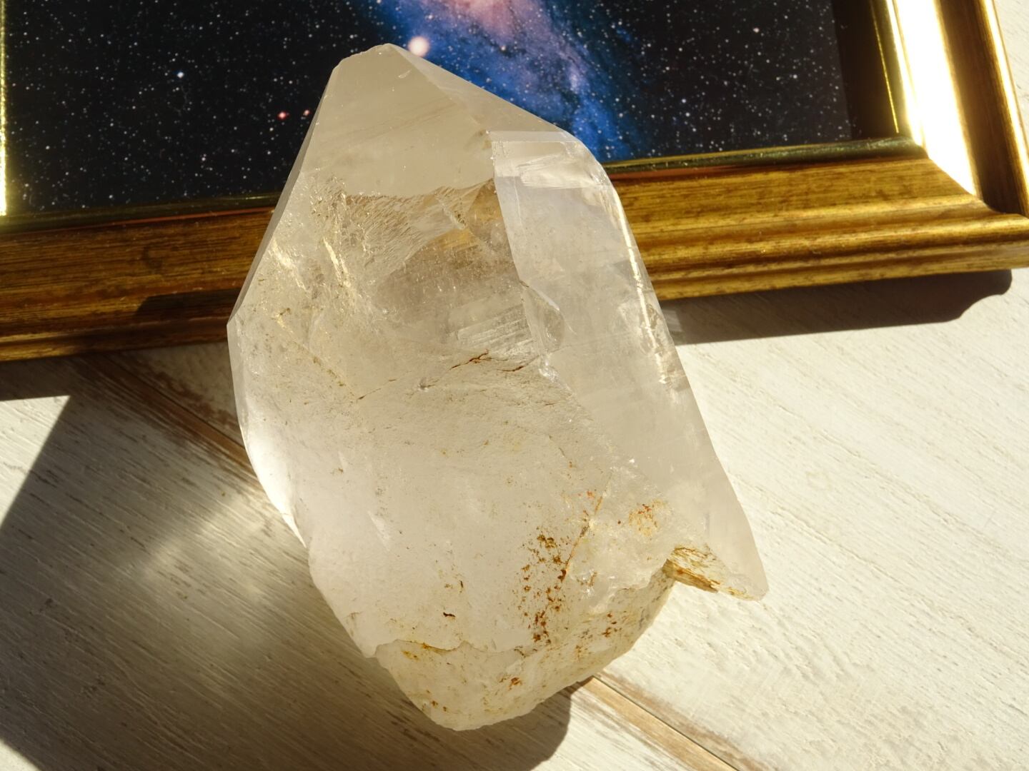 男性的で威風堂々たる佇まいで、まるでマスター存在がそのままクリスタルになったよう。ショップにやってきた時にはなかった場所に虹が出ていますので、石も目覚め始めているんだなぁなどと感じていました。