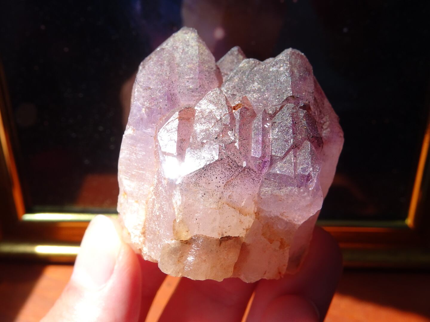 いくつかの結晶たちが結合し合ったようなフォルムをしており綺麗に自立してくれます。どこか赤みがかっているような渋いパープルの色合い、付着しているオレンジレッドや、ファセットのヘマタイトの粒々もとても素敵な1点です。