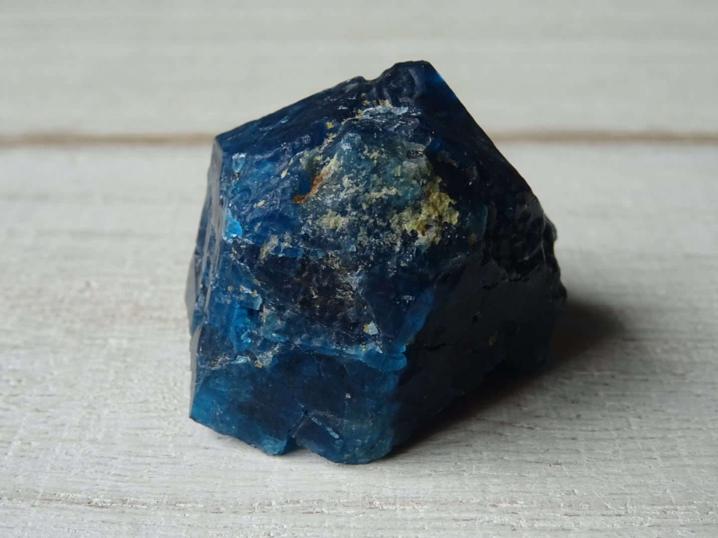 ブルーアパタイトの原石は色にムラがあったり黒っぽい付着物が多かったりでクオリティの高いものって少ないのですが、こちらはマットな質感の石肌、そしてインディゴ&ところどころライトブルーの色合いが美しい子です。あと、一番萌えたポイントはこのちょこんと自立する姿だと思います(笑)可愛くもありカッコよくもあり。