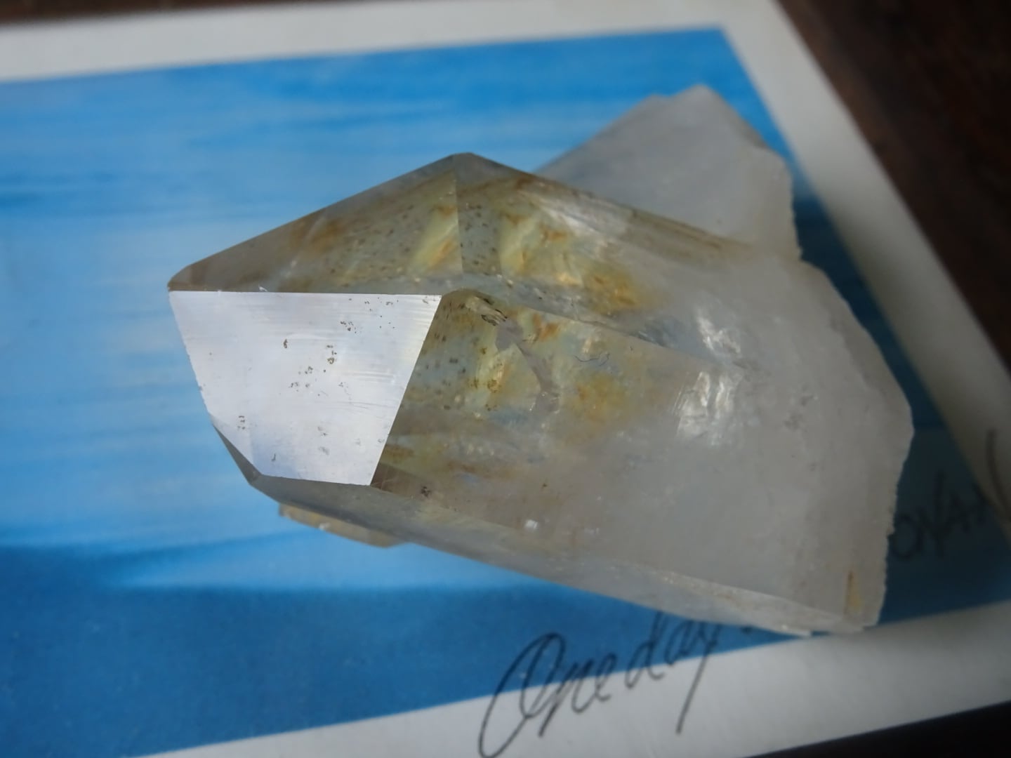 2つの美結晶がクロスするような姿で綺麗に自立してくれます。大きな方の結晶は無研磨ですが磨かれたように照り照りのファセット。もう一つの結晶は非常に小さいのですがレコードキーパーを浮かべています。接合している部分のゴールドもよいアクセント、裏面はほぼ全面が細かにセルフヒールドしています。