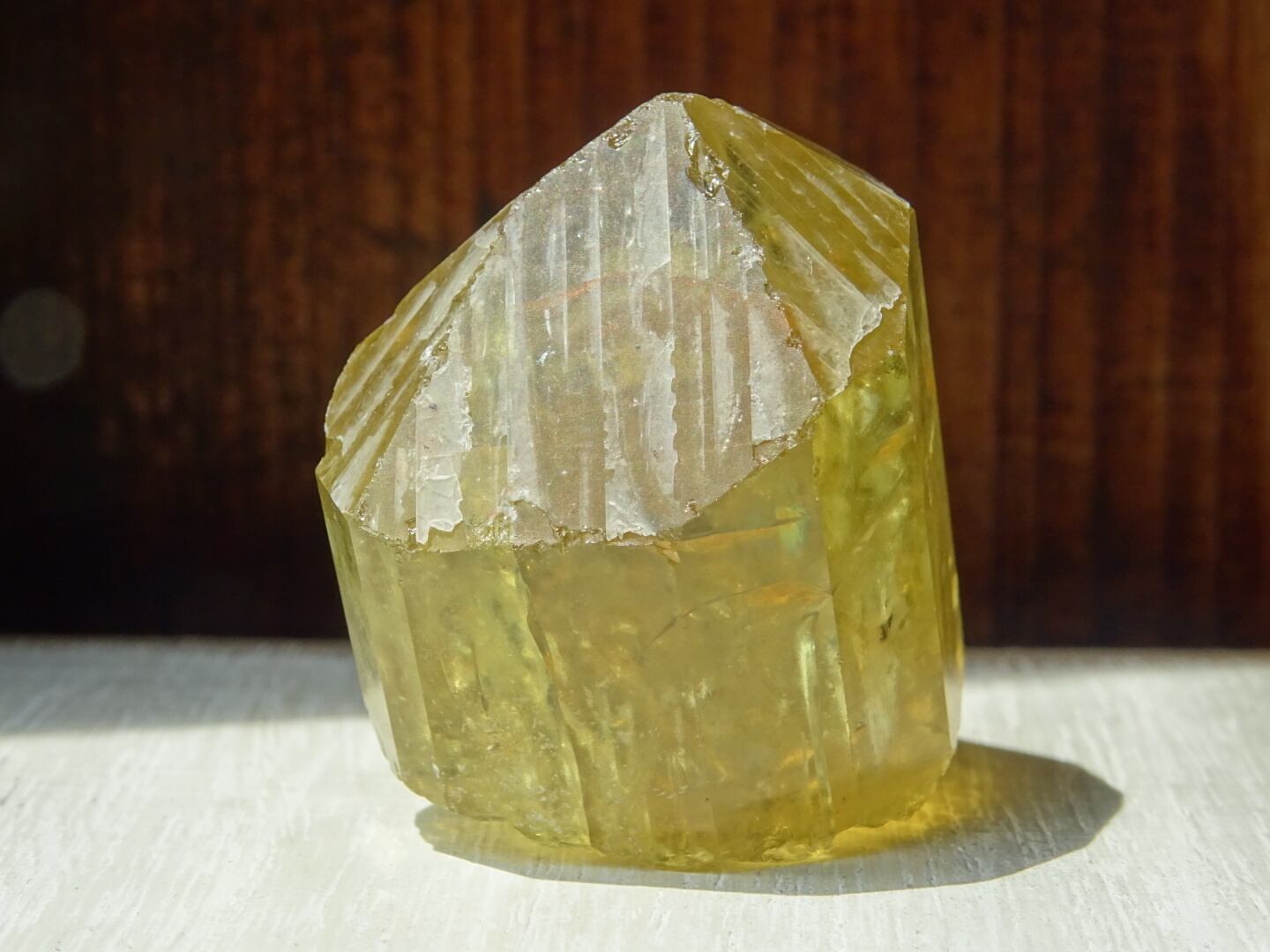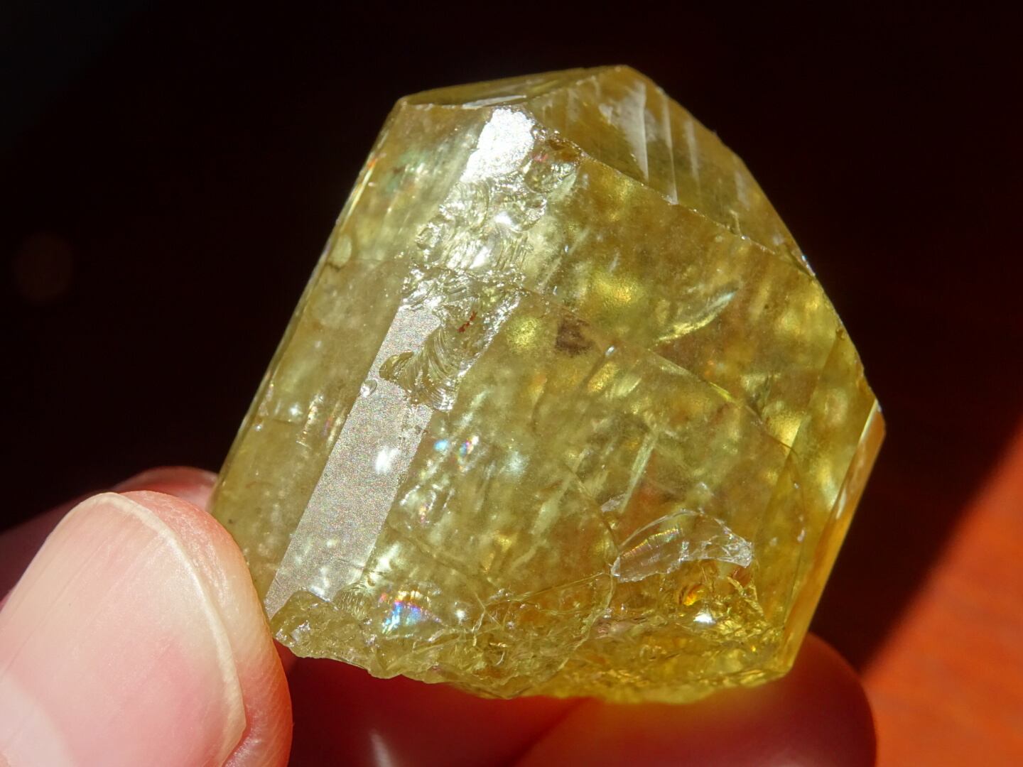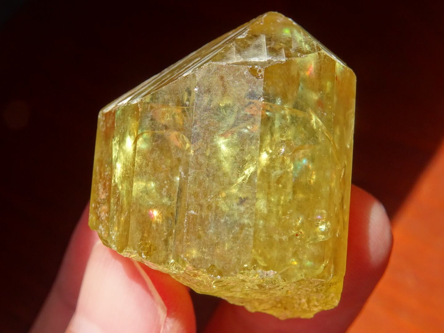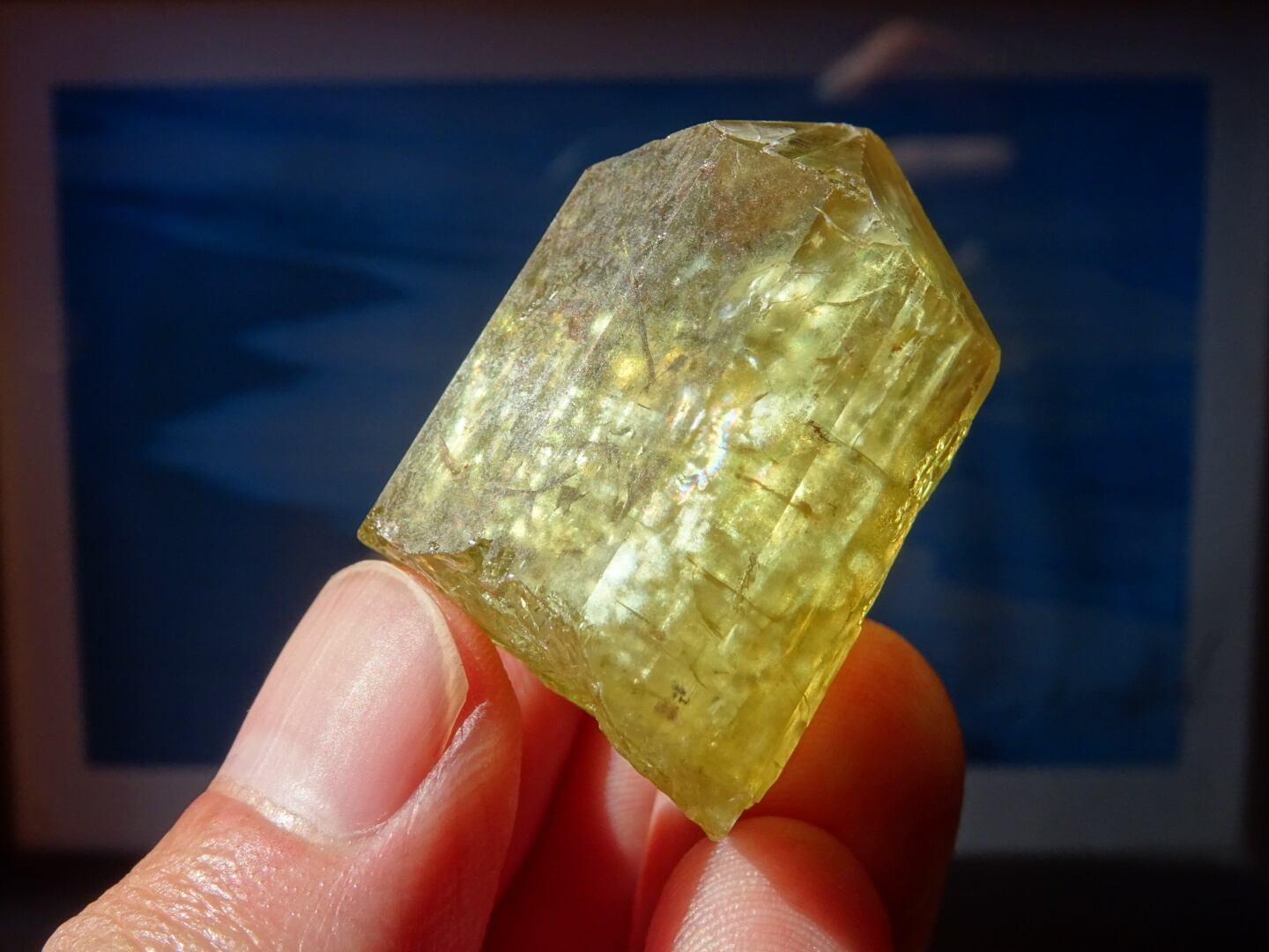 写真ではなかなか光や虹をとらえられないのですが、内側で爆(は)ぜるような強い黄色の光、「これから増えていくだろうなー」と思う虹たちの世界が本当に美しいです。メキシコのイエローアパタイトは掘り尽されたと聞いたことがありますが、希少なしっかりサイズの美結晶。日々の素晴らしいパートナーとなってくれると思います。