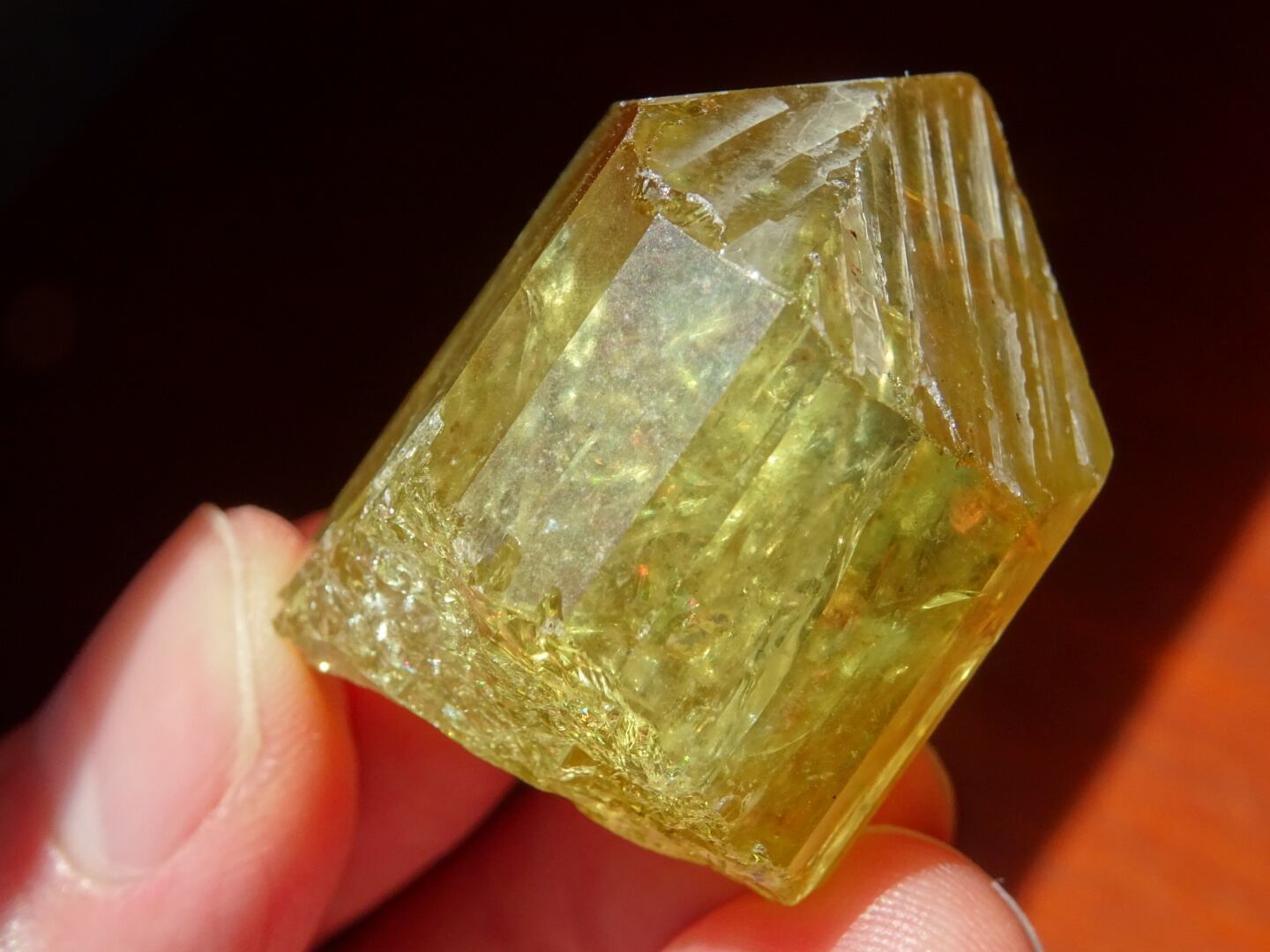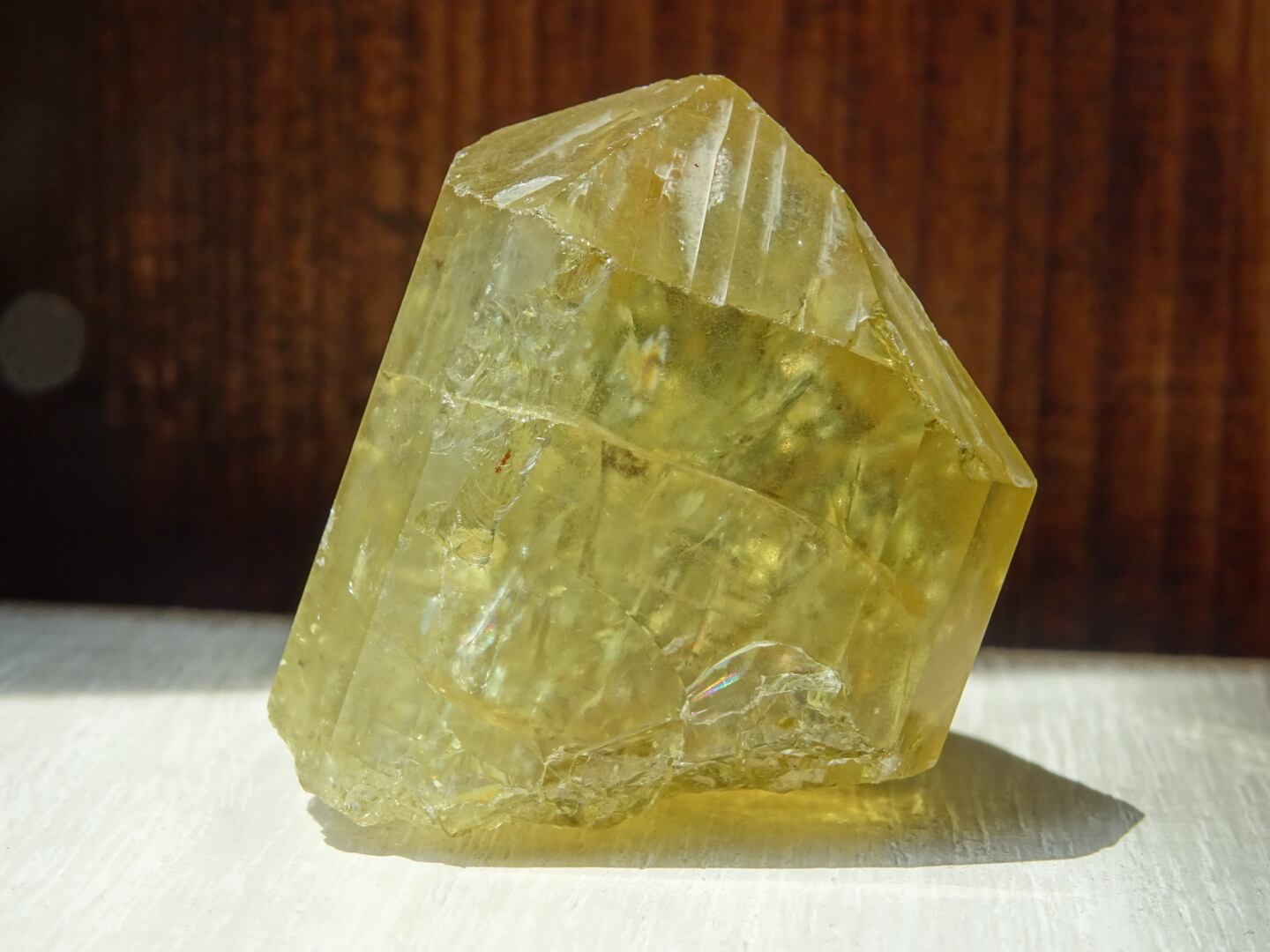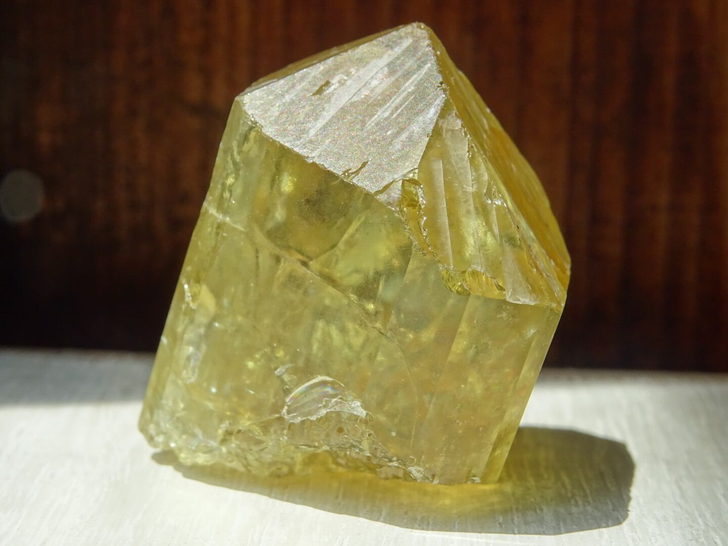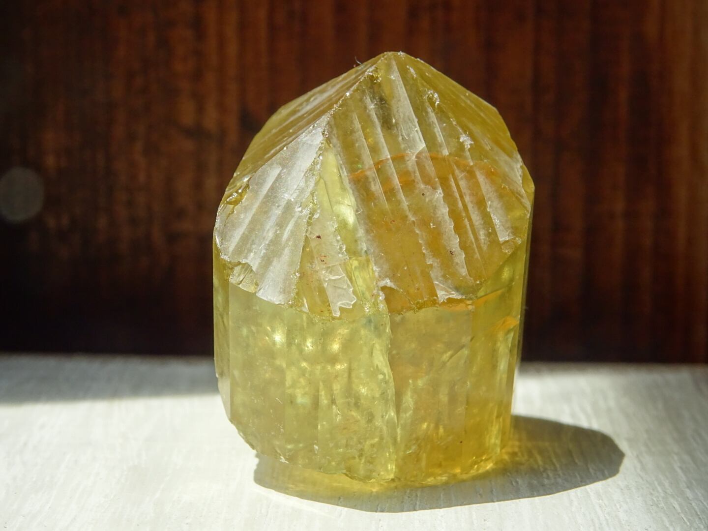 写真ではなかなか光や虹をとらえられないのですが、内側で爆(は)ぜるような強い黄色の光、「これから増えていくだろうなー」と思う虹たちの世界が本当に美しいです。メキシコのイエローアパタイトは掘り尽されたと聞いたことがありますが、希少なしっかりサイズの美結晶。日々の素晴らしいパートナーとなってくれると思います。