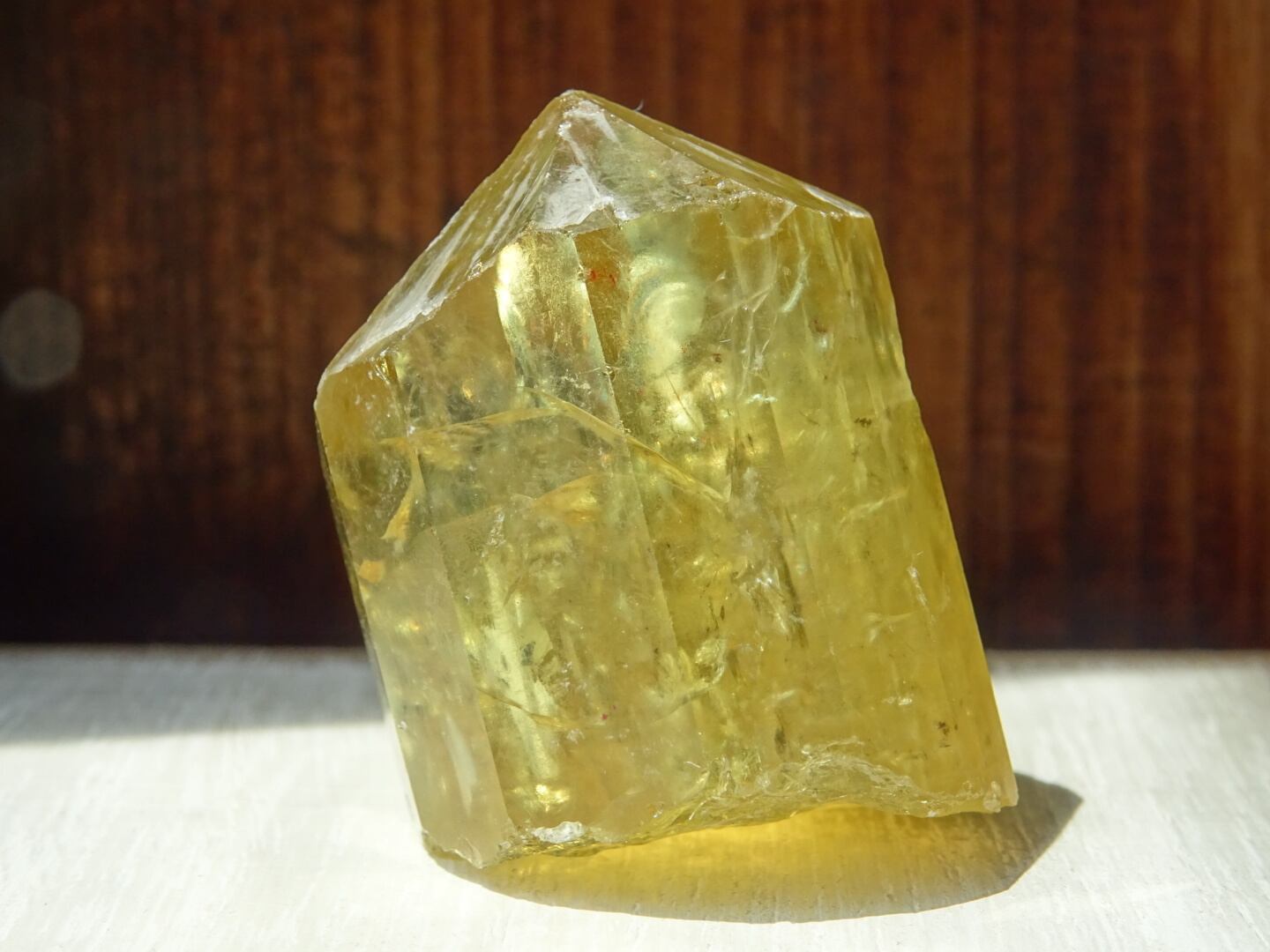 内側のクラックから「黄色の炎」と呼びたいきらめきがたくさん反射して美しいです。また、写真にはほとんど映せていないのですが、クラックからは淡い虹が浮かびます。希少なしっかりサイズ。底面も美しいイエローになっており、整ったフォルムで自立してくれるハイクオリティなイエローアパタイトです。
