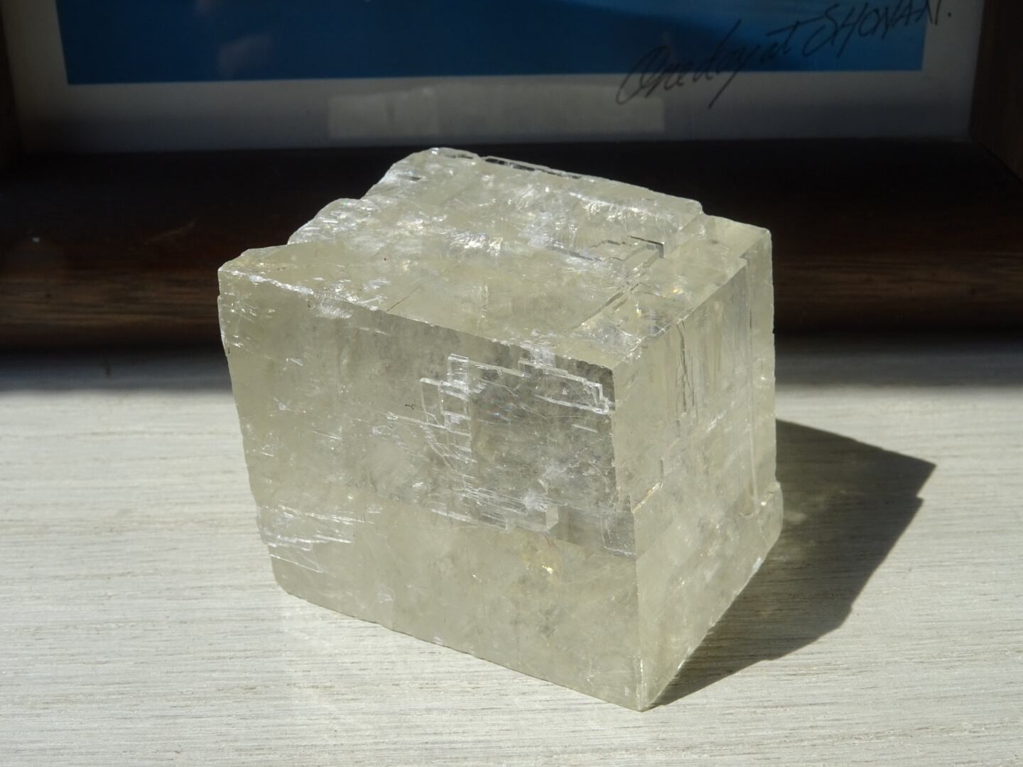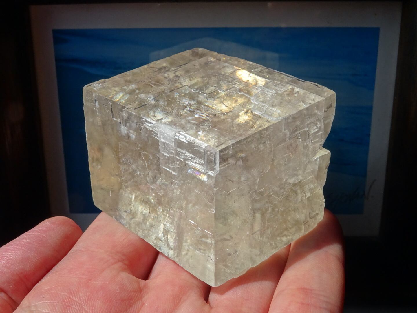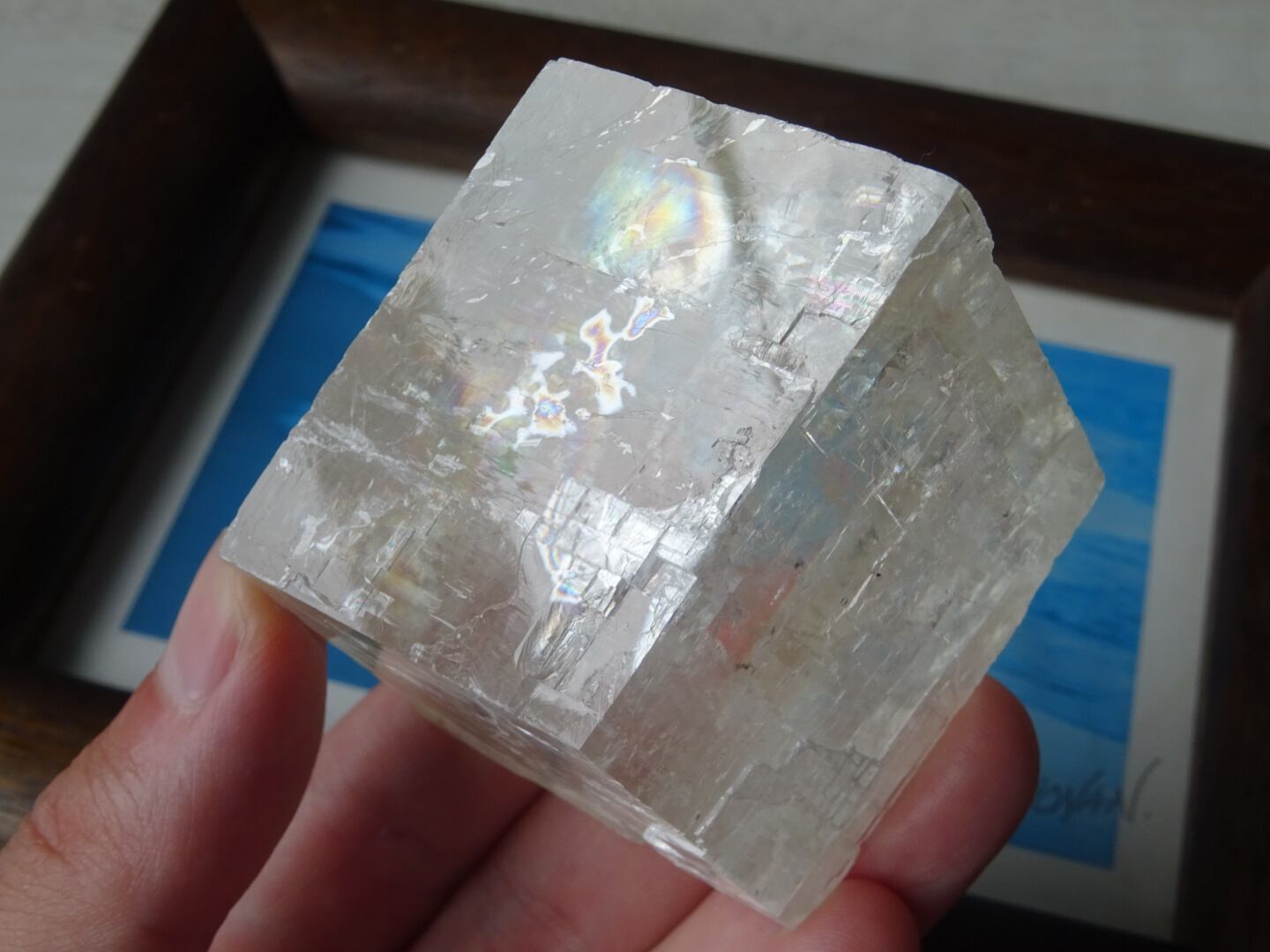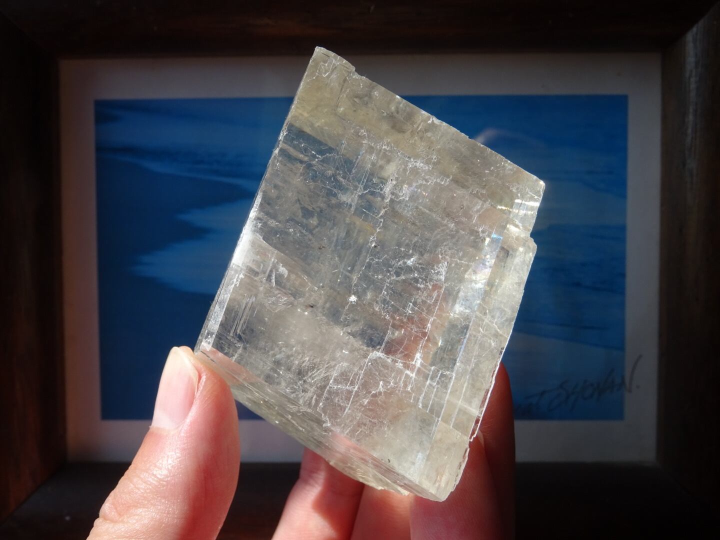 うっすらイエローがかった結晶はなんと全面から虹が覗えます。面によってはかなり広範に虹のプリズムが浮かび大変美しいです(なかなか上手く撮る事ができなかったのですが、光源や角度でさまざまな表情を魅せてくれます)。内側のレイヤー、クラックに反射するイエローの世界もとても美しいです。