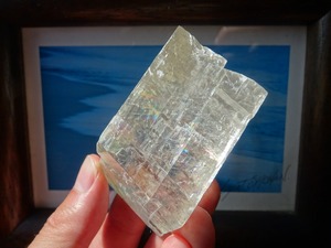 写真ではとても魅力をお伝えしきれないのですが。。こちらのカルサイトさん、本当にお綺麗です。結晶面によって見せてくれる内側の光景がちがうので、こねくり回しながら眺めてしまうのですが(笑)とりわけ反射しあうイエローの世界、そしてたくさんの虹たちに見惚れてしまいます。そして柑橘カラーなのでとても爽やか。