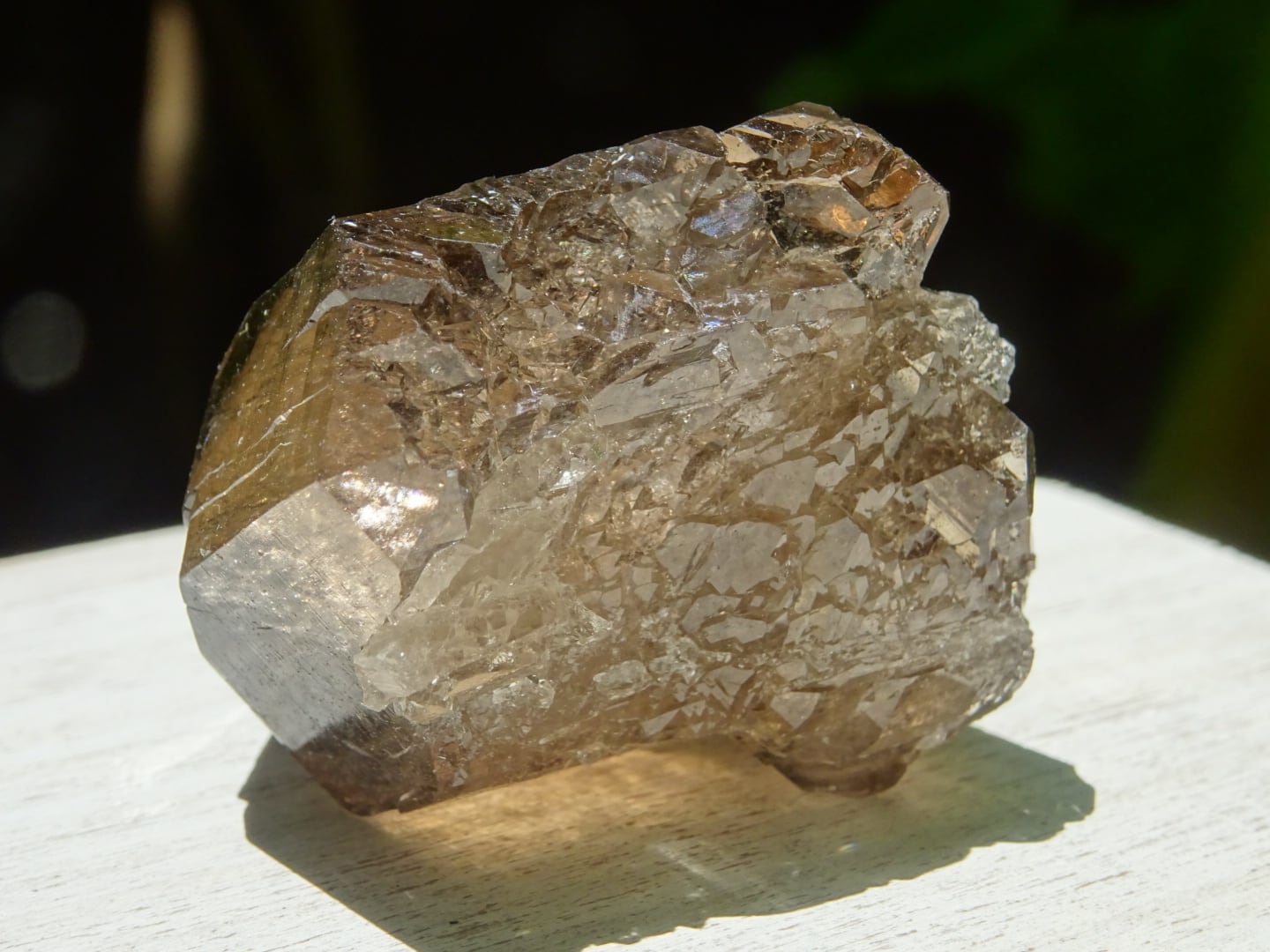 照りのある石肌は透明度もあり、コニャックカラーが美しいです。隣と根元に接面するように子どもポイントたちが共生しており、コロンと自立する姿が愛らしいです。また、底面は非常に綺麗に全面がセルフヒールド(再結晶)しています。