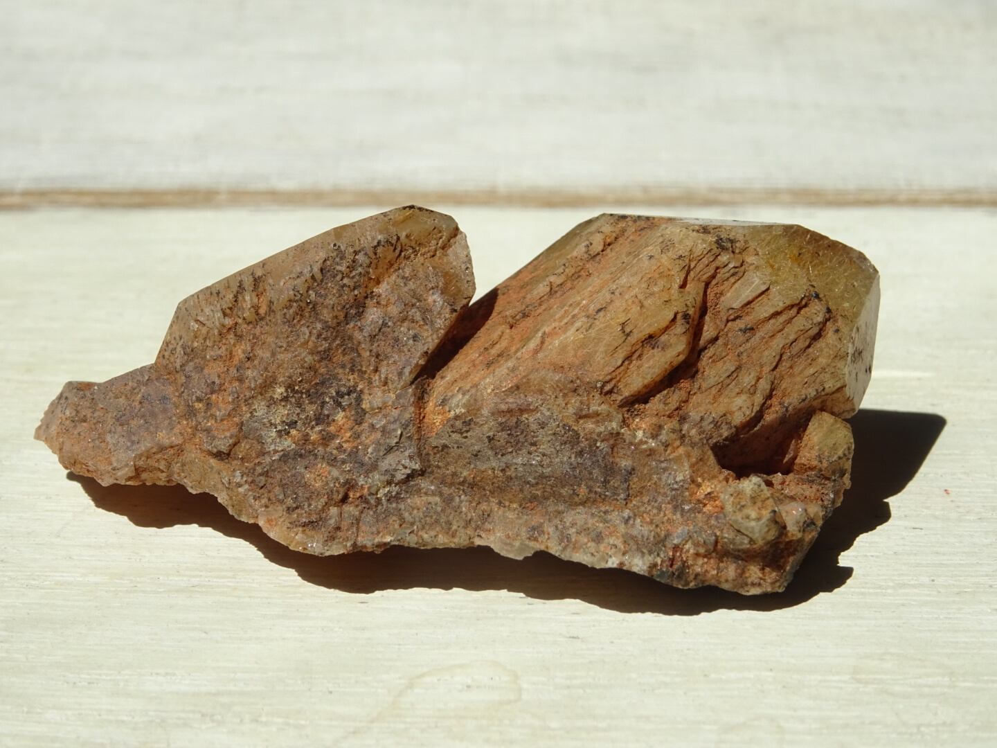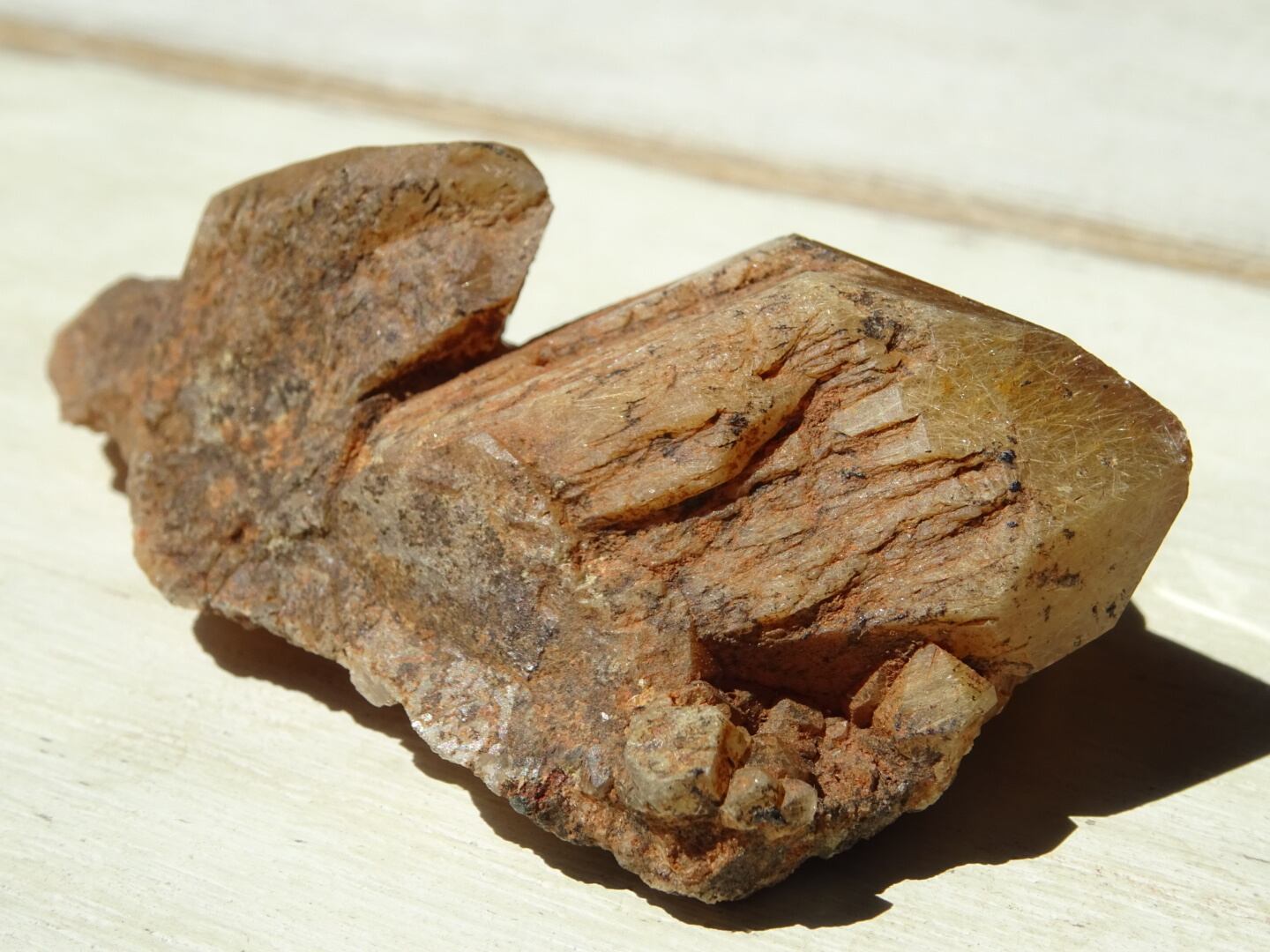 魅力は何と言ってもこのブラウンゴールドの姿。ザギの石らしく、結晶の中にルチルを溢れんばかりにたたえています。また、涅槃仏のように(?)横たえた姿と、その麓に小さく綺麗に結晶しているポイントたちが可愛いです。