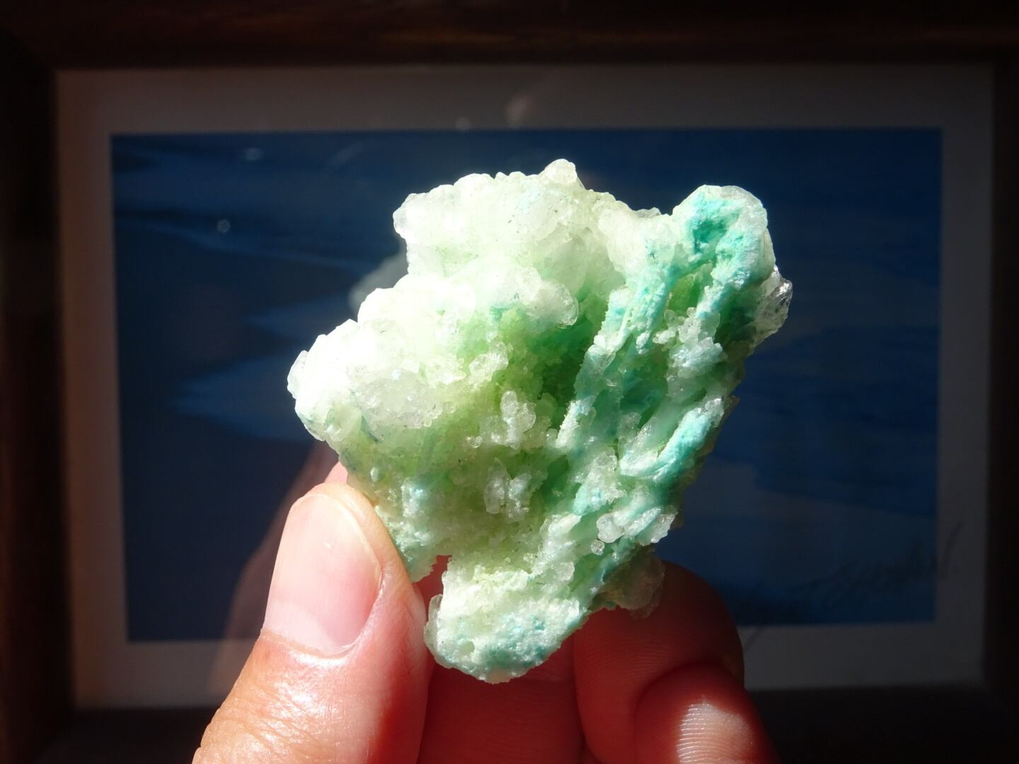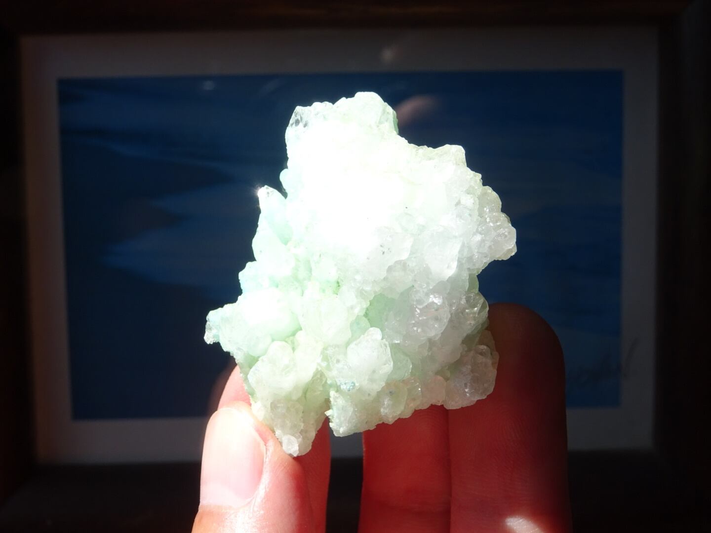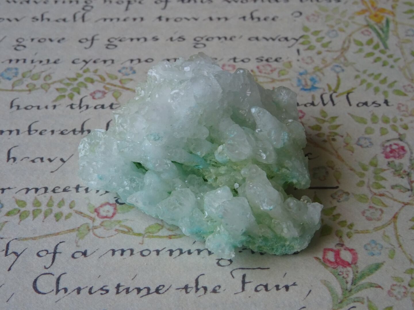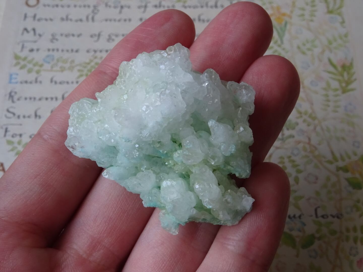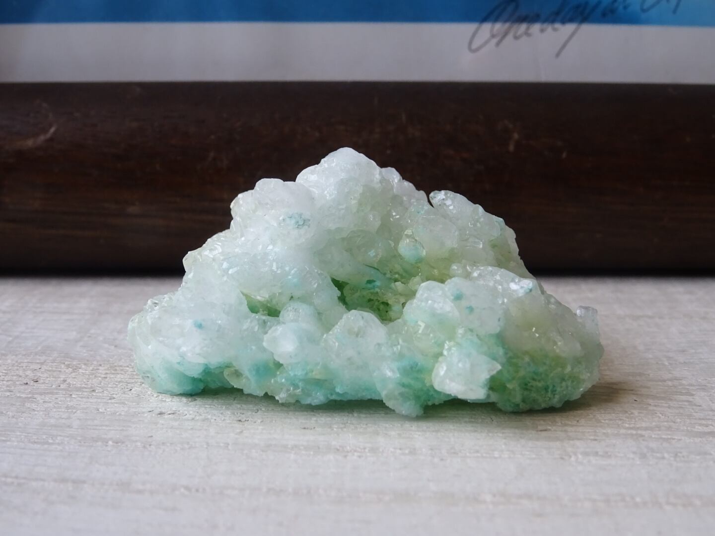 きらきらホワイトへ沁みこむようにグリーンが入ったカルサイトのクラスターです。細かに輝く結晶たちが美しく、ライトグリーン~ミントグリーンのお化粧が可愛いです。