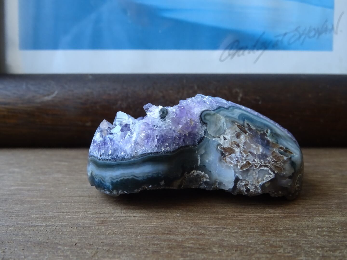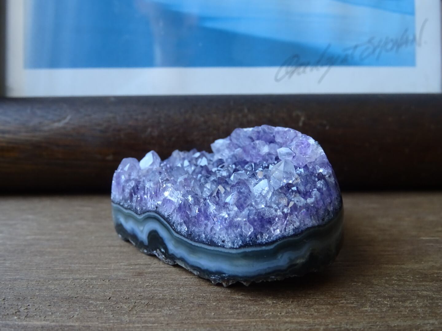 こちらはほんのりグレーがかったようなきらきらのパープル、リボンを結んだような母岩部分が何よりのチャームポイントです。グレー~グリーン~クリアな層で装飾されています(そこから横に生えているアメジストたちの彩りも素敵)。