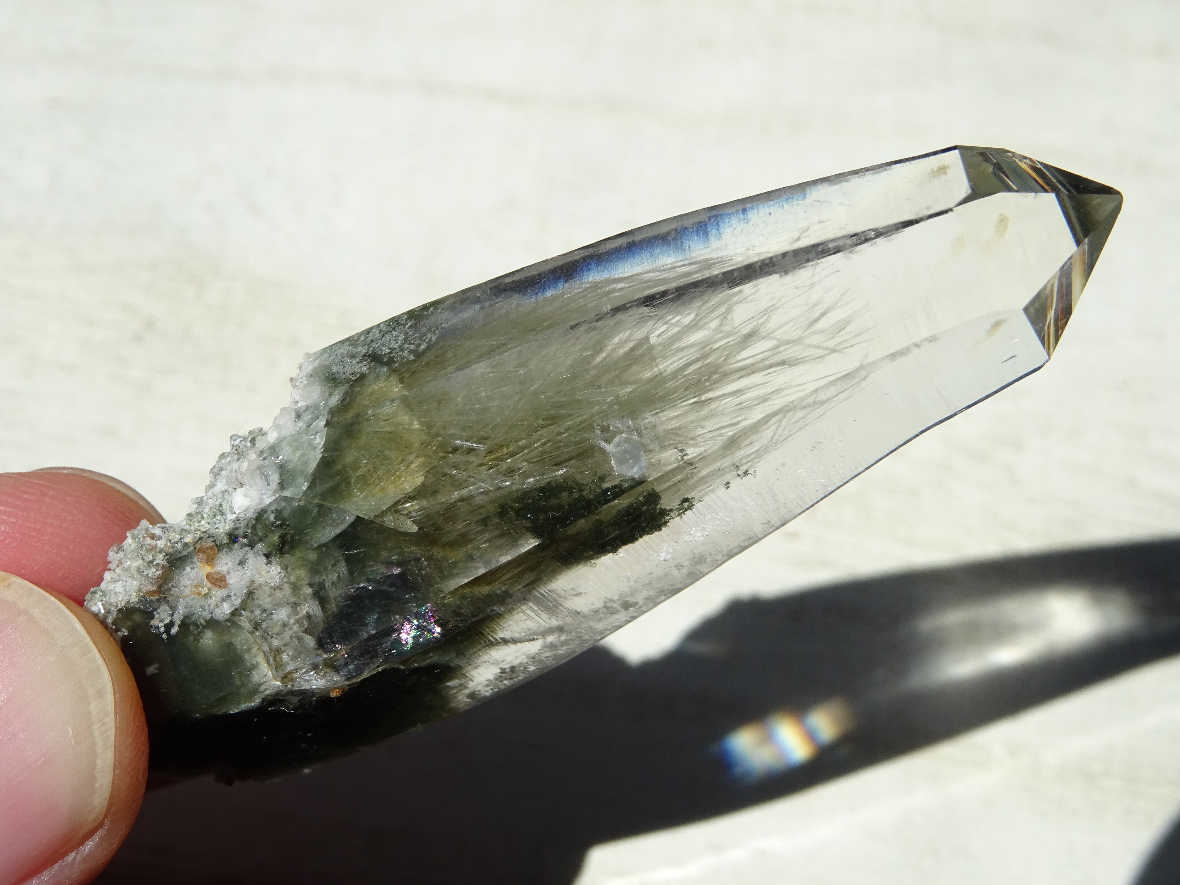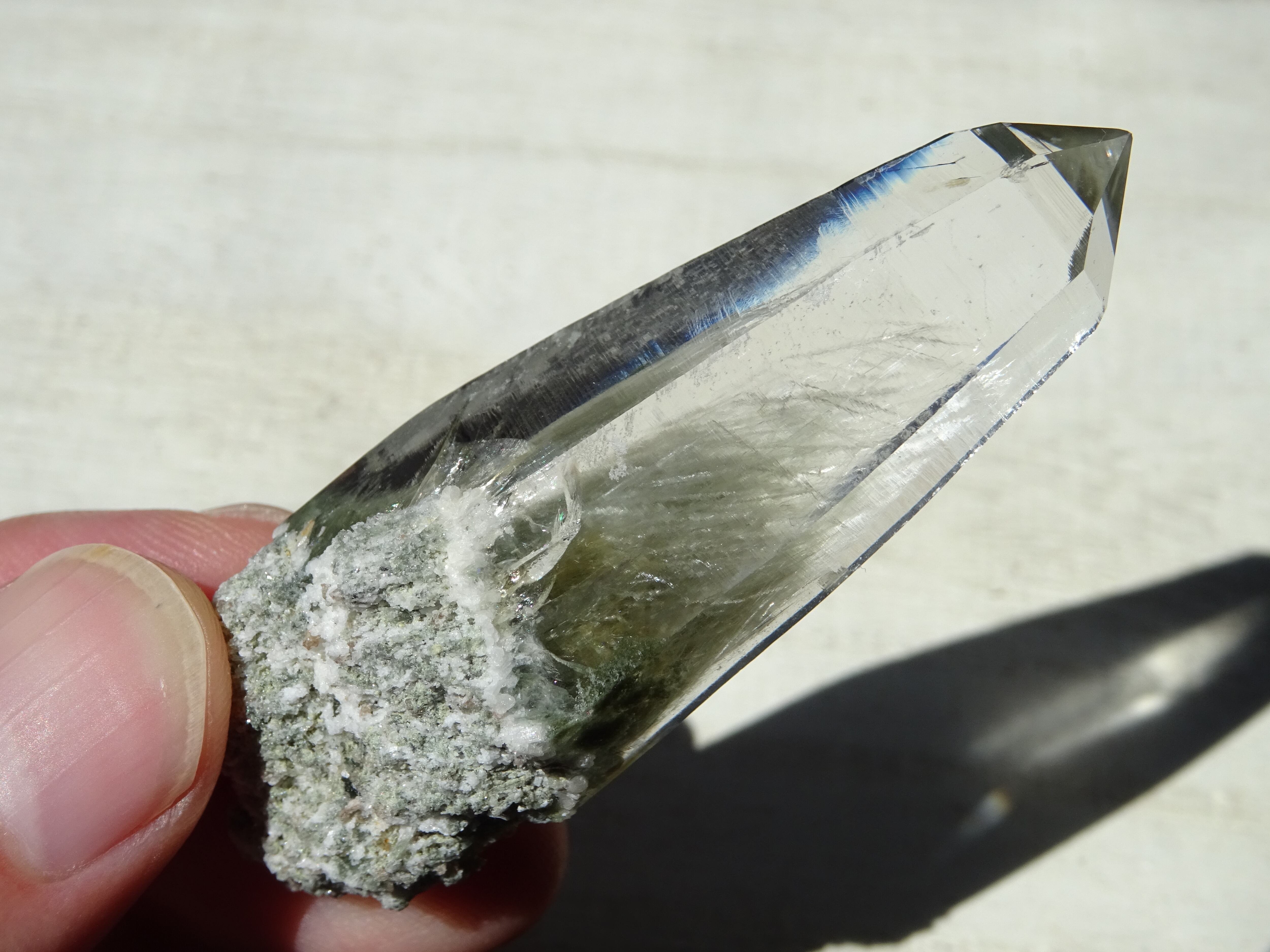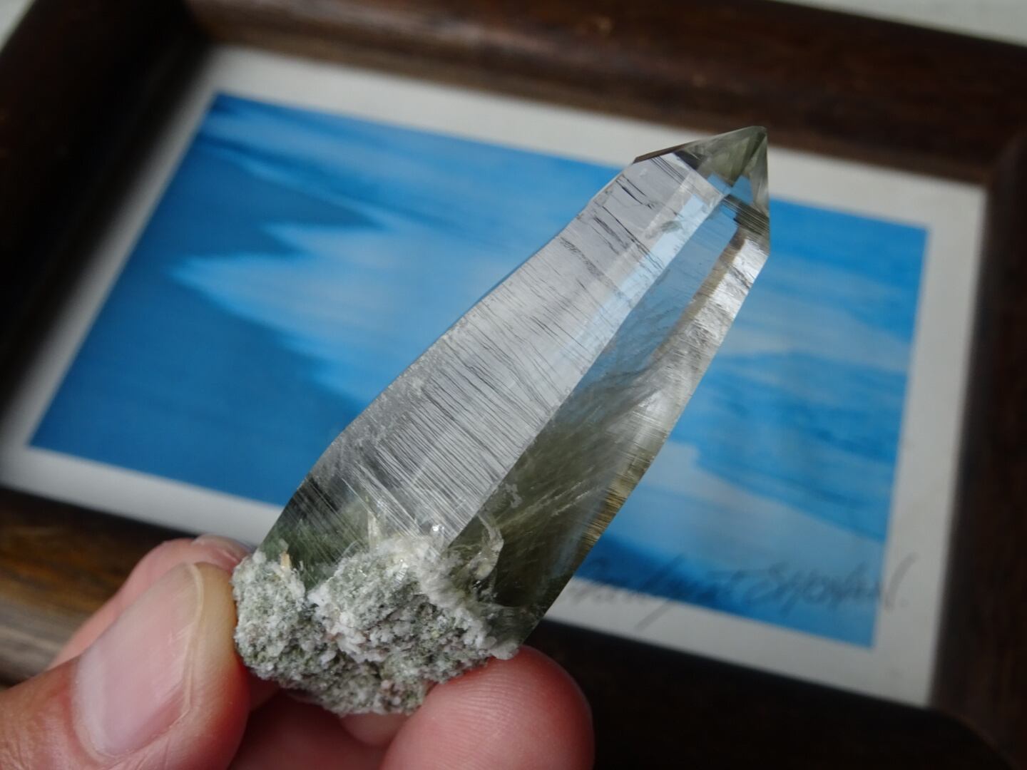 根元部分に苔のようなモスグリーンのクローライトが入っているのですが、感動してしまうのはその上の、白い羽毛状の結晶。