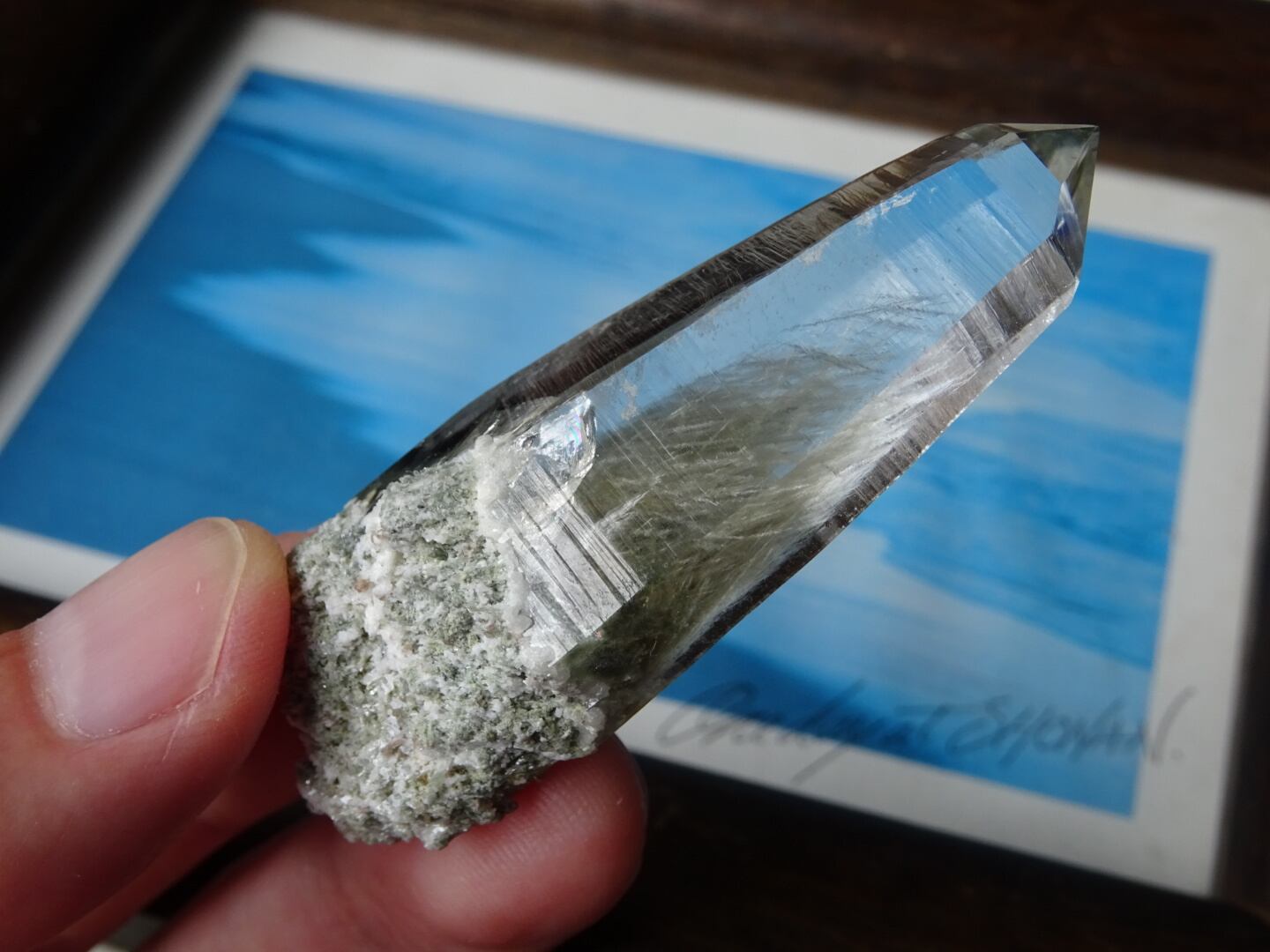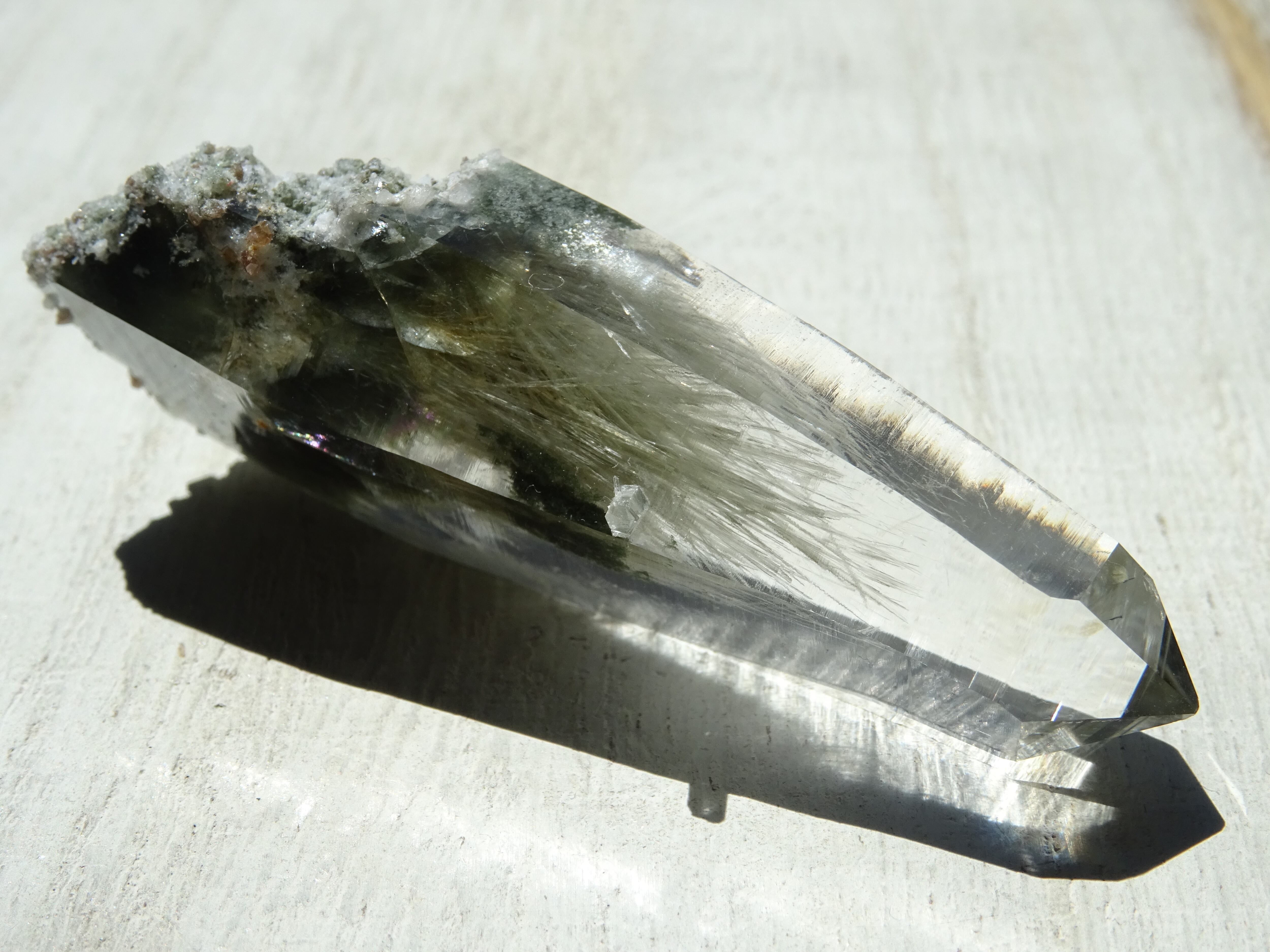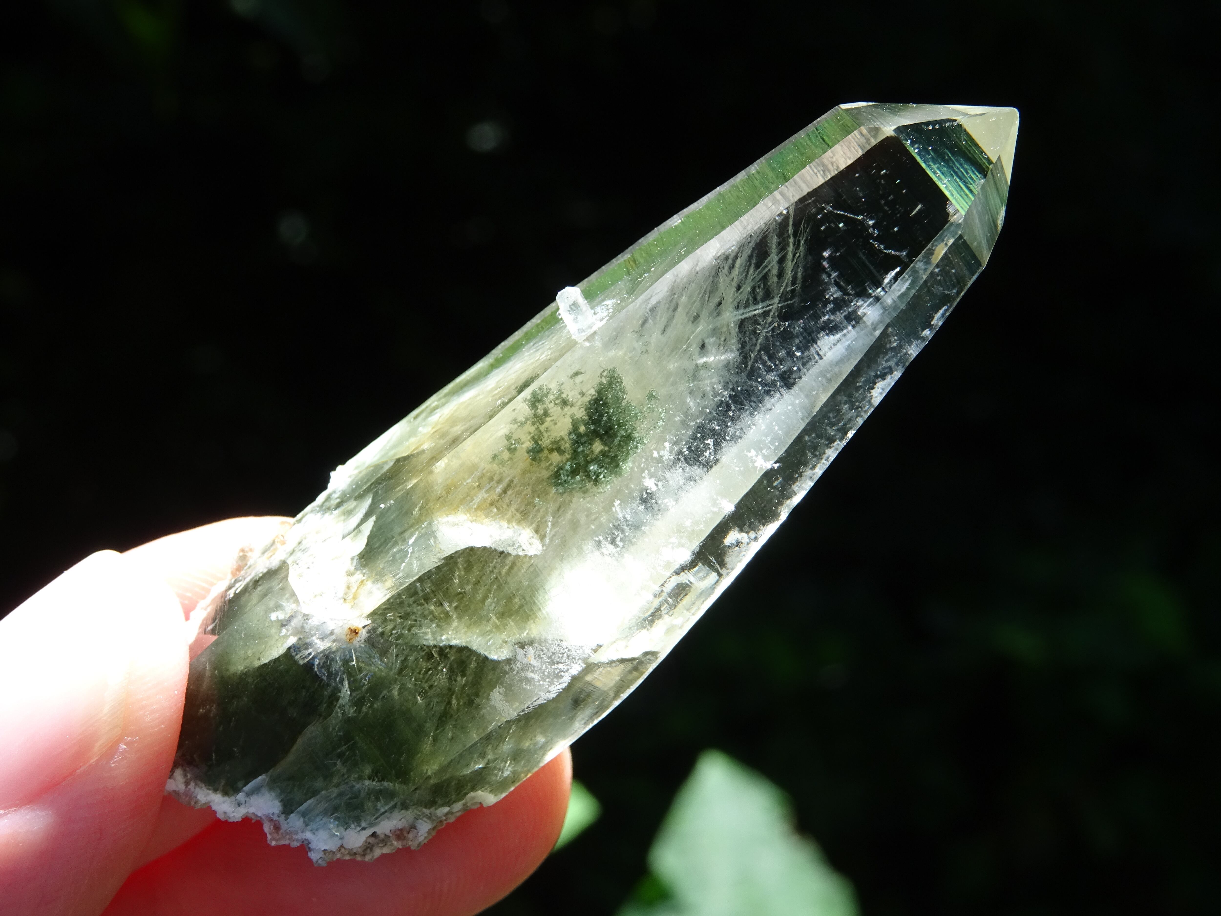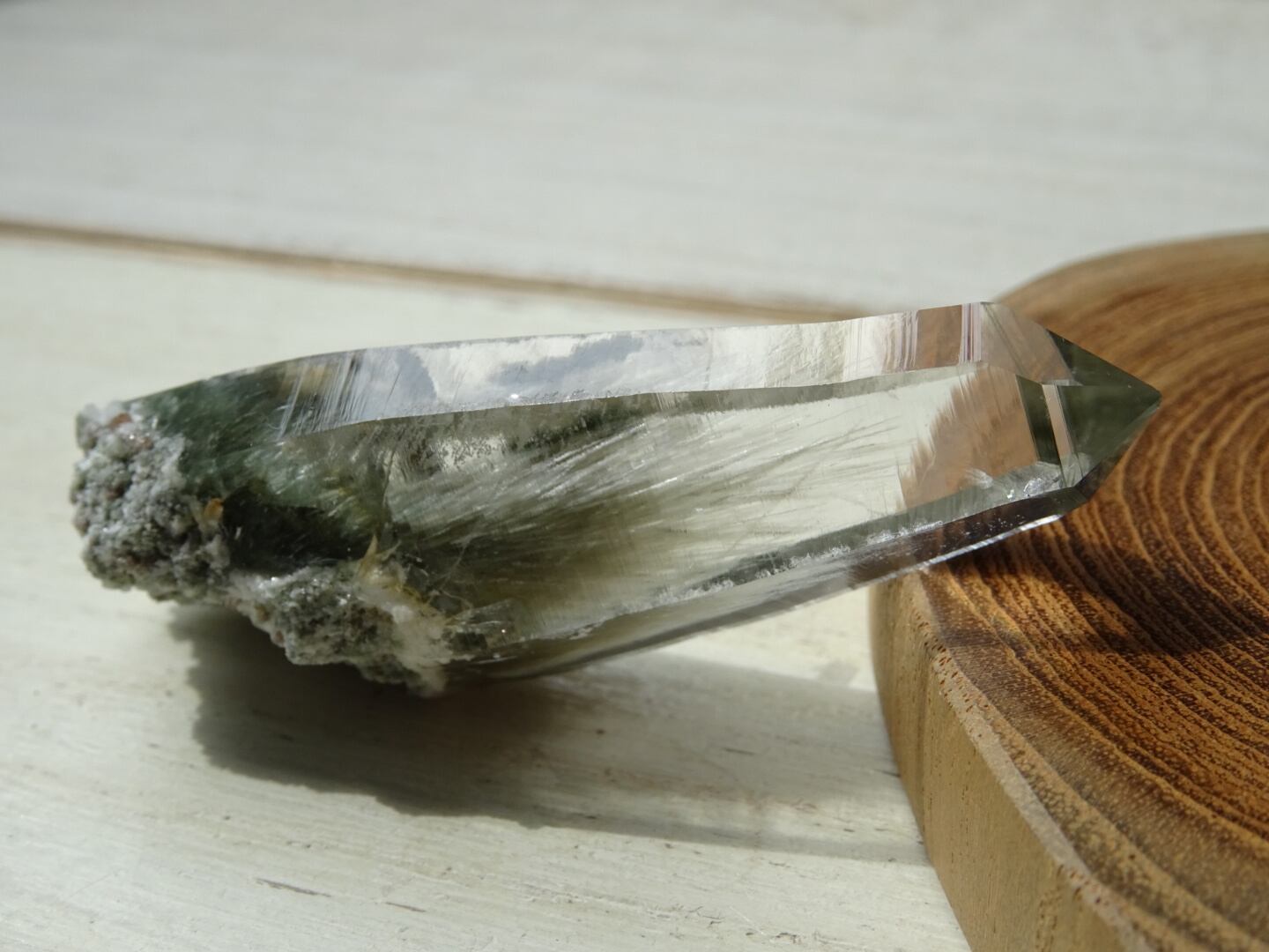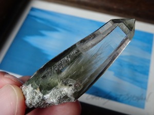 クリスタルの上部までここまで綺麗に伸びた角閃石は珍しく、美しさに目を奪われます。