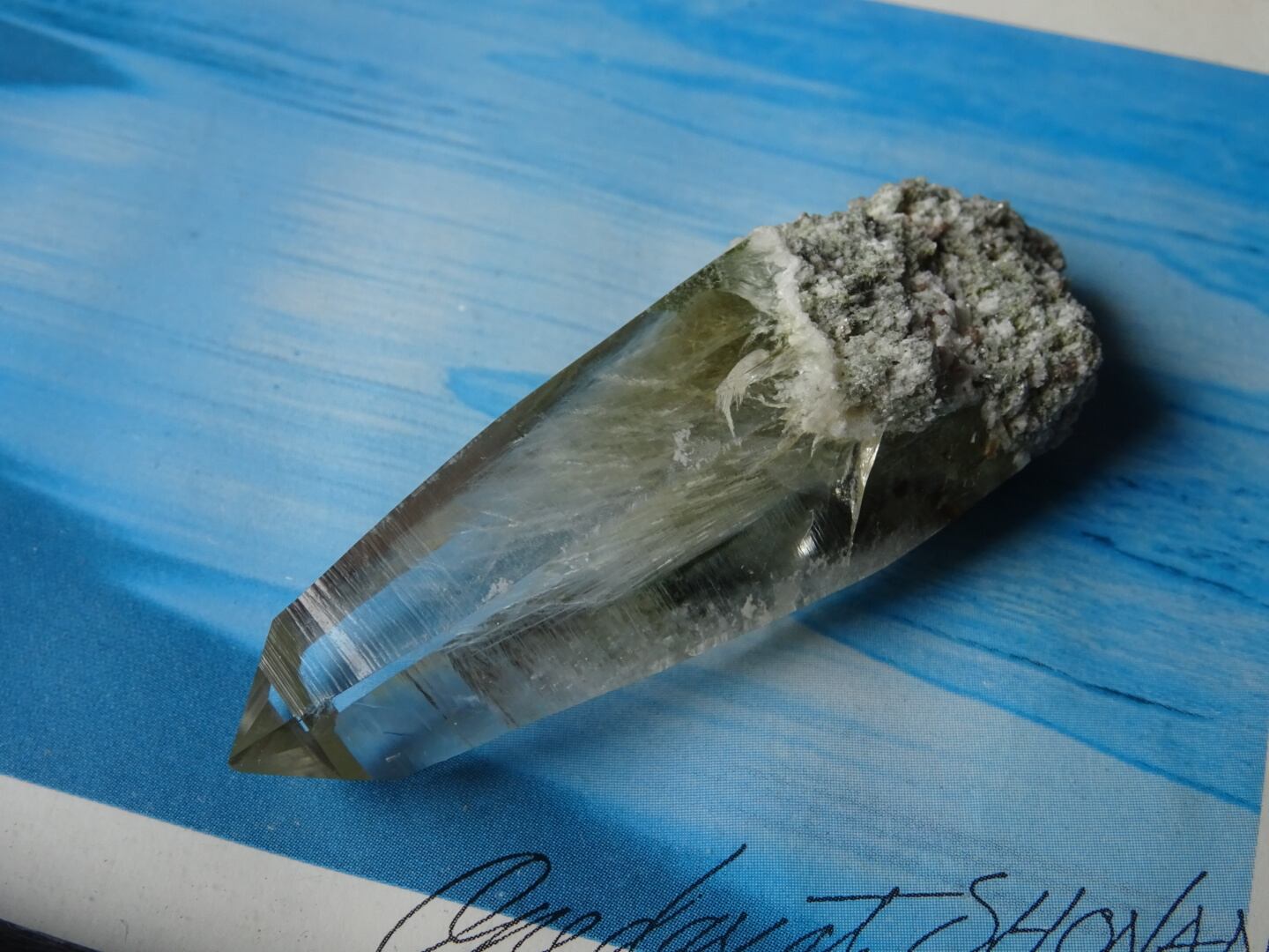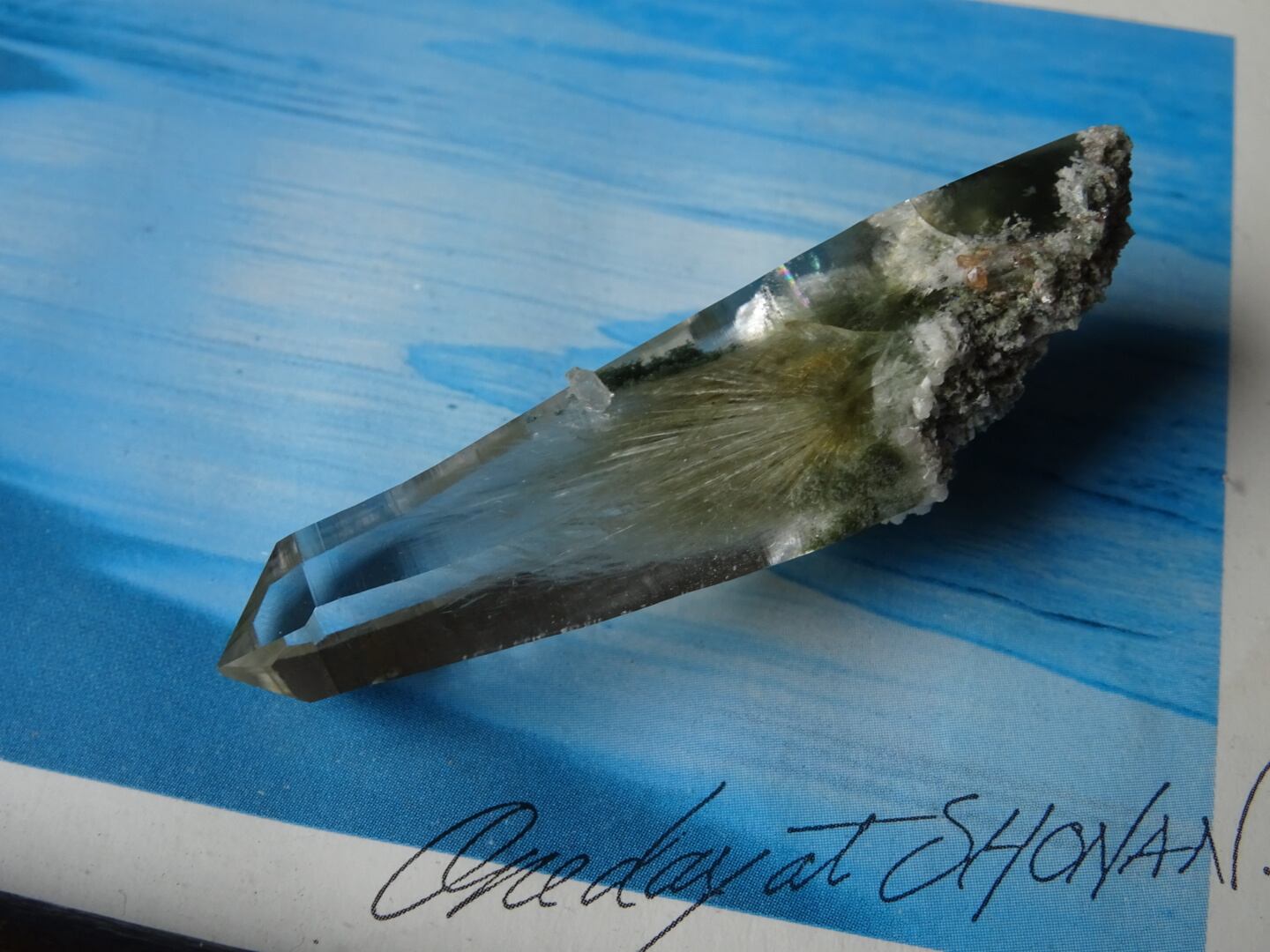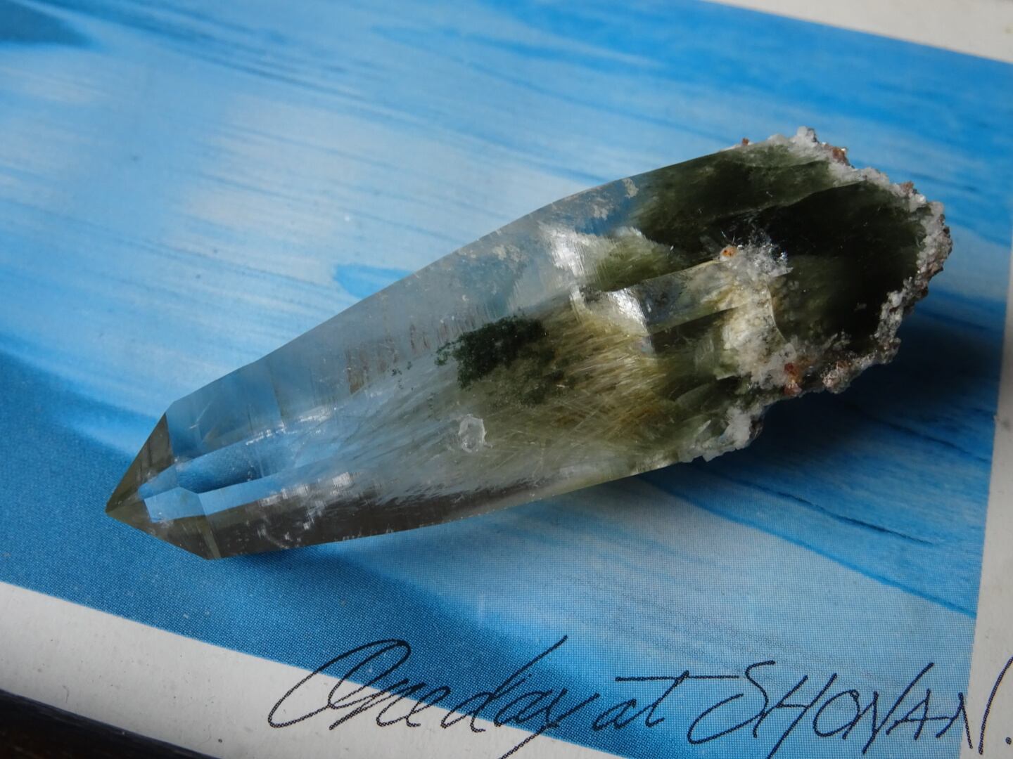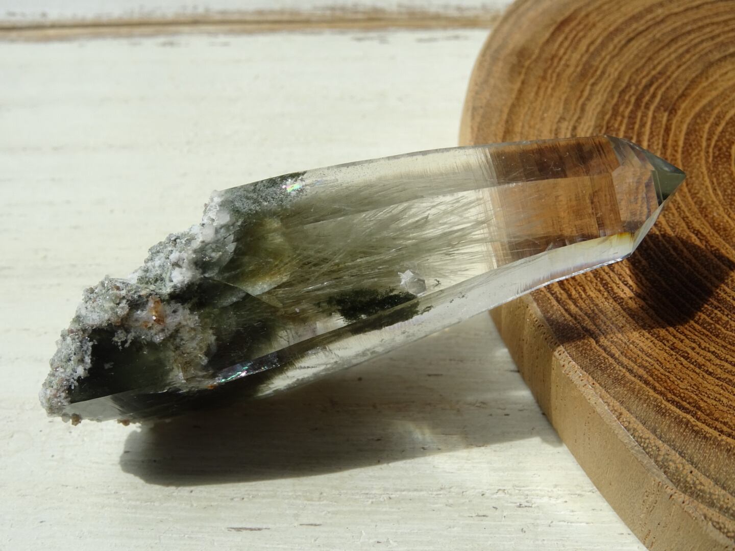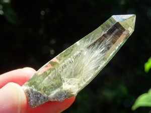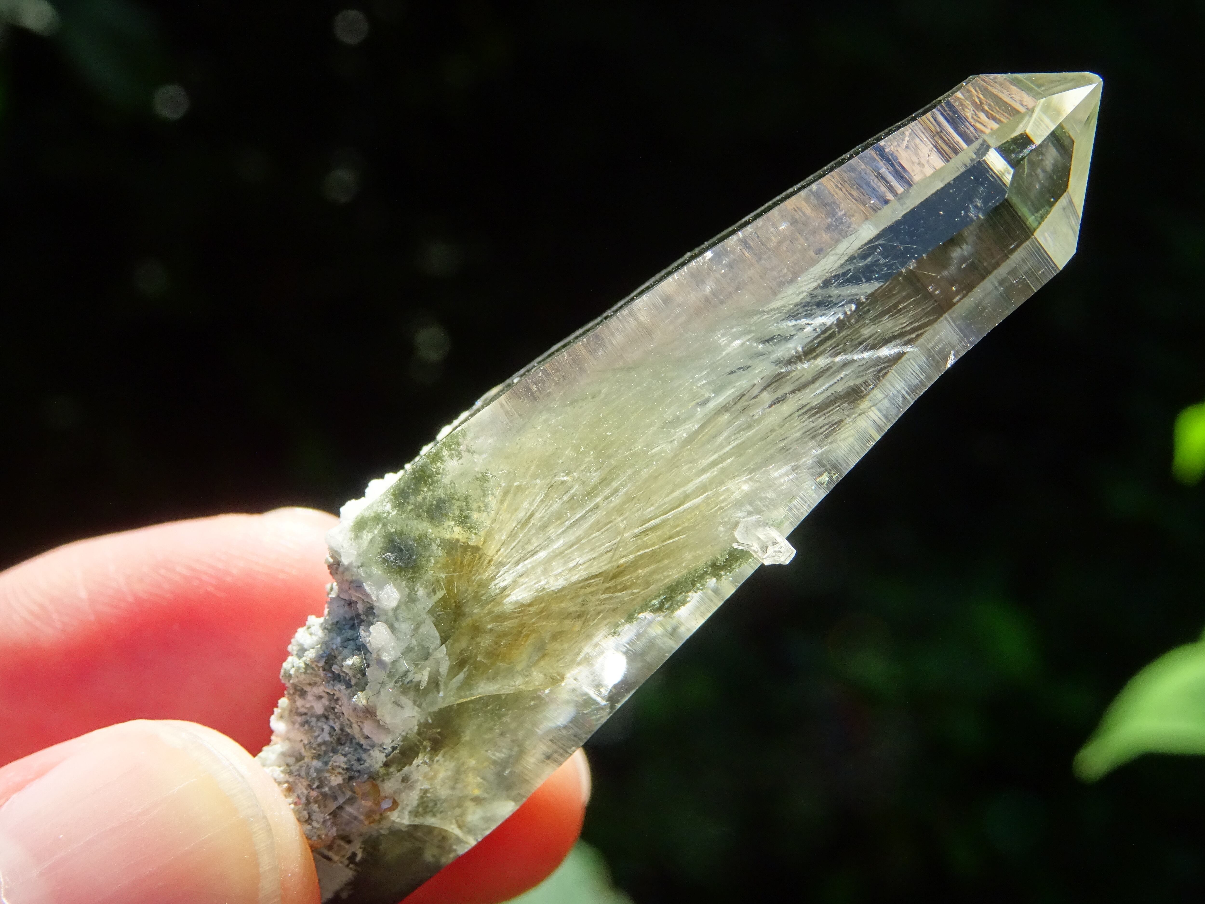 クリスタルの上部までここまで綺麗に伸びた角閃石は珍しく、美しさに目を奪われます。