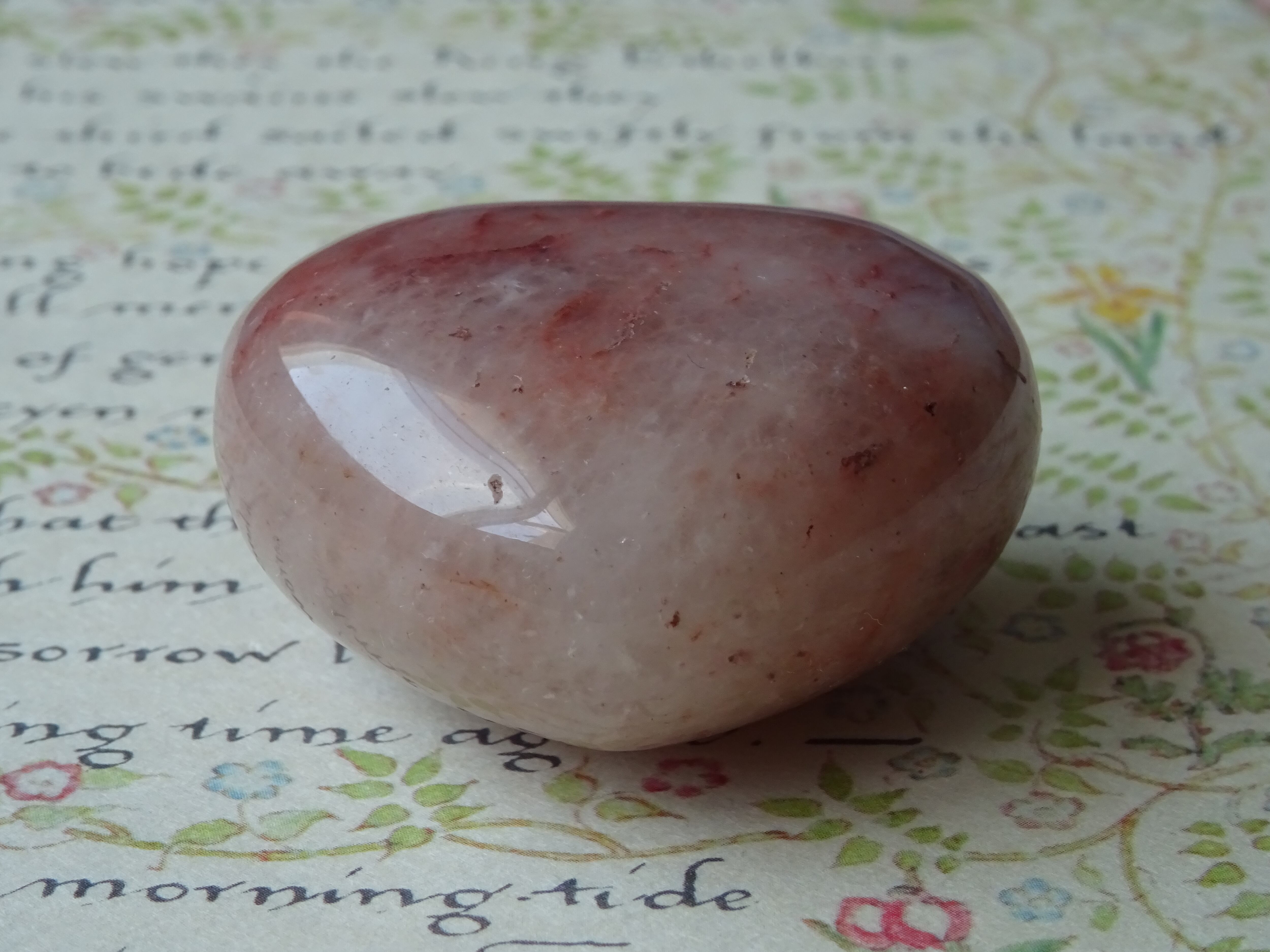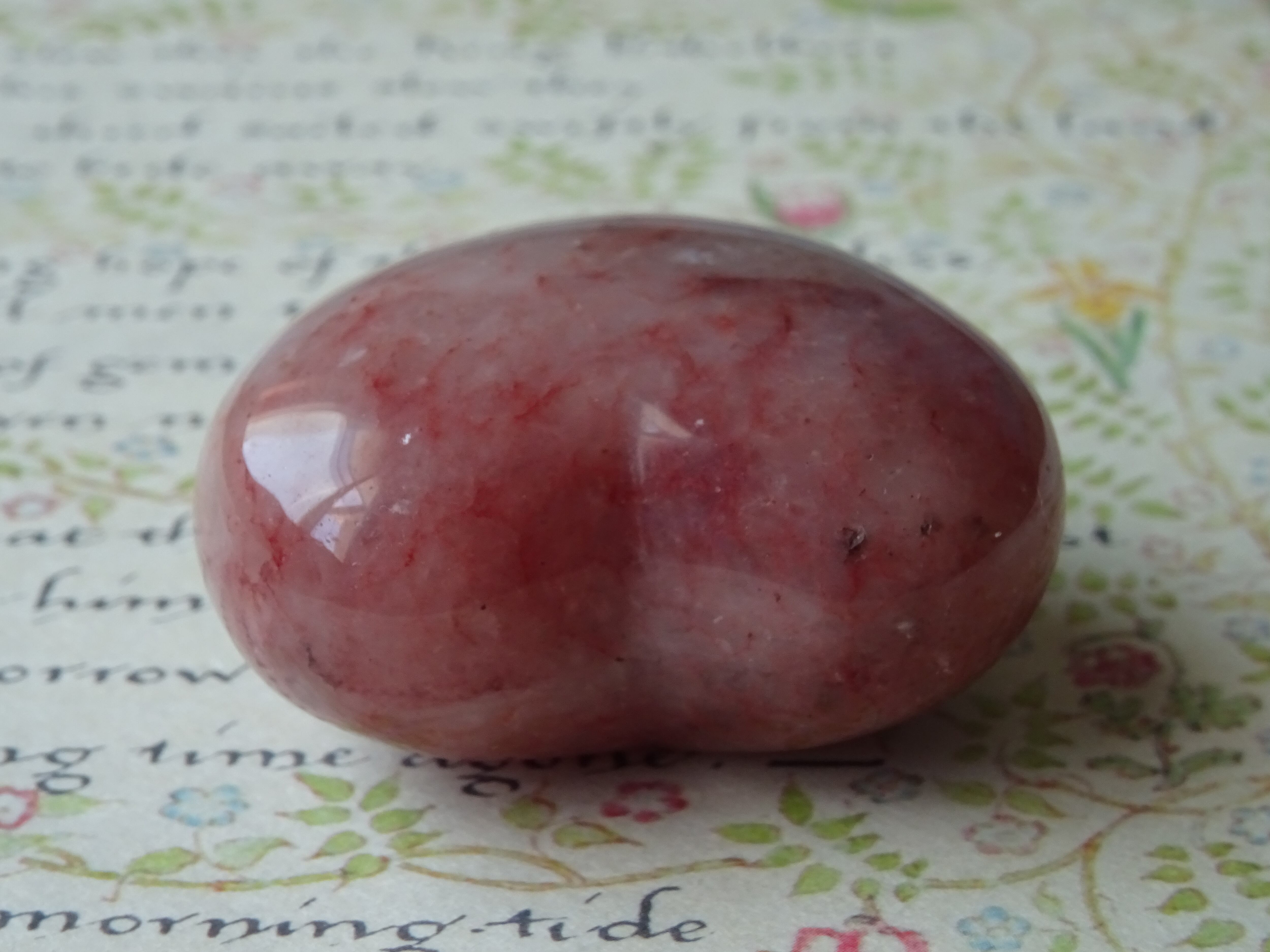 ピンク~レッドベージュの色合いのグァバクォーツ。可愛らしいハートシェイプに磨かれています。