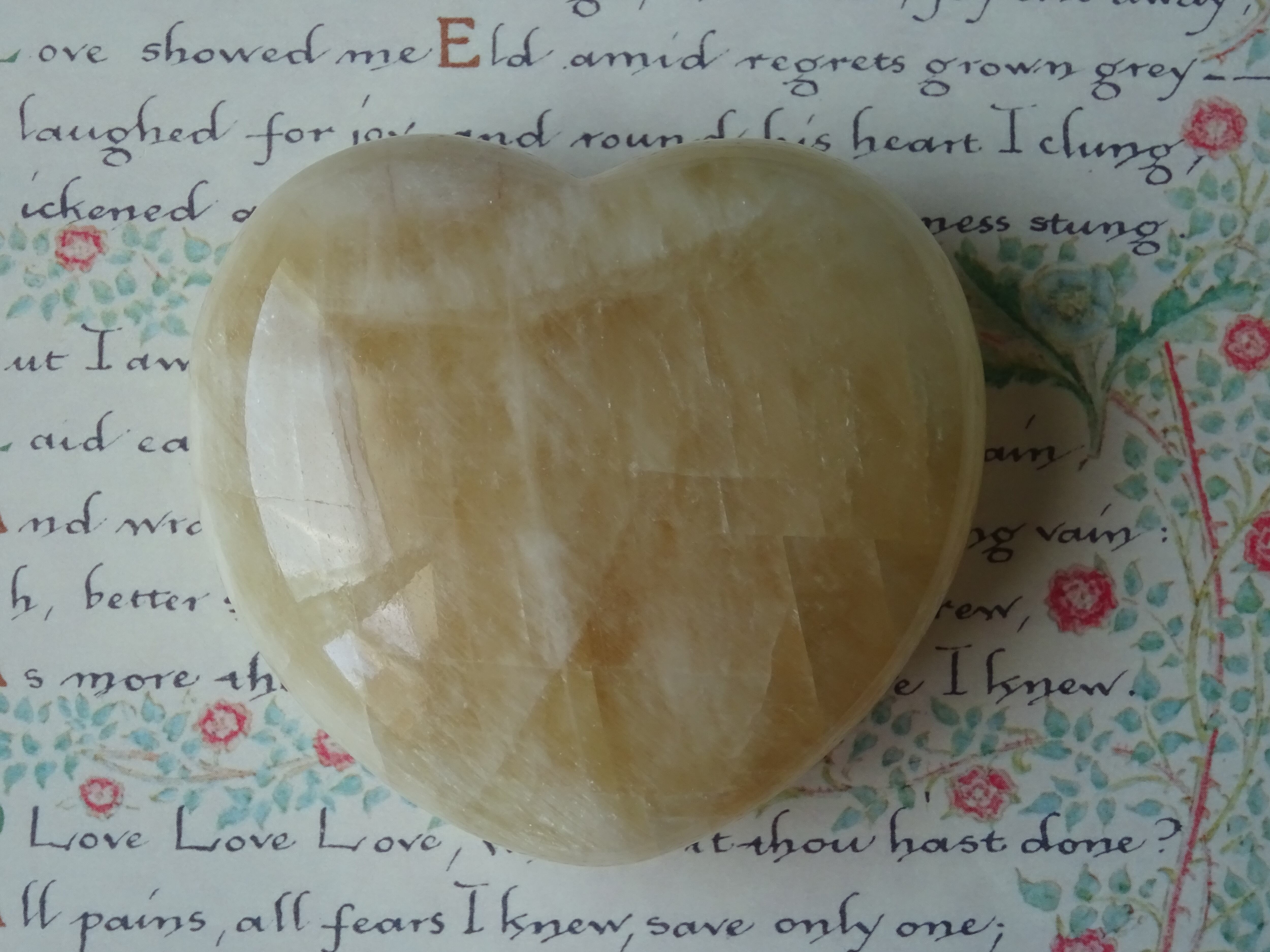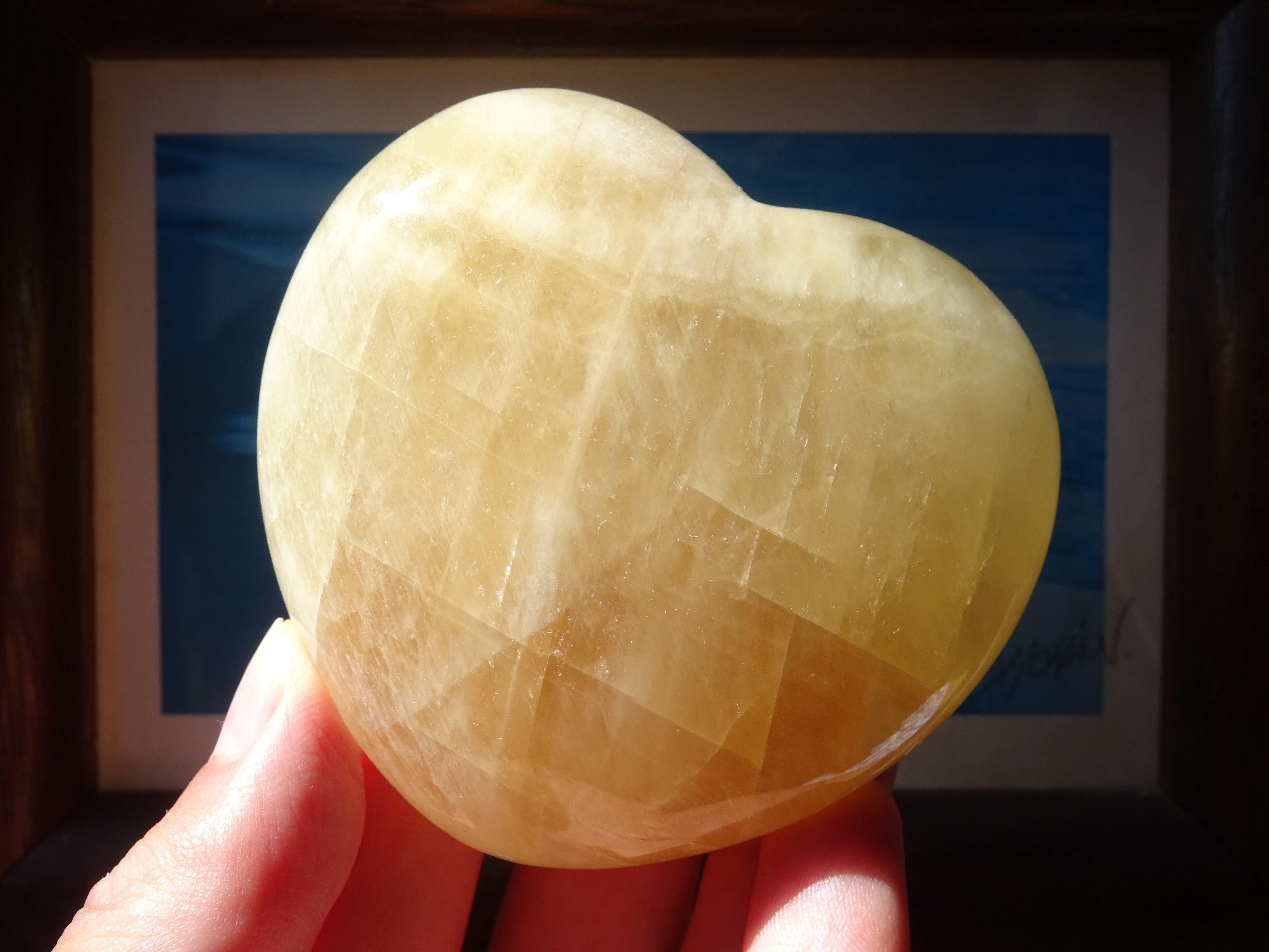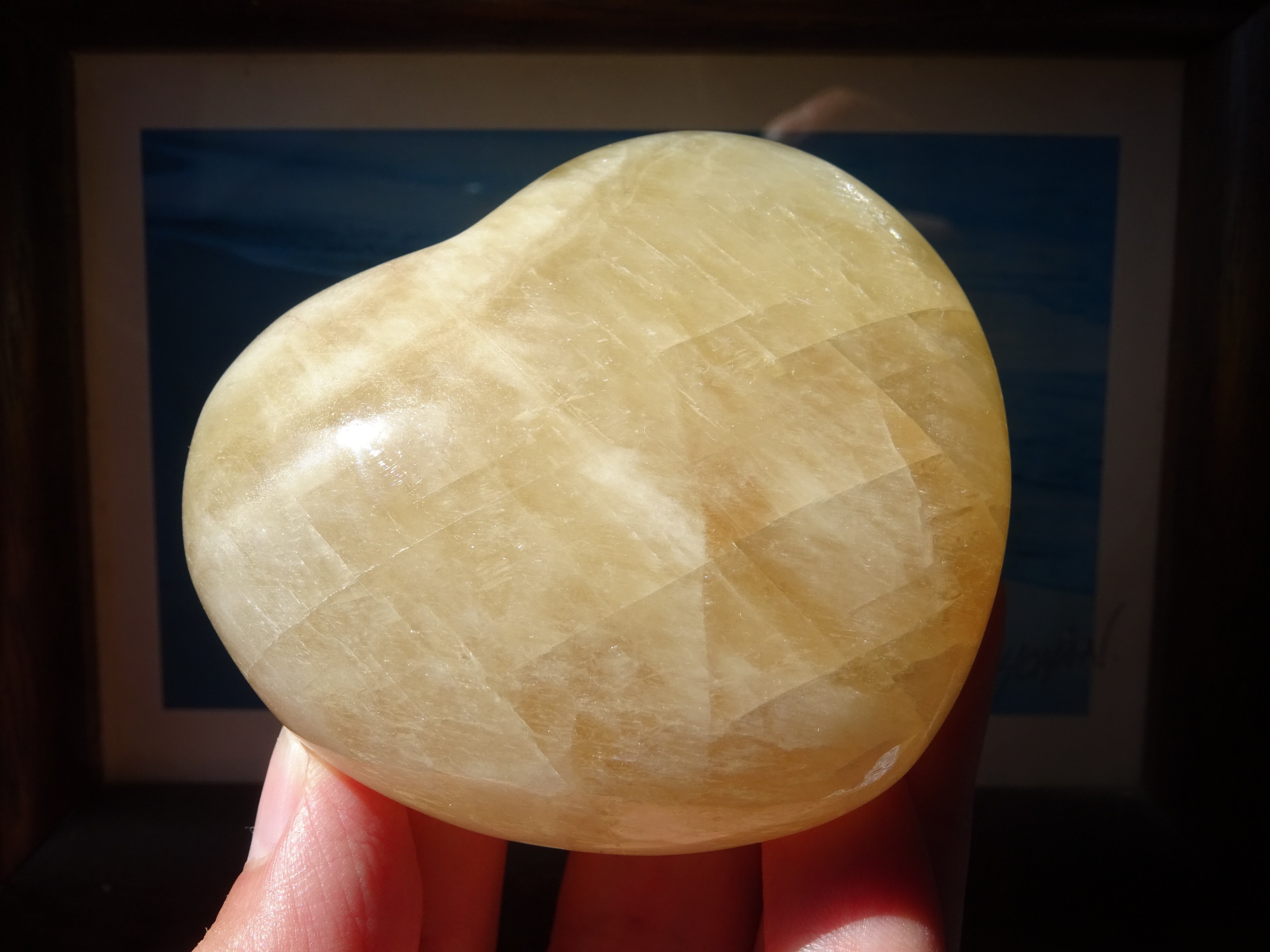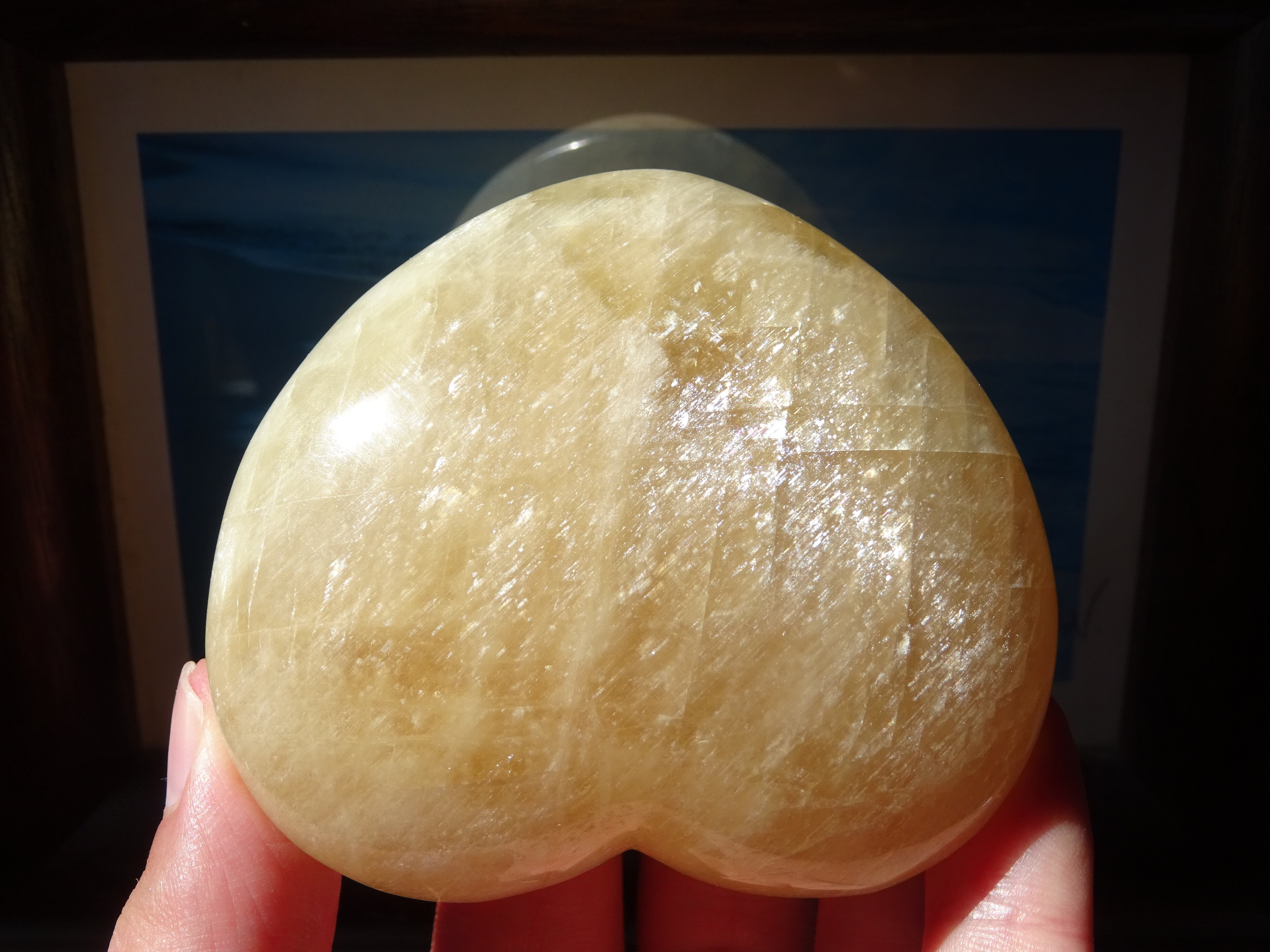 優しいハニーイエローのカルサイトハート。濃淡のあるイエローがほっこりと甘く、傾けると綺麗な白銀のシラーを見せてくれます。