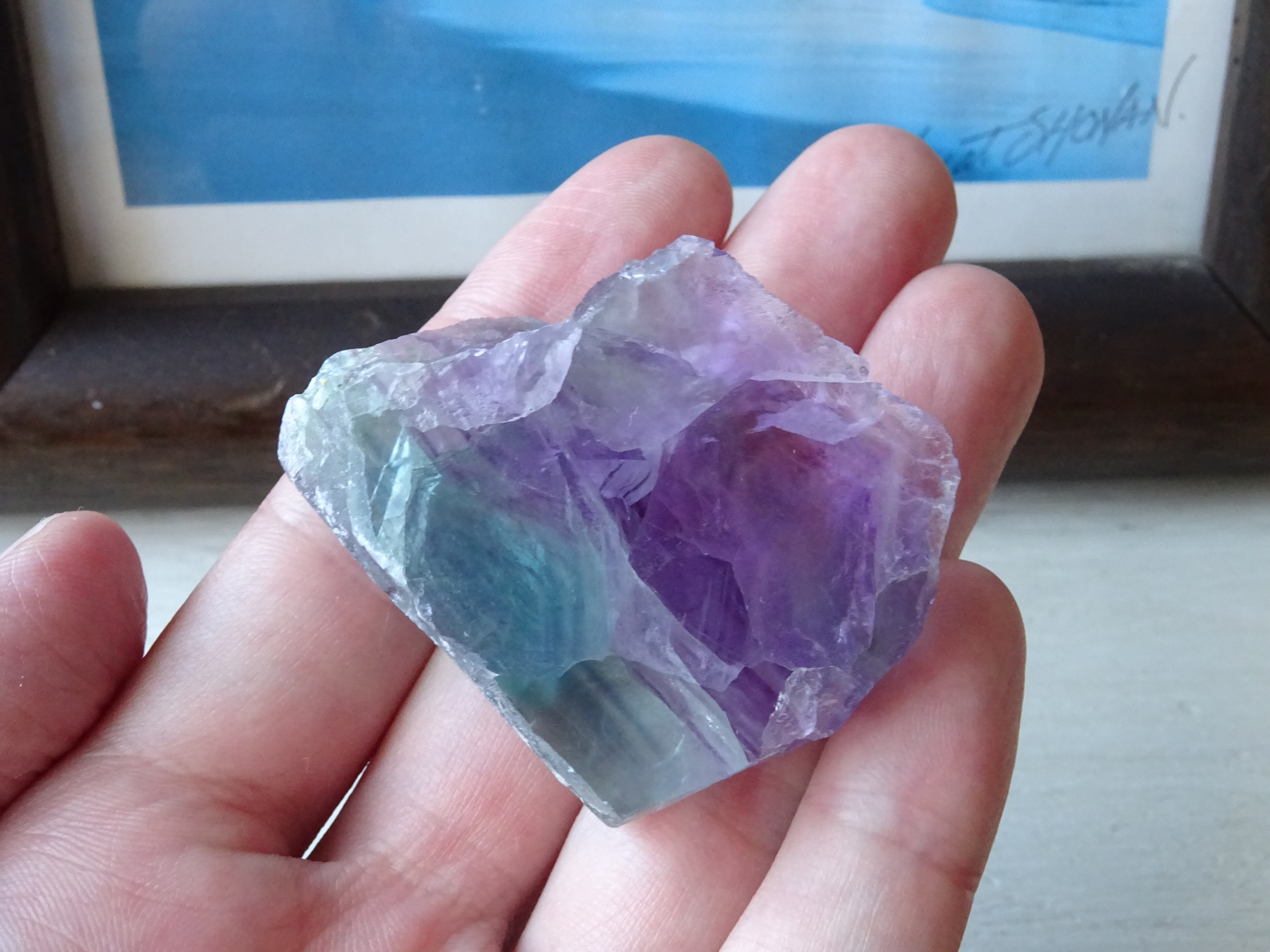 パープル&グリーンの原石で一面のみが研磨されています。瑞々しくてフレッシュな色合いが美しくお洒落。山型と水平線のゾーニング(ファントムのようなライン)がはっきりと覗えます。