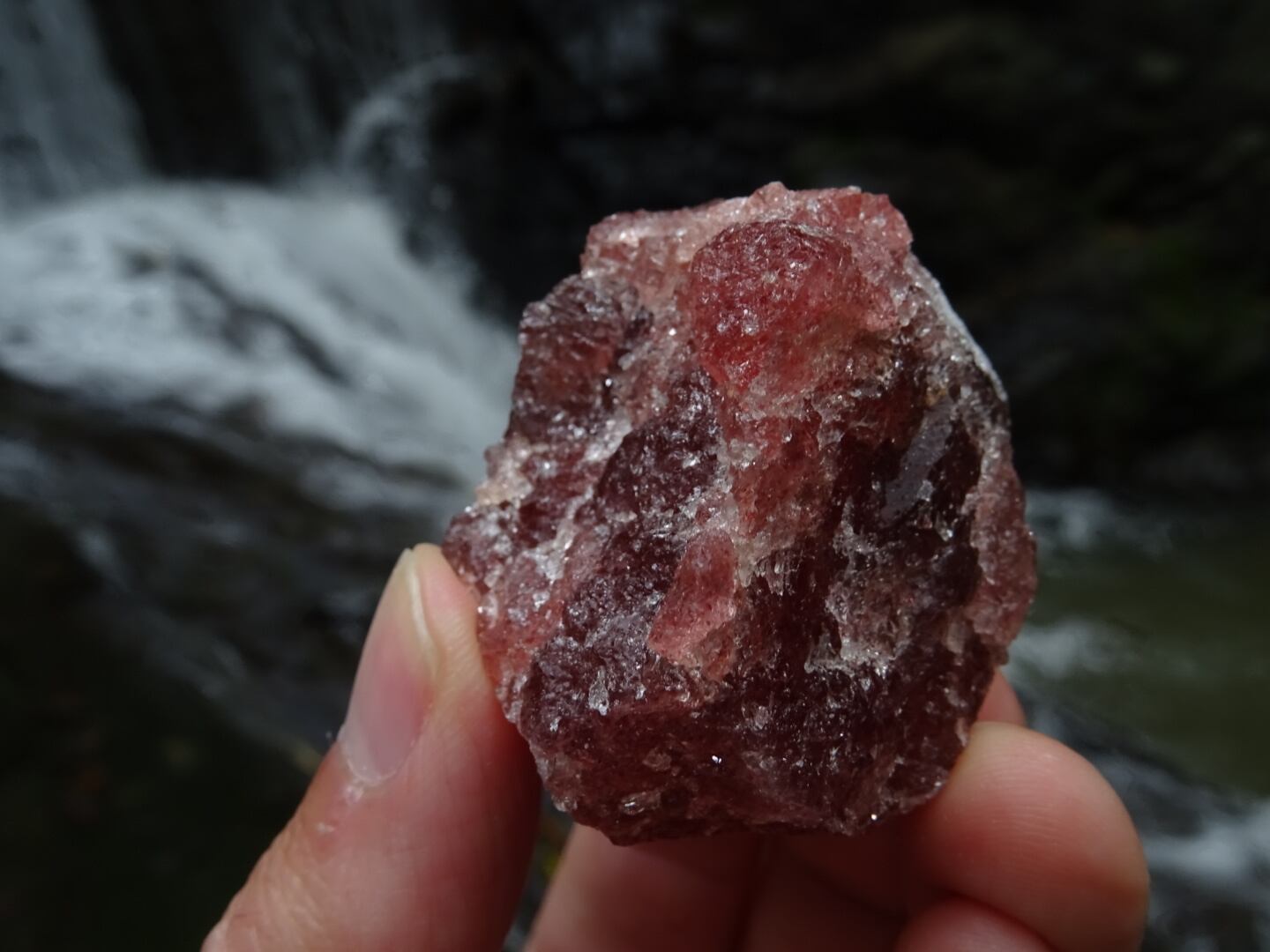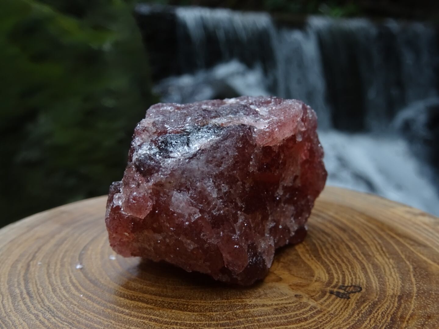 プラムのような色は光を透過すると美しい赤色を見せてくれます。また、よく見ると赤い粒々をたくさん内包しています。