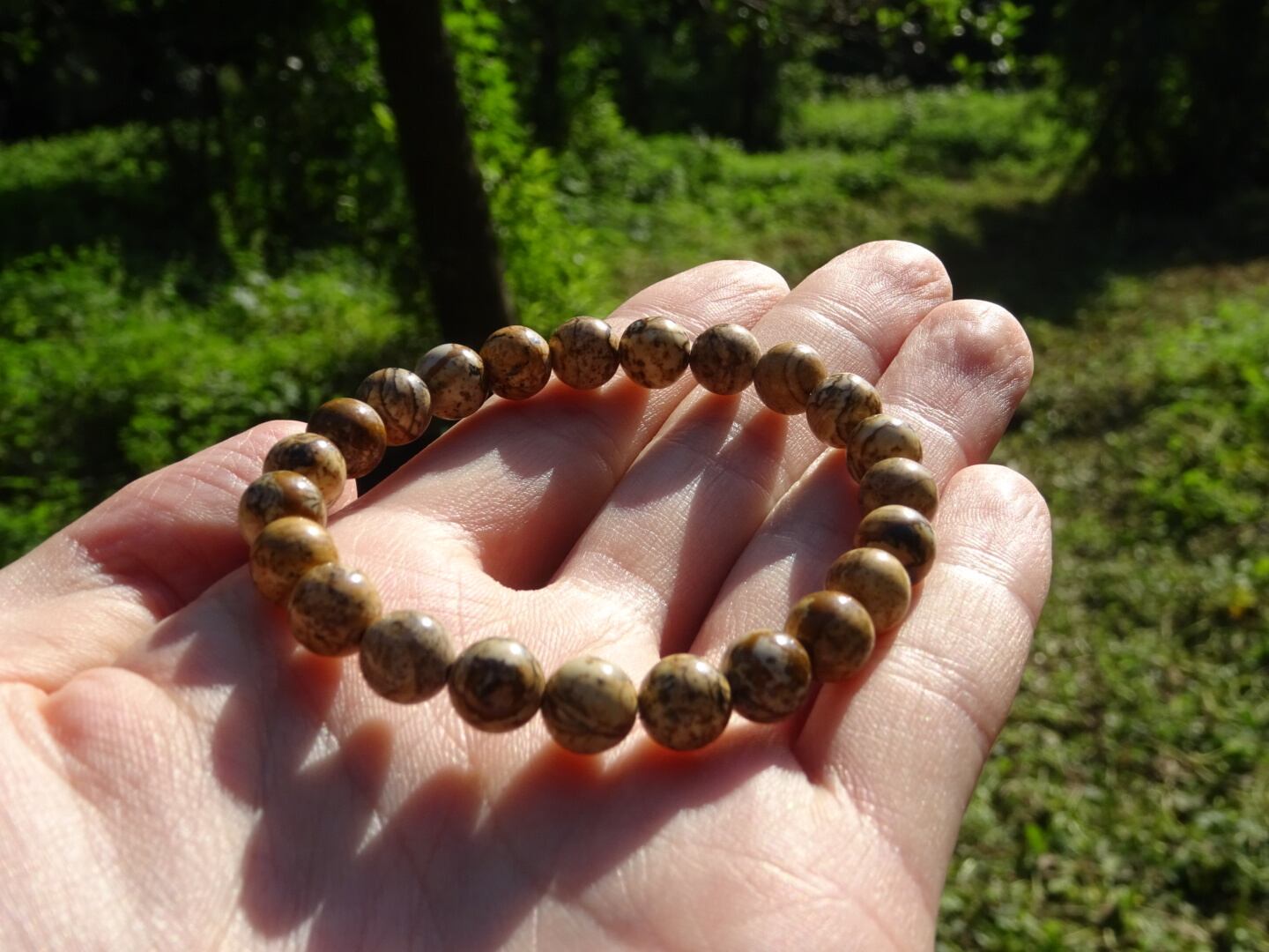 こちらは樹木の化石のような温かみのあるブレスレット。それぞれの玉模様が美しいです。