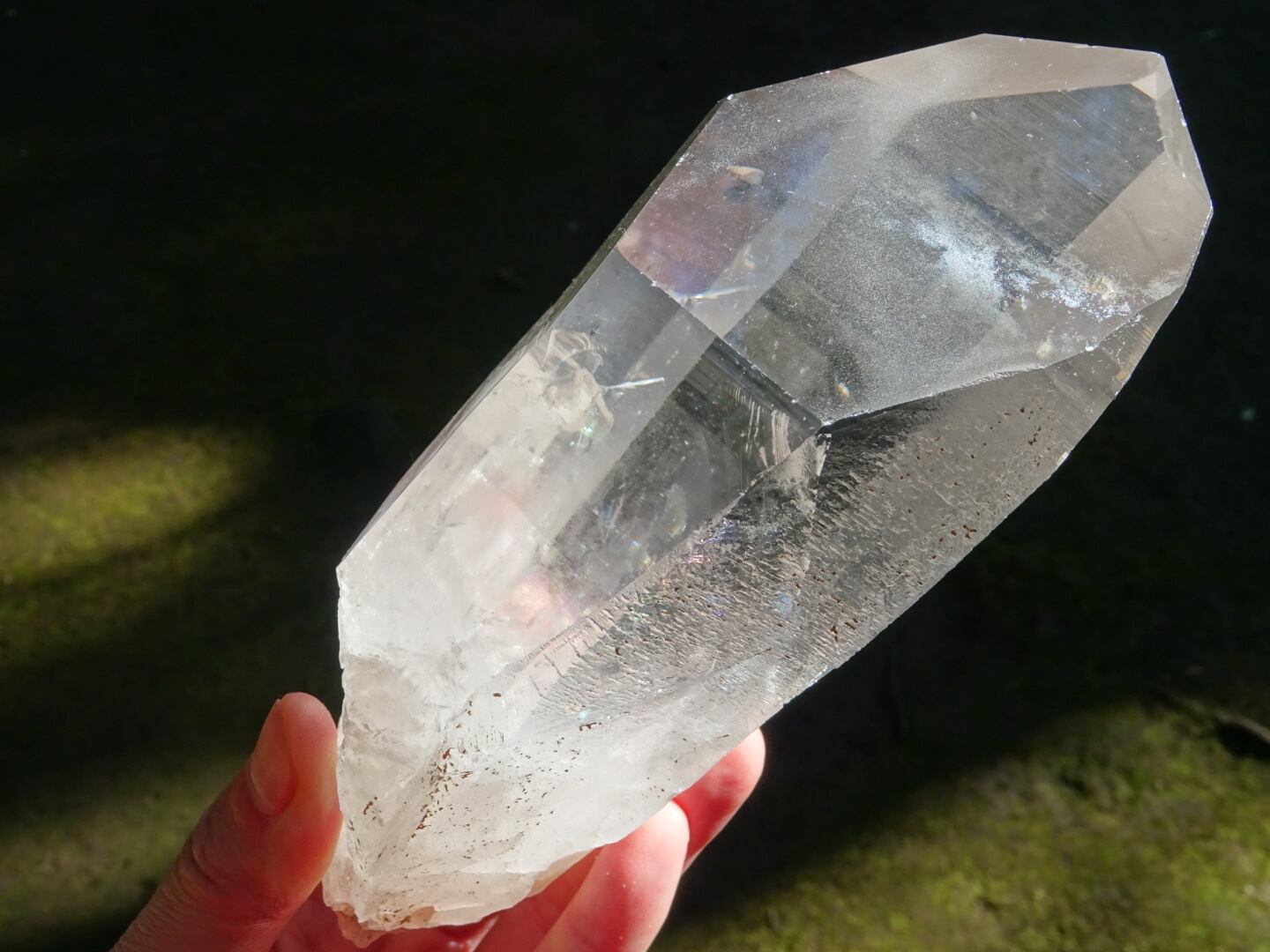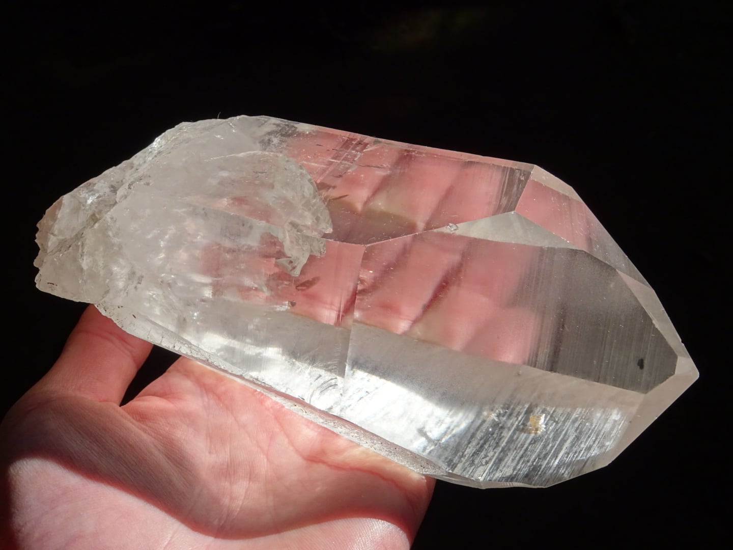 根元の一部がピンクがかっていて、内側のクラックからは光の角度によって虹が浮かびます。ペンライトで照らすとファントムの層もいくつか確認できます。