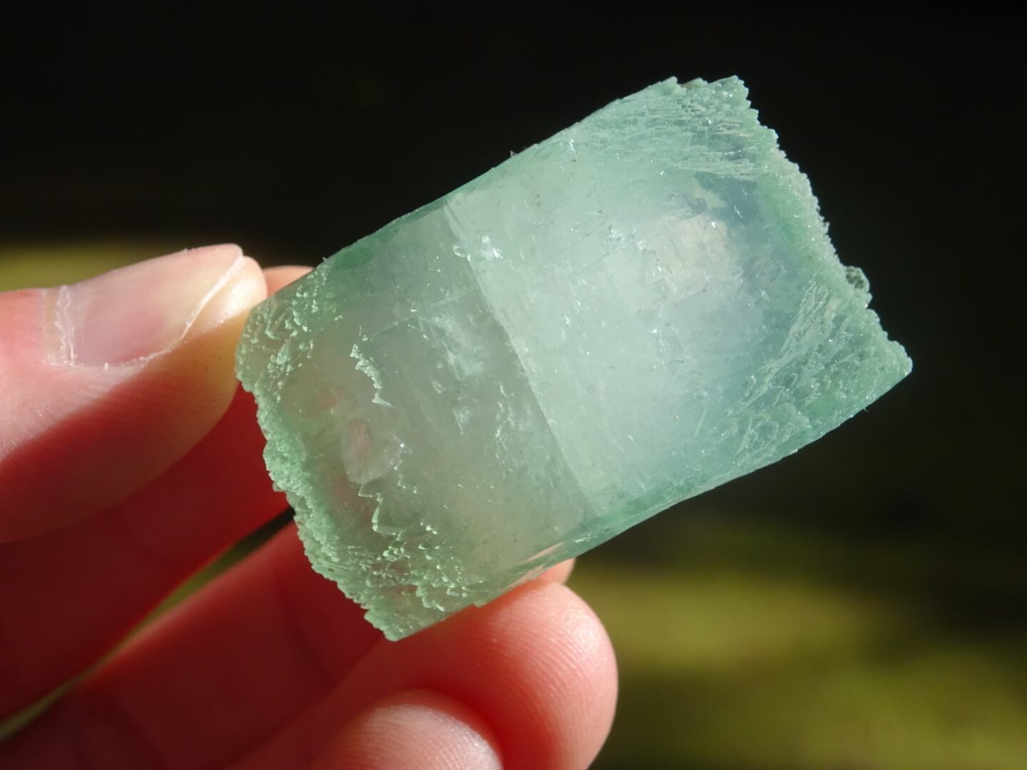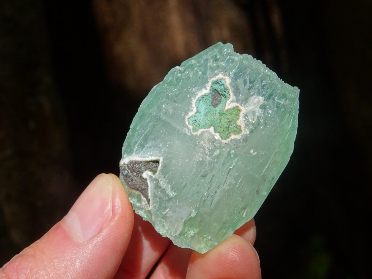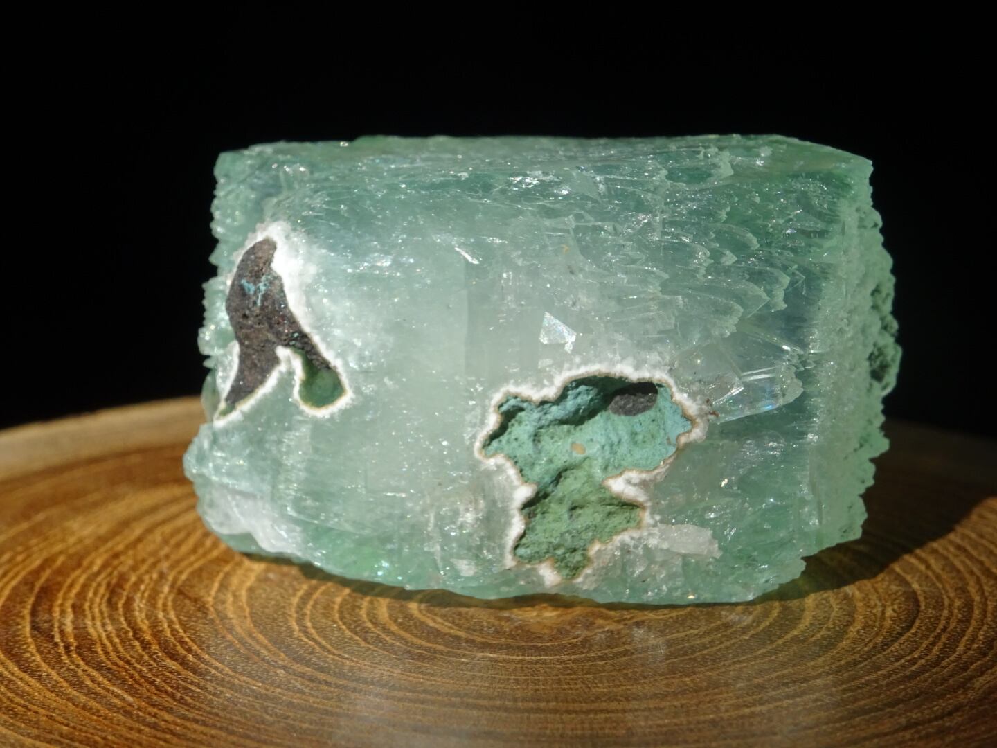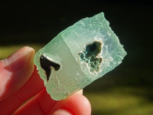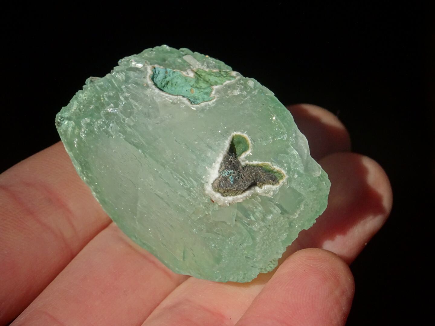 緑色の氷のような結晶は整ったフォルム。上下はセルフヒールしたようにザクザクになっています。
