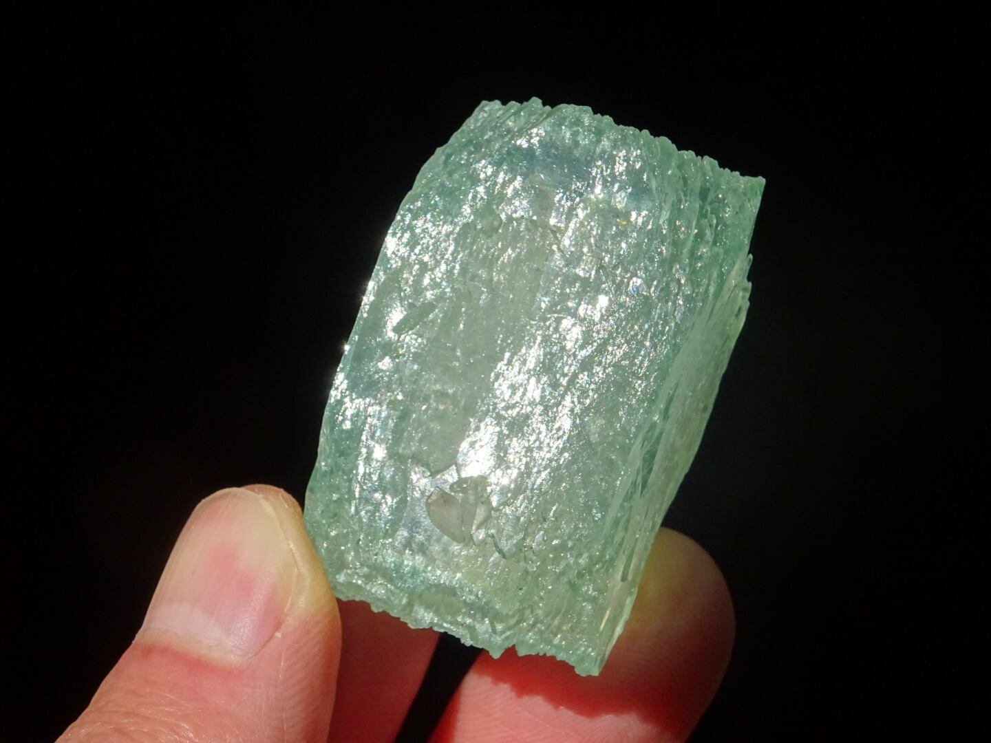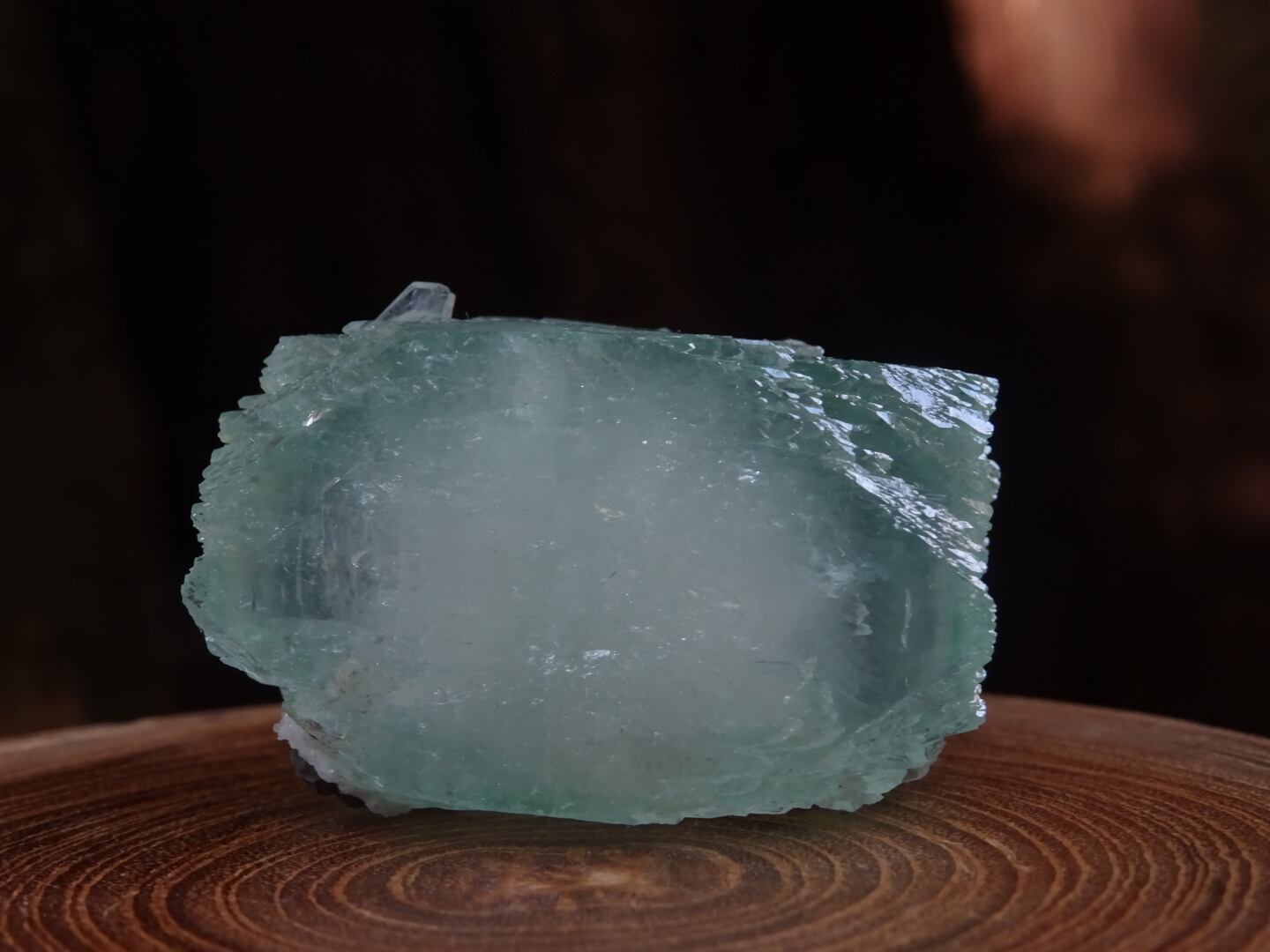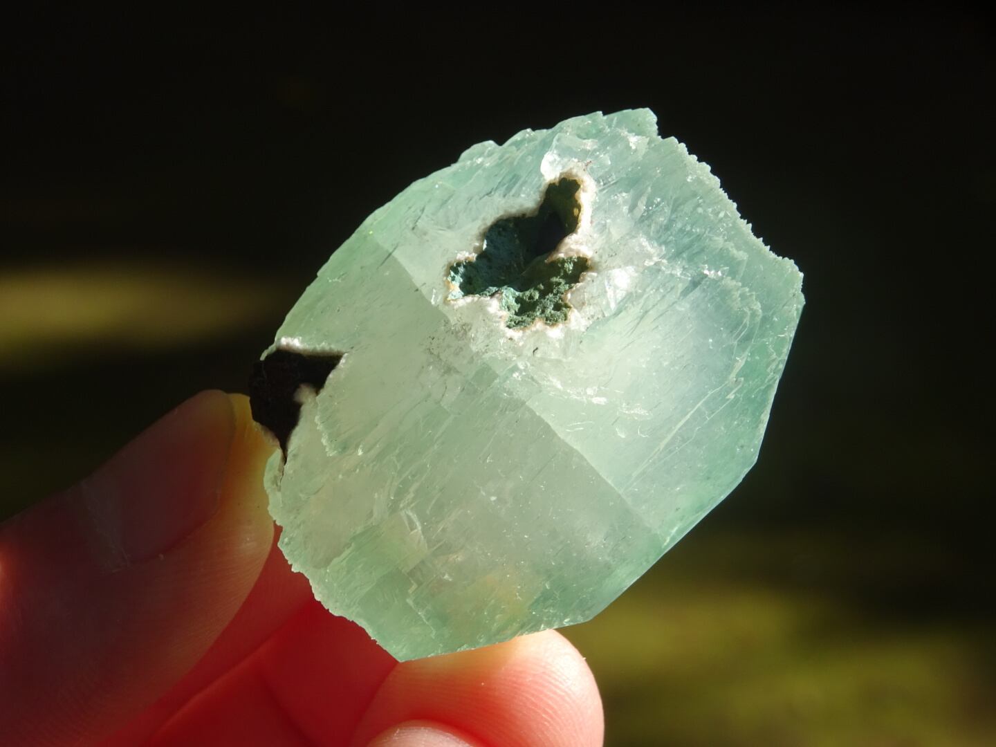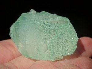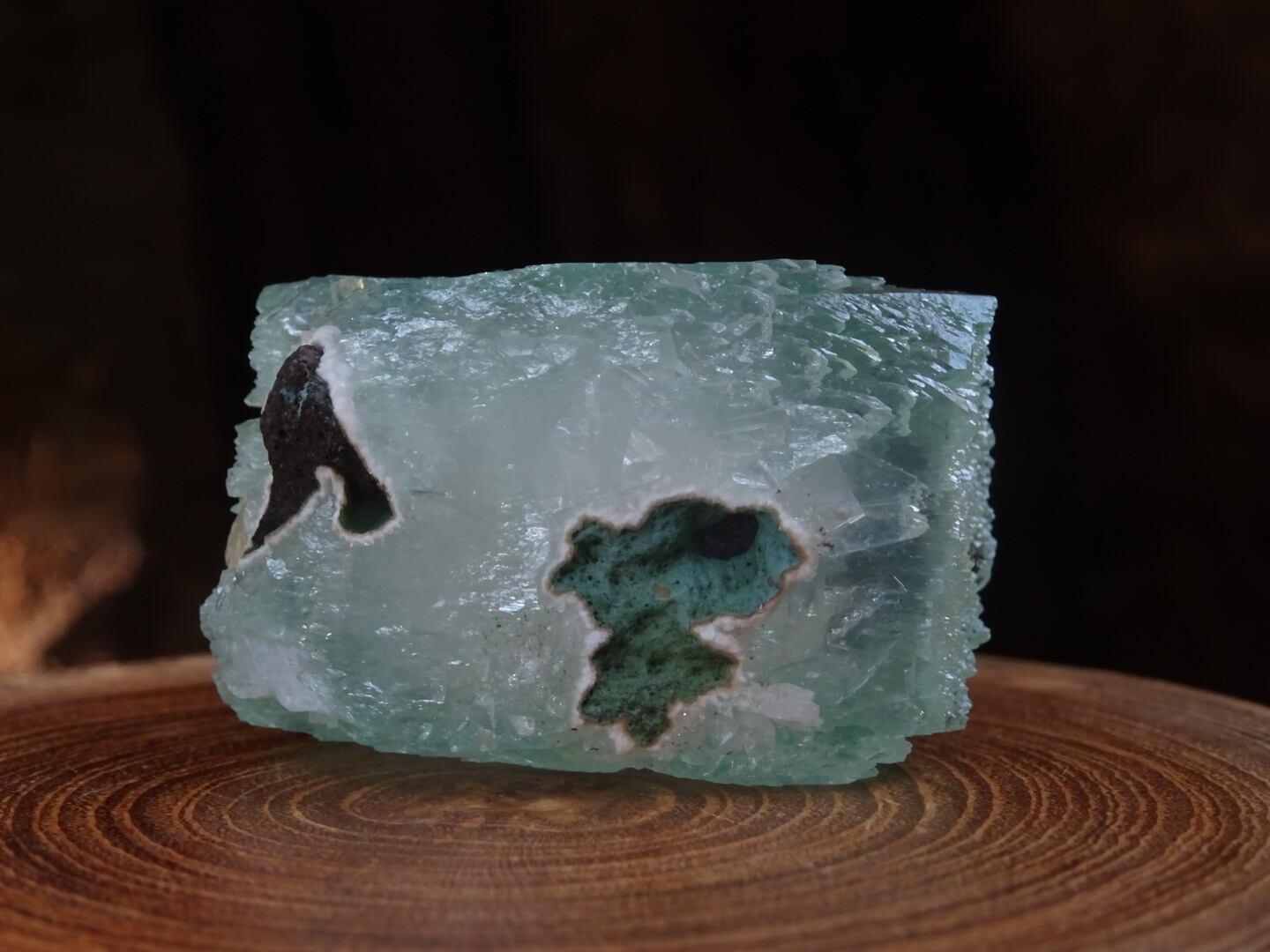 緑色の氷のような結晶は整ったフォルム。上下はセルフヒールしたようにザクザクになっています。