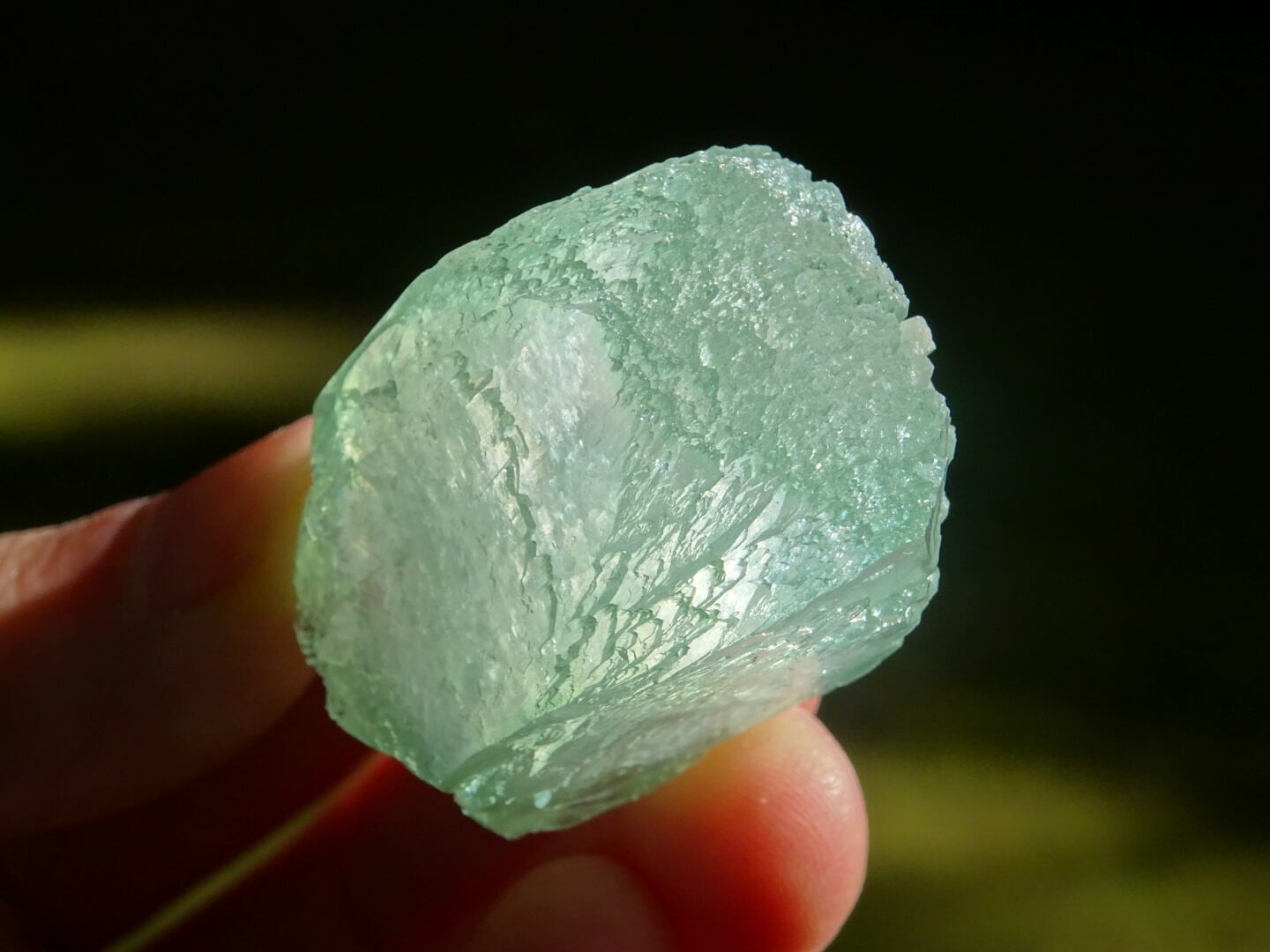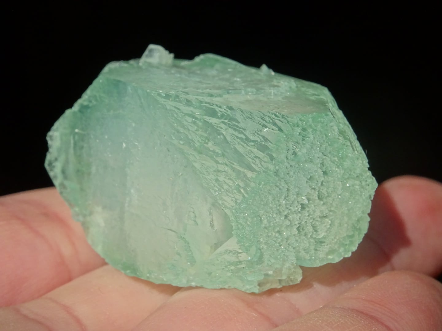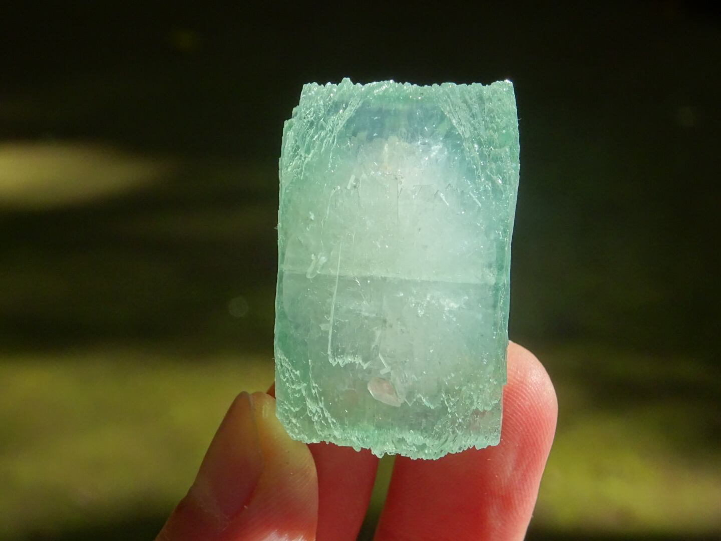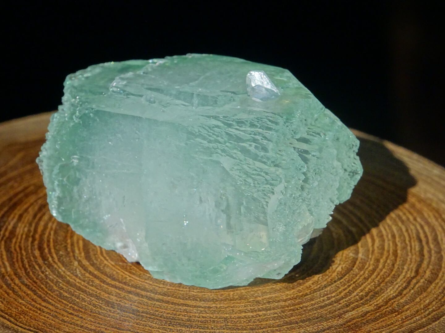 緑色の氷のような結晶は整ったフォルム。上下はセルフヒールしたようにザクザクになっています。