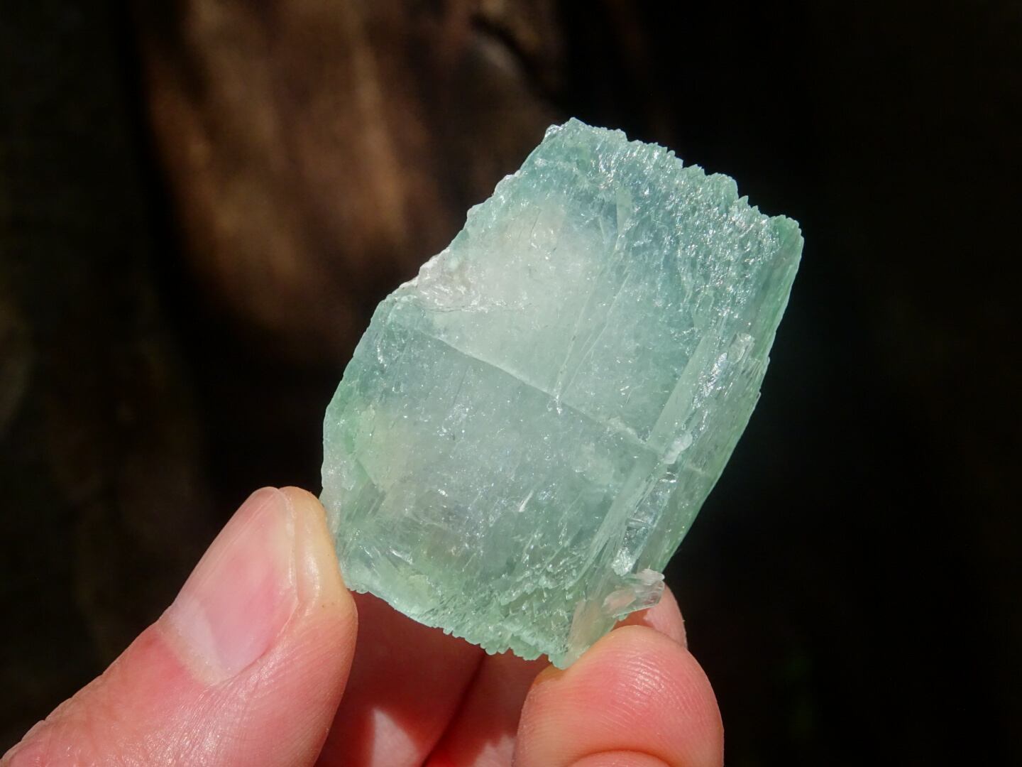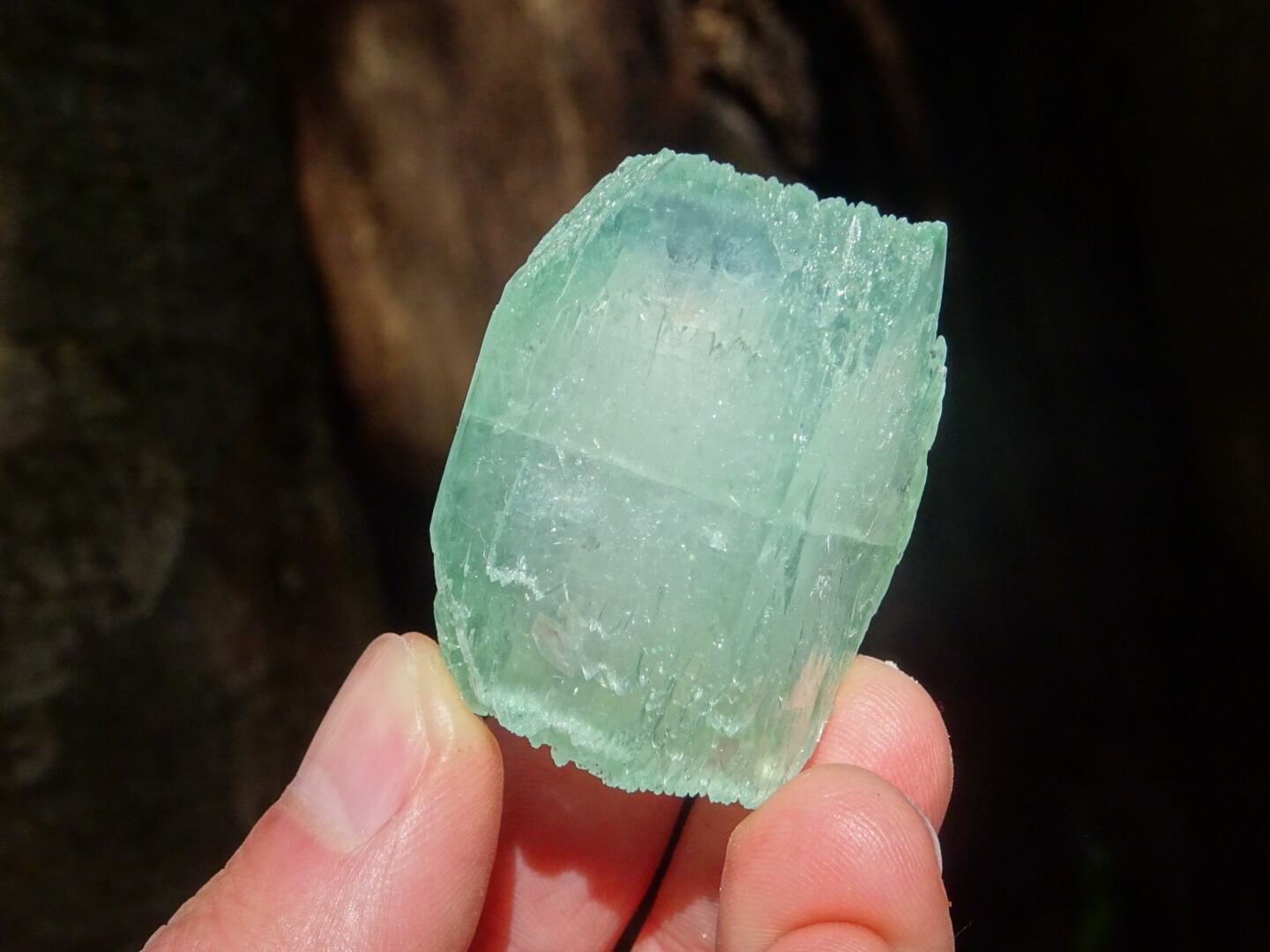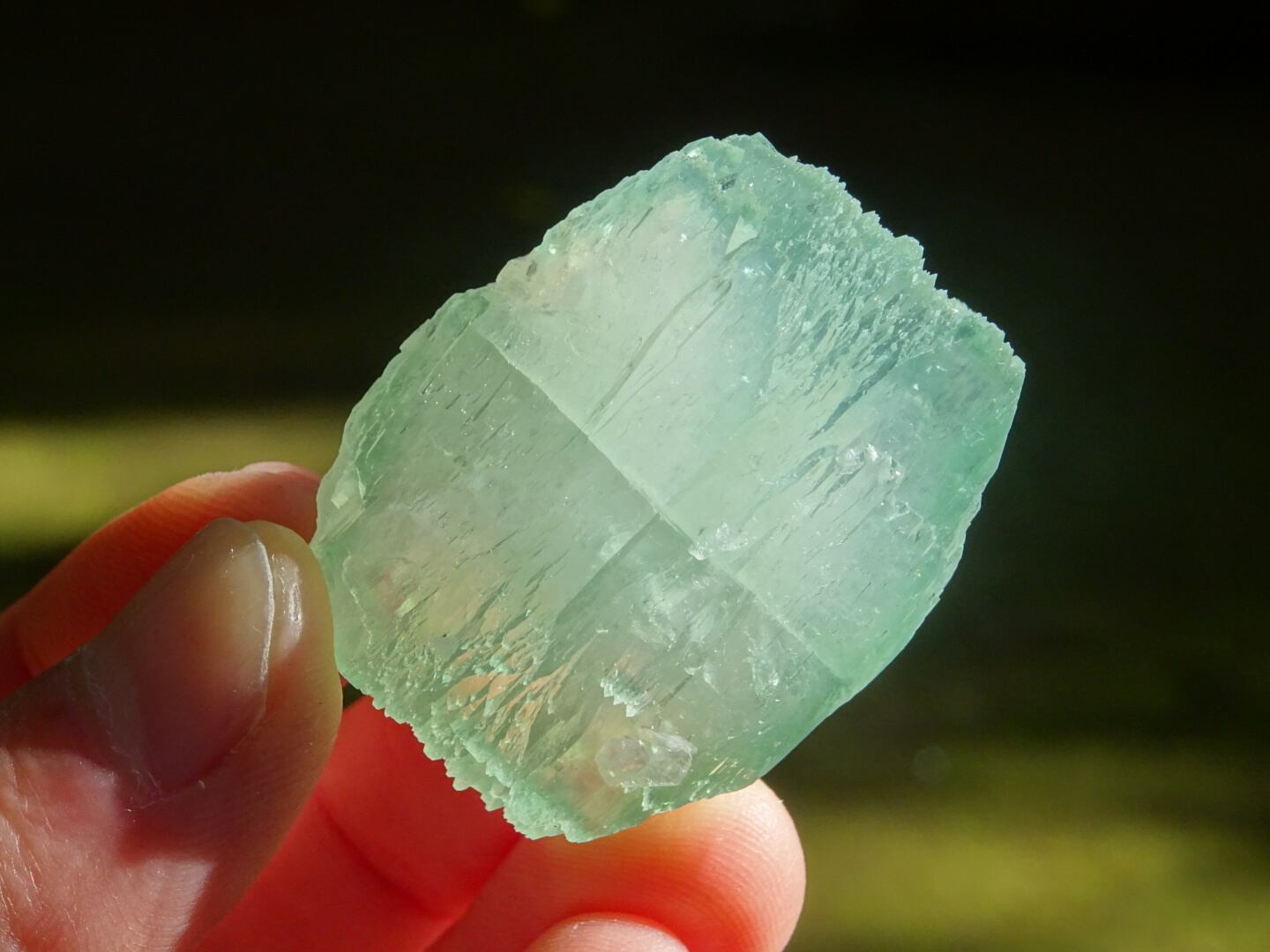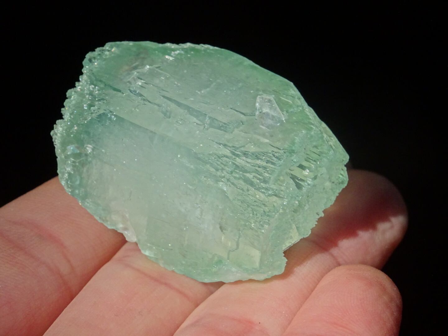 緑色の氷のような結晶は整ったフォルム。上下はセルフヒールしたようにザクザクになっています。