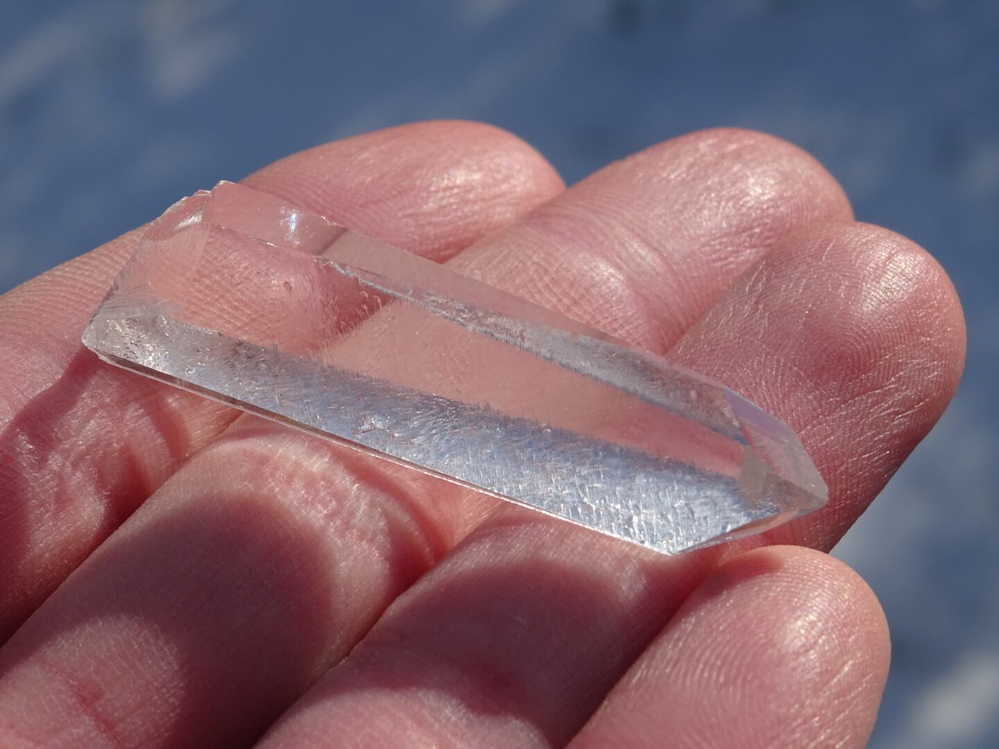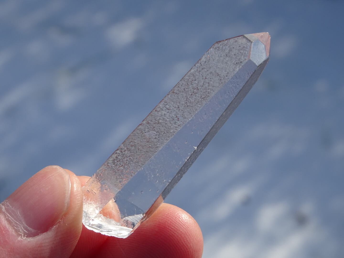 蝕像が出ている面はくぐもって見えますが、透明度は非常に高く、上から下までフルクリアな結晶です。