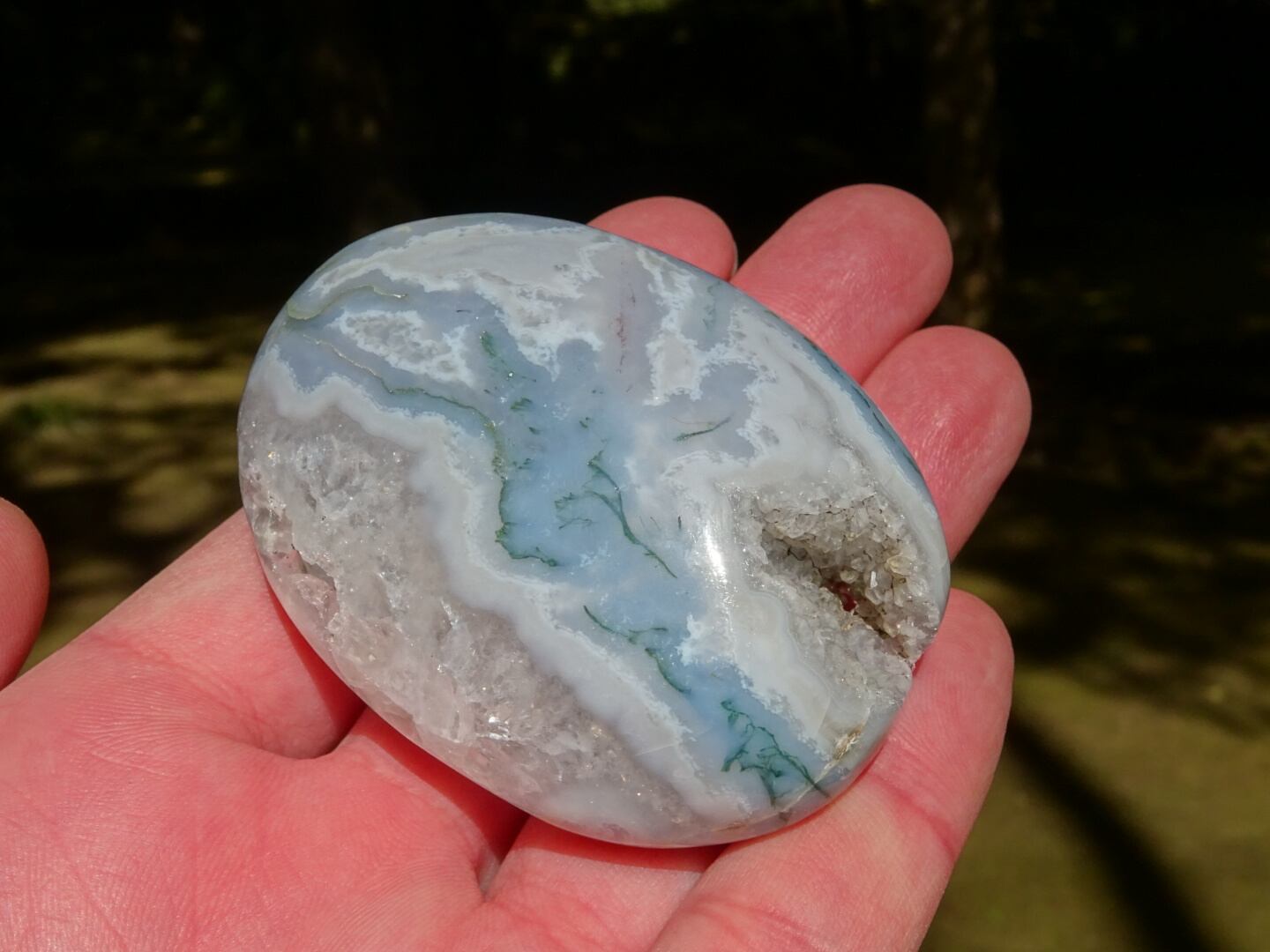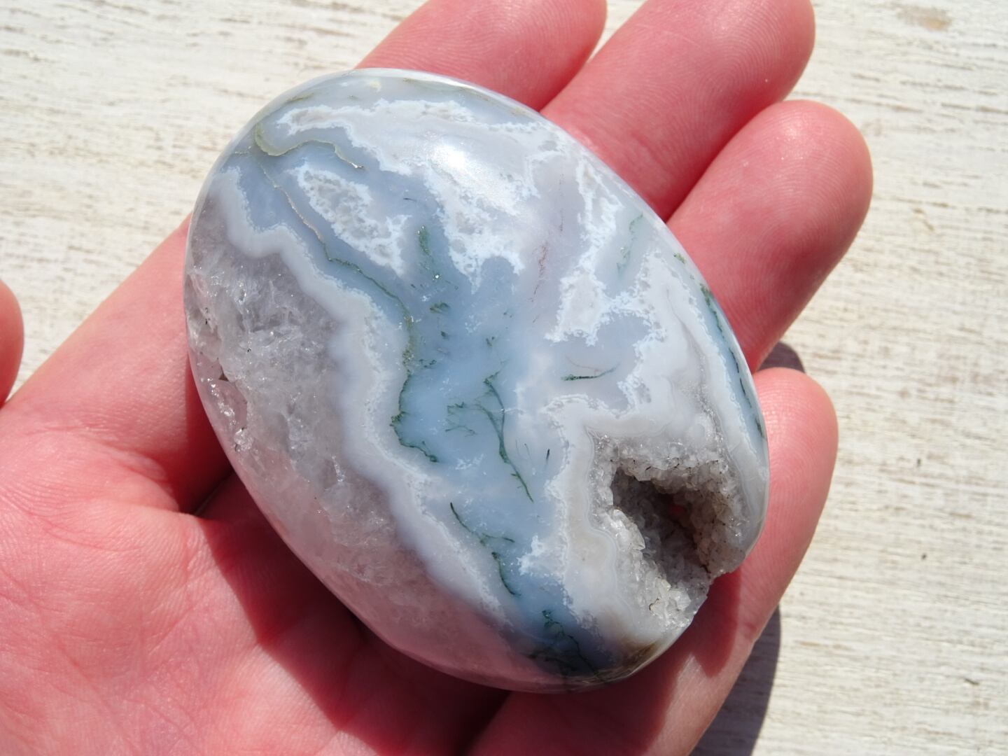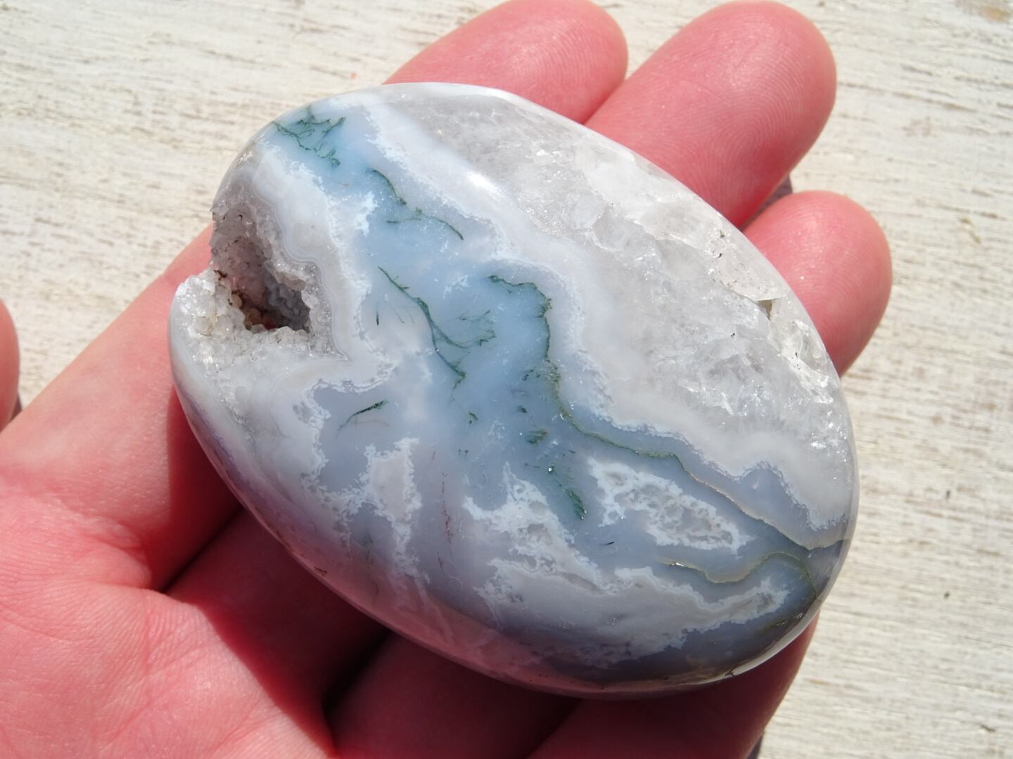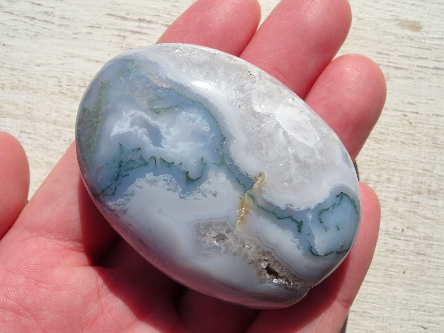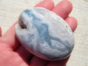 みずみずしいホワイト&クォーツに、クローライト(緑泥石)のグリーンが流れるように入ったモスアゲート磨き石。