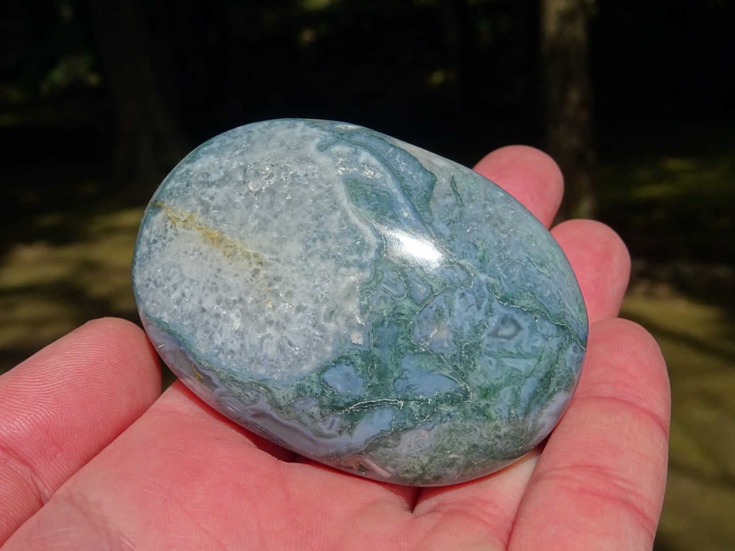 深いクローライト(緑泥石)のグリーンに、淡いグレーとクリアなクォーツが混ざったモスアゲート磨き石。