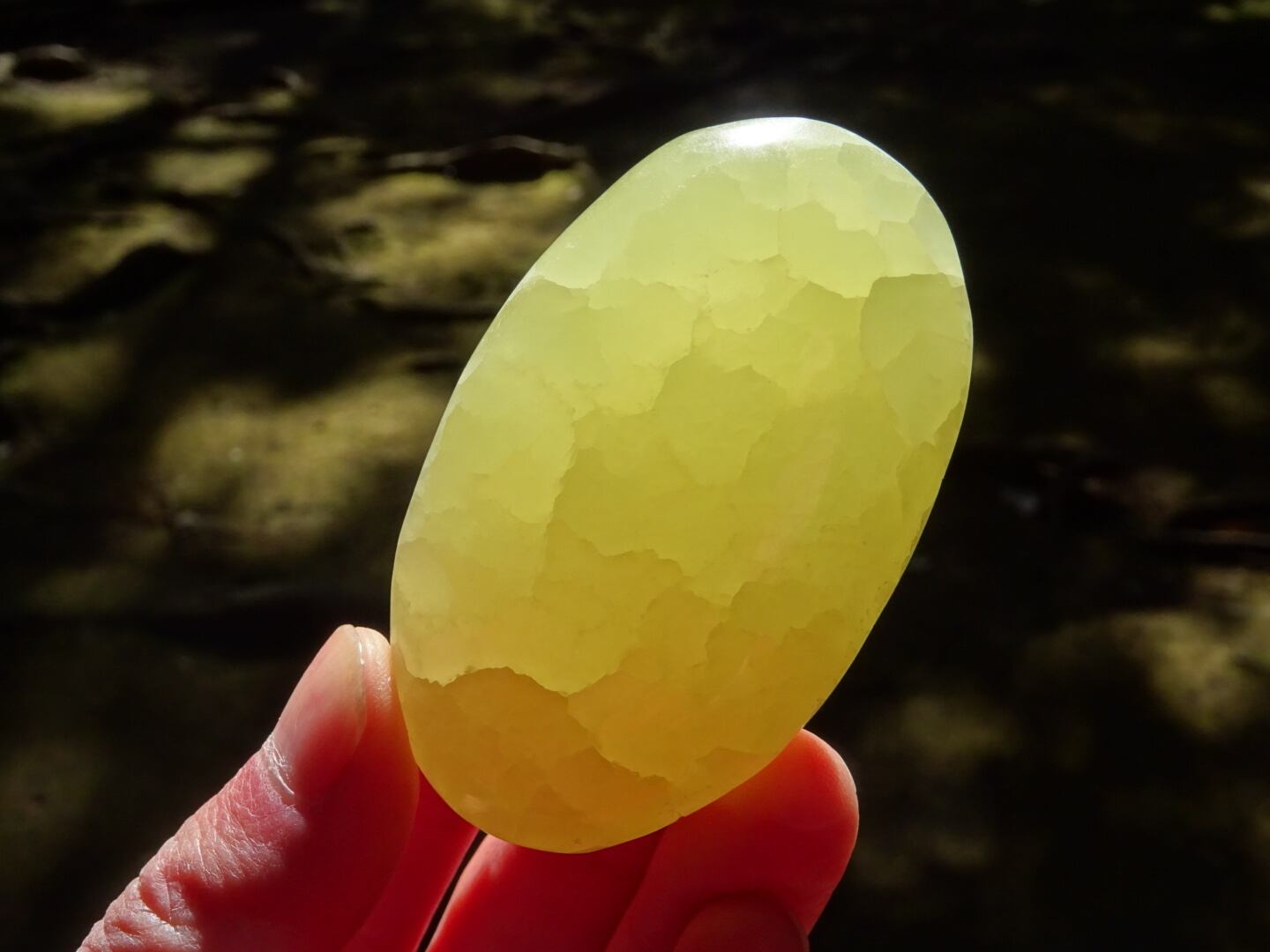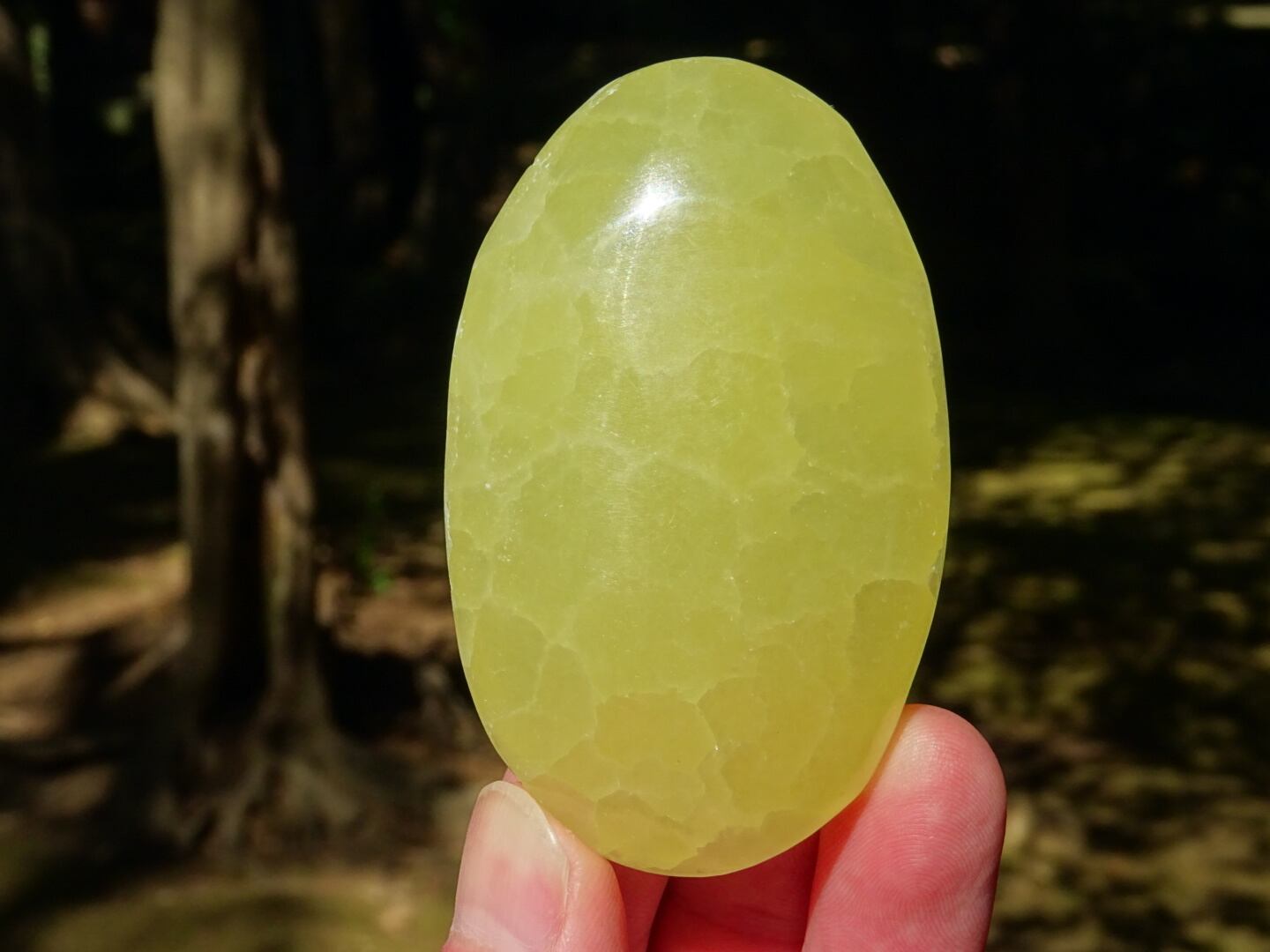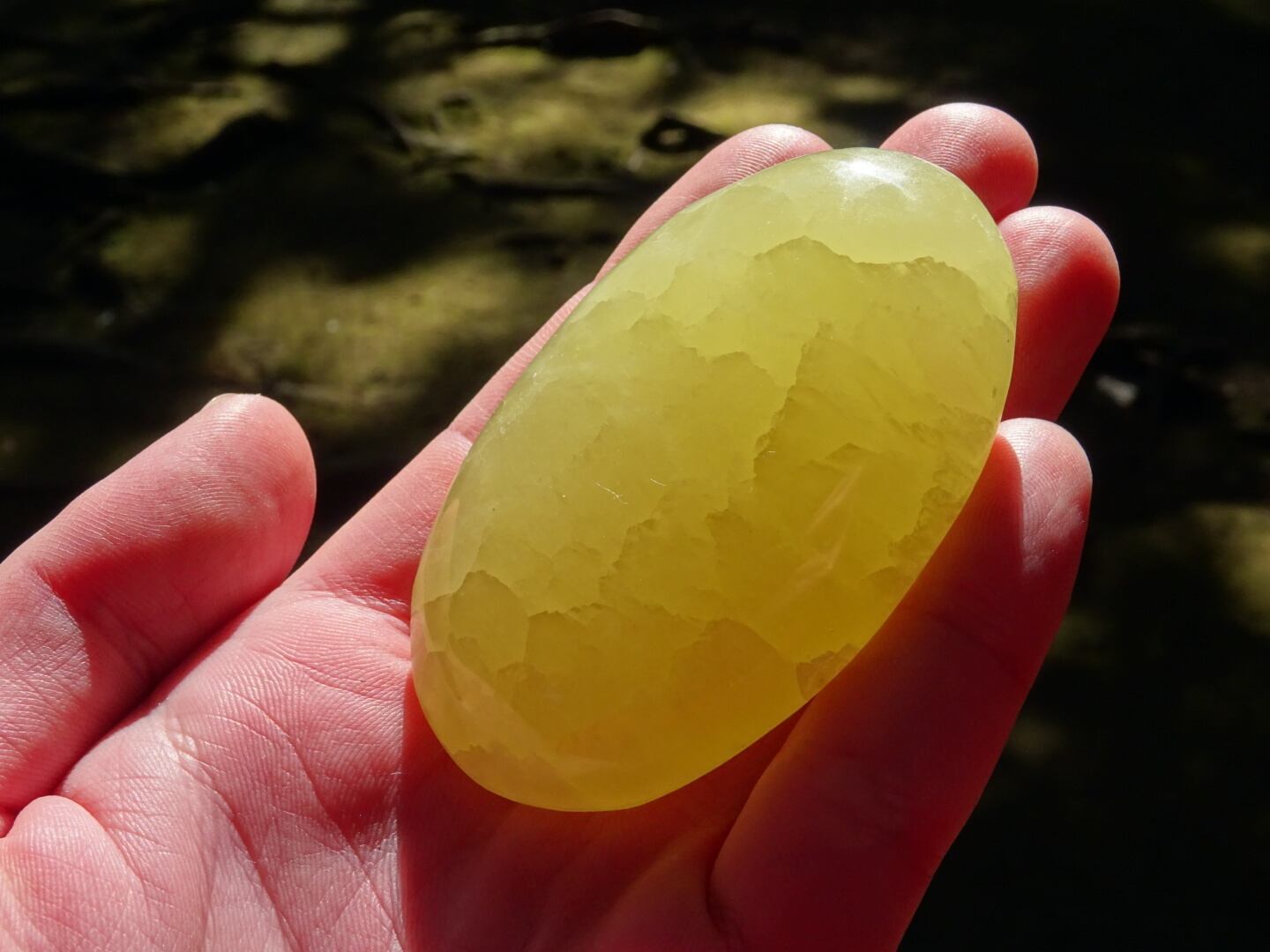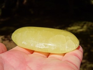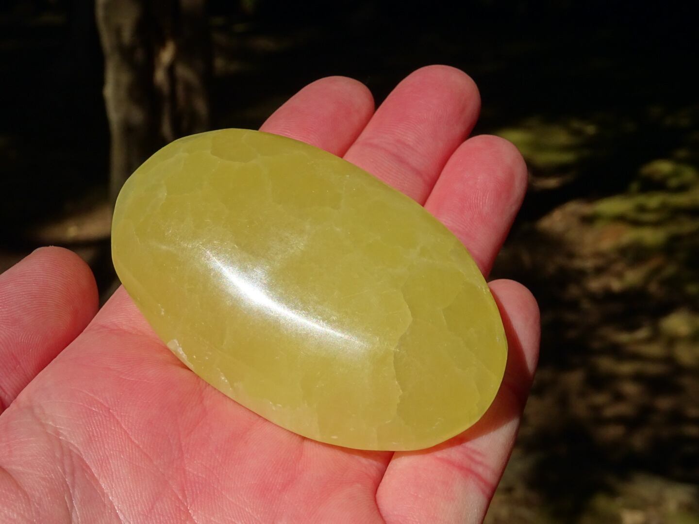 みずみずしいイエローのレモンカルサイトの磨き石。ツルツルの石肌も心地よいです。