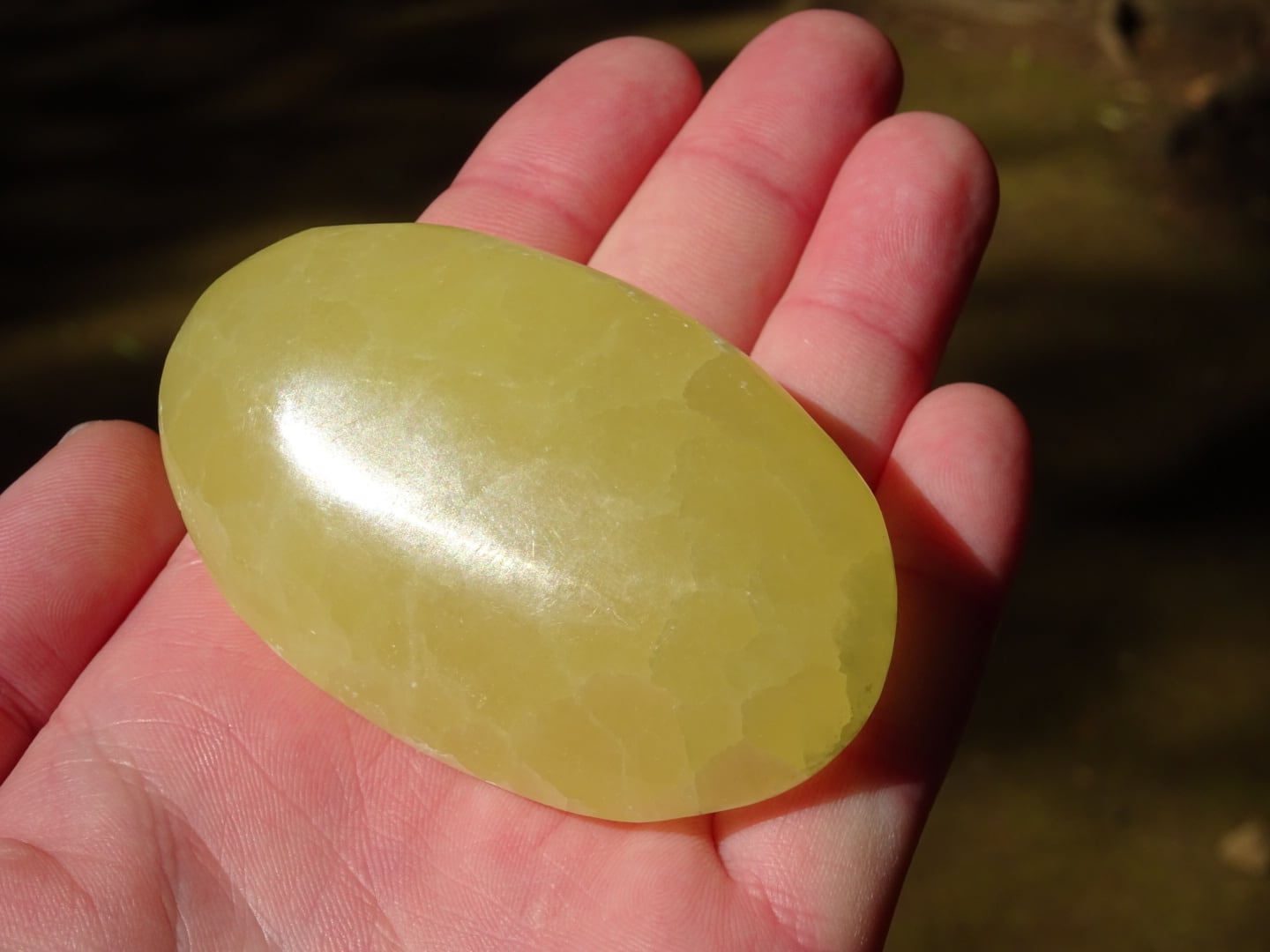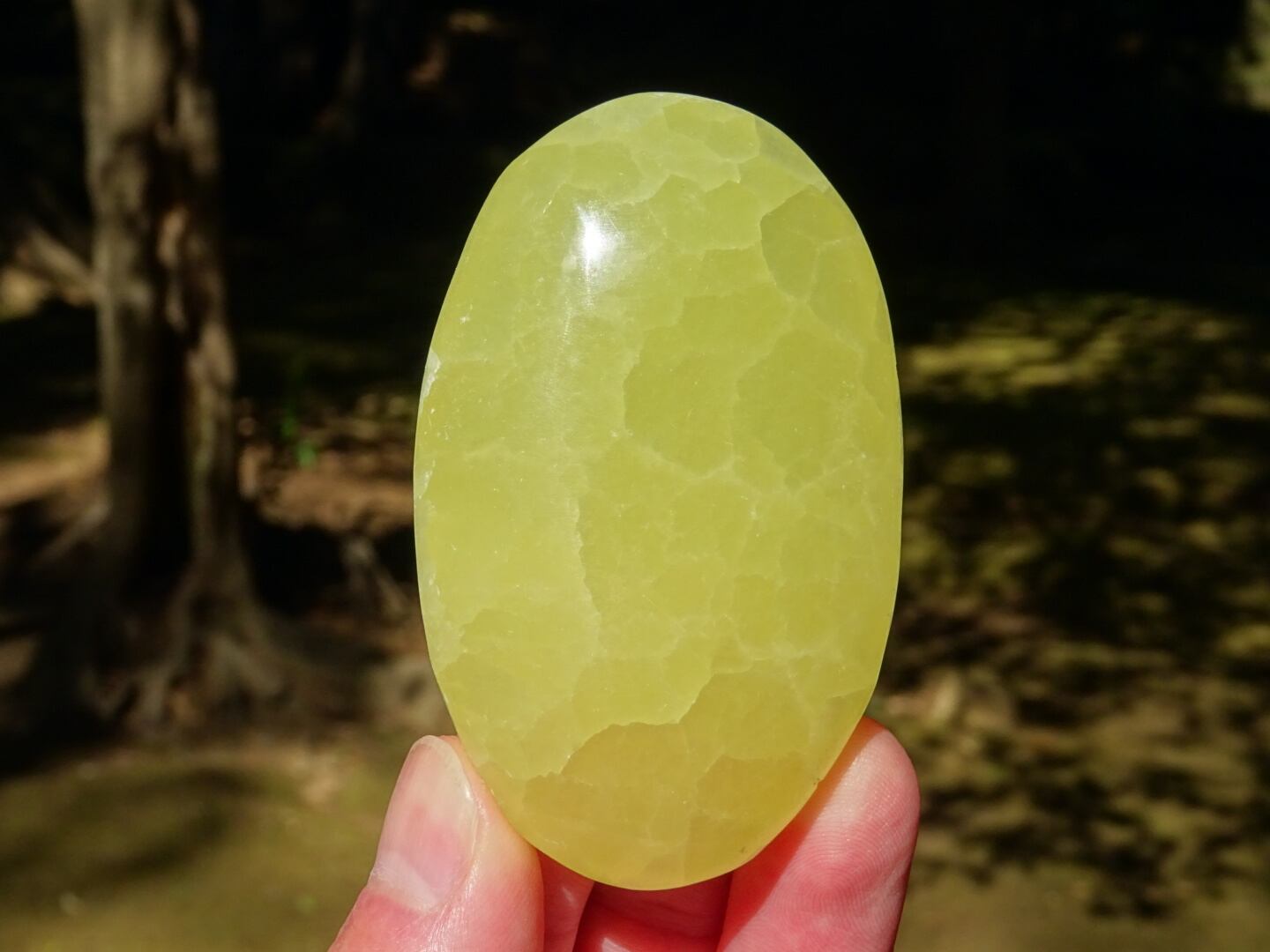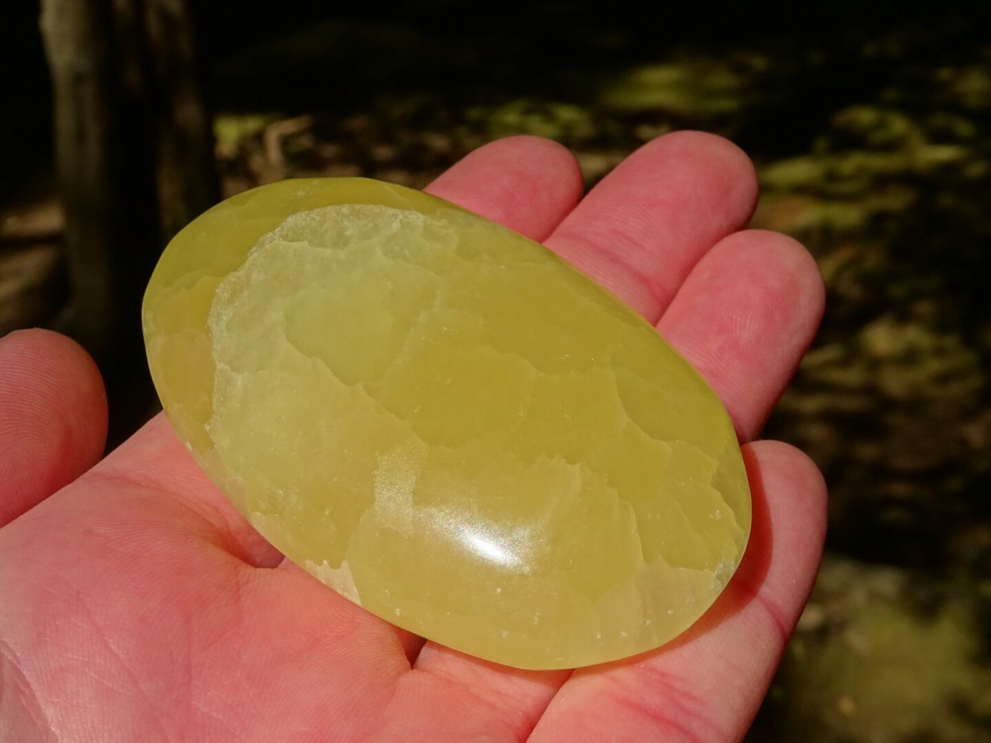 みずみずしいイエローのレモンカルサイトの磨き石。ツルツルの石肌も心地よいです。