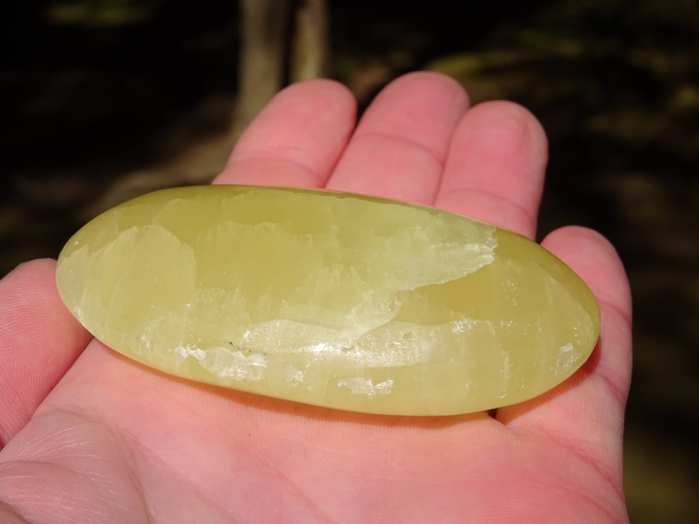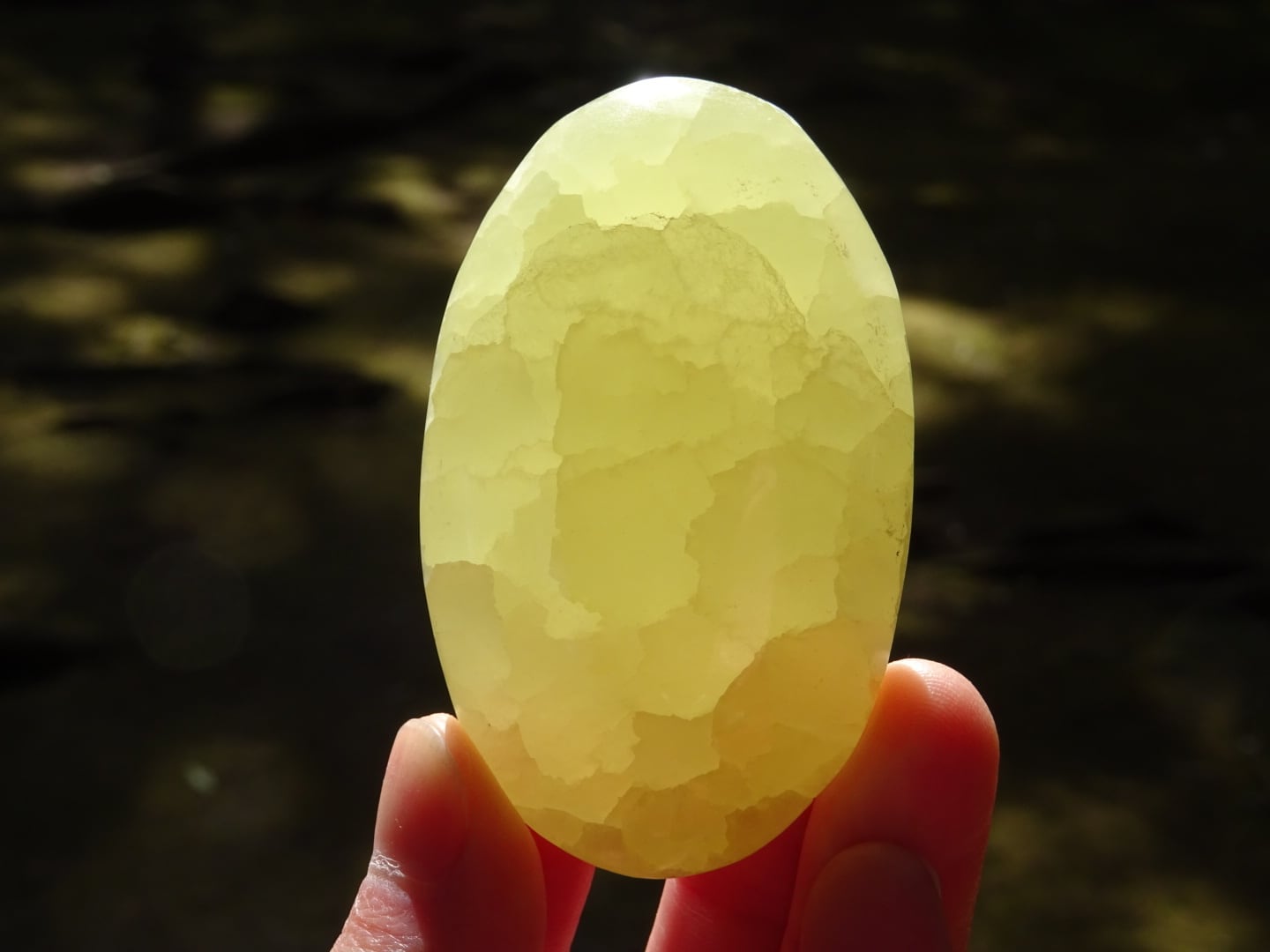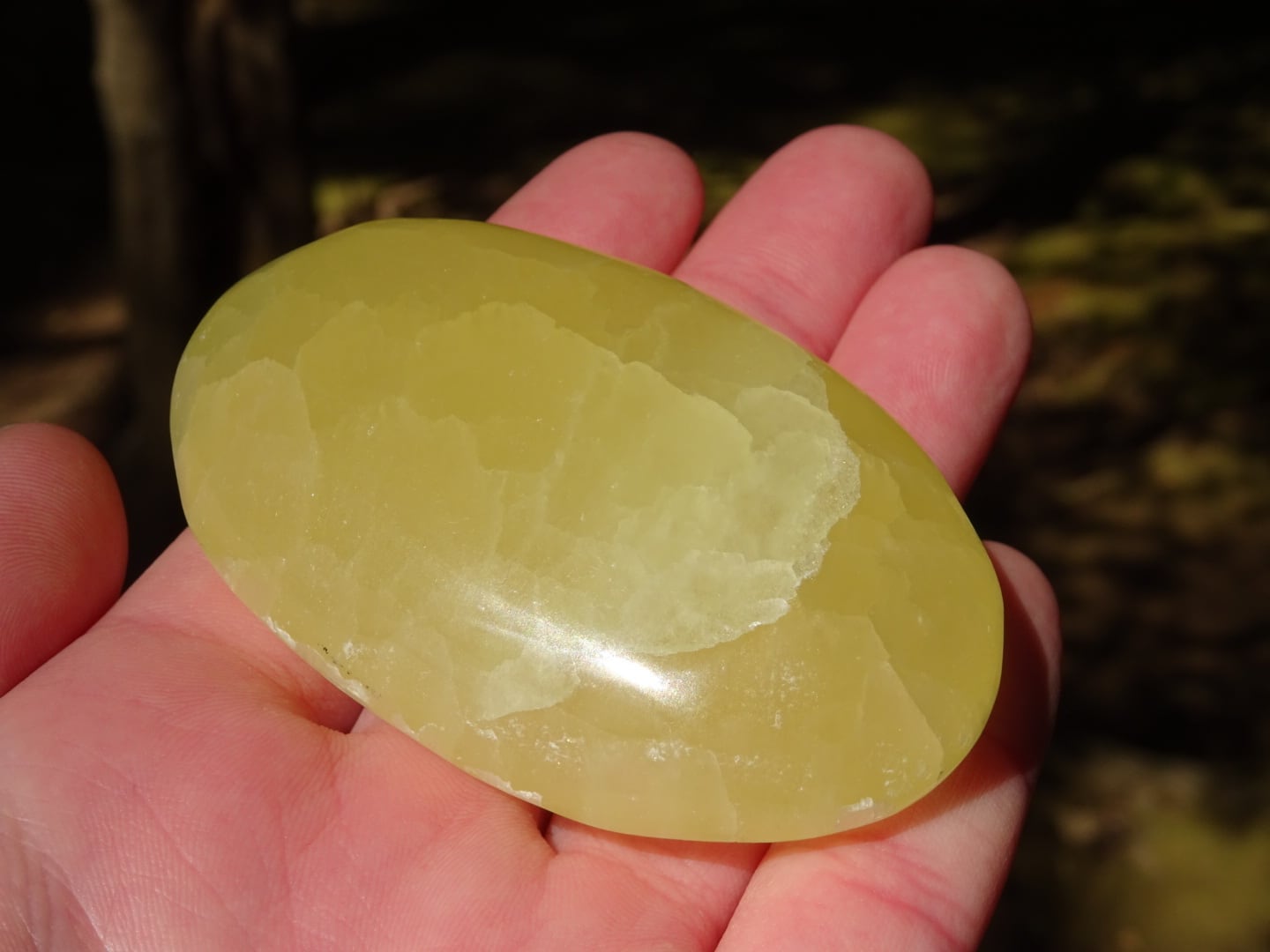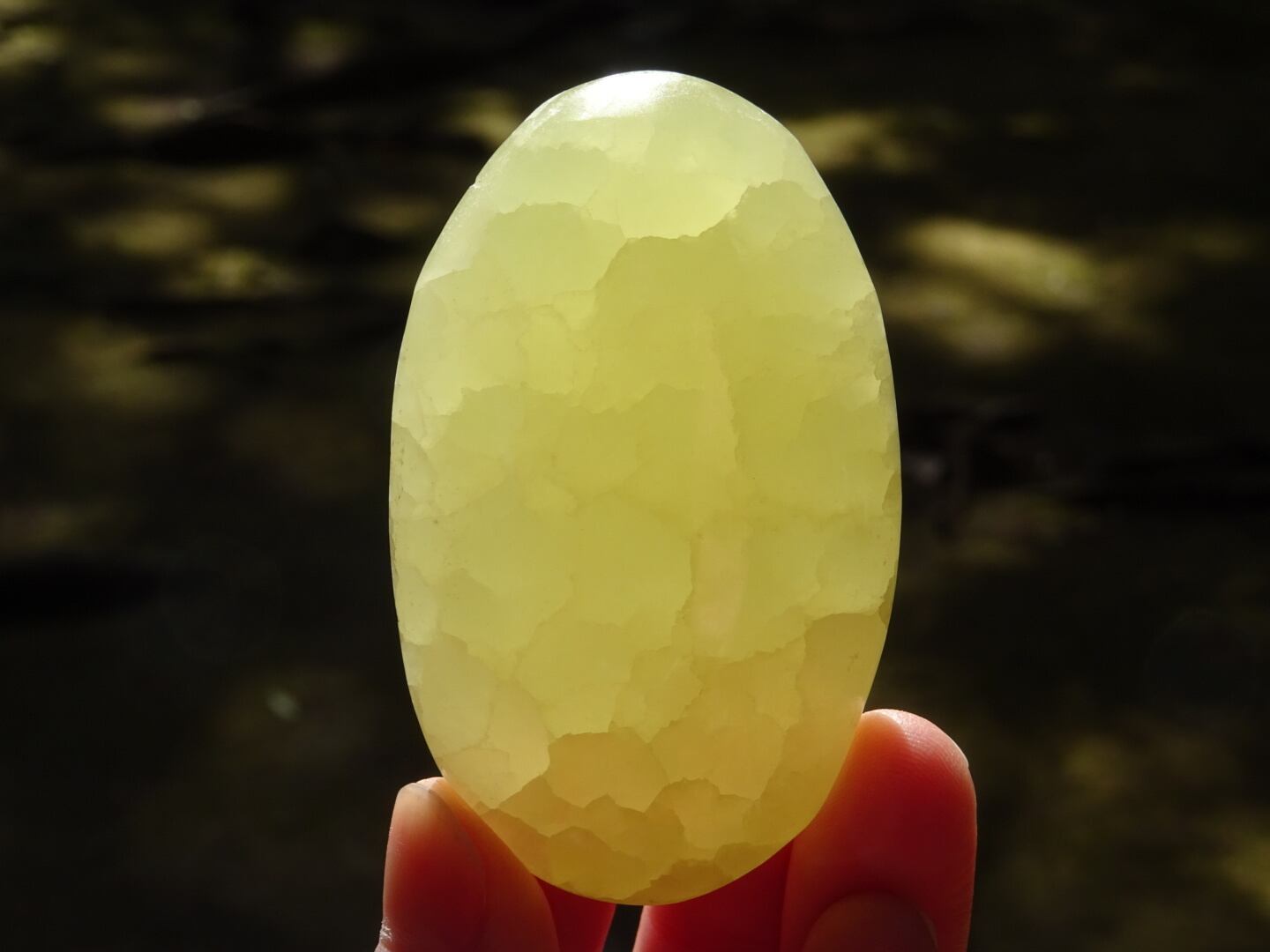 みずみずしいイエローのレモンカルサイトの磨き石。ツルツルの石肌も心地よいです。