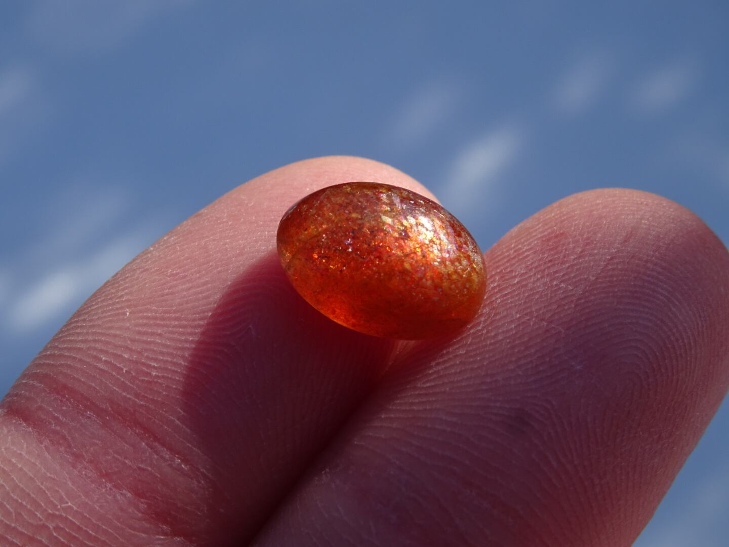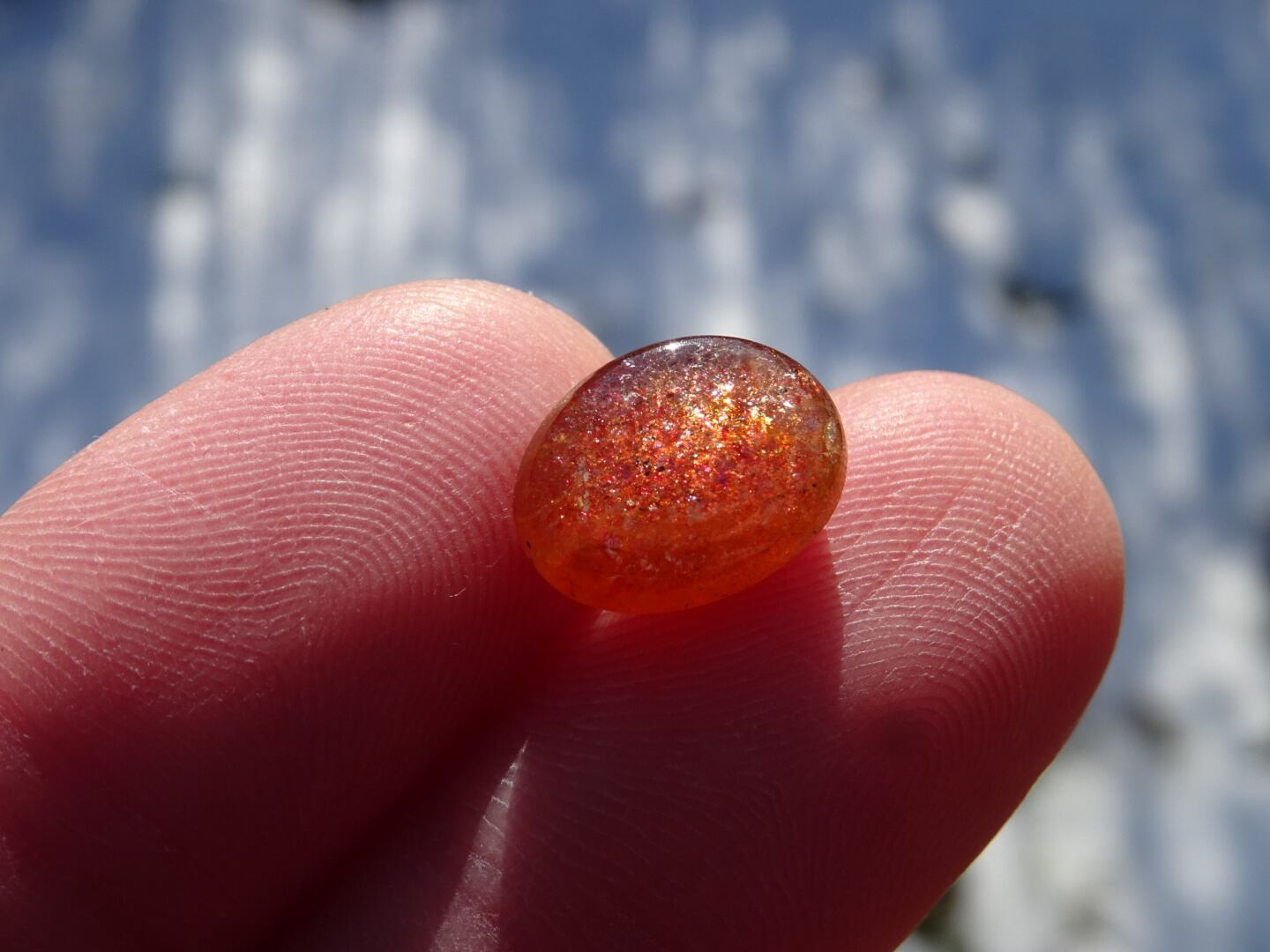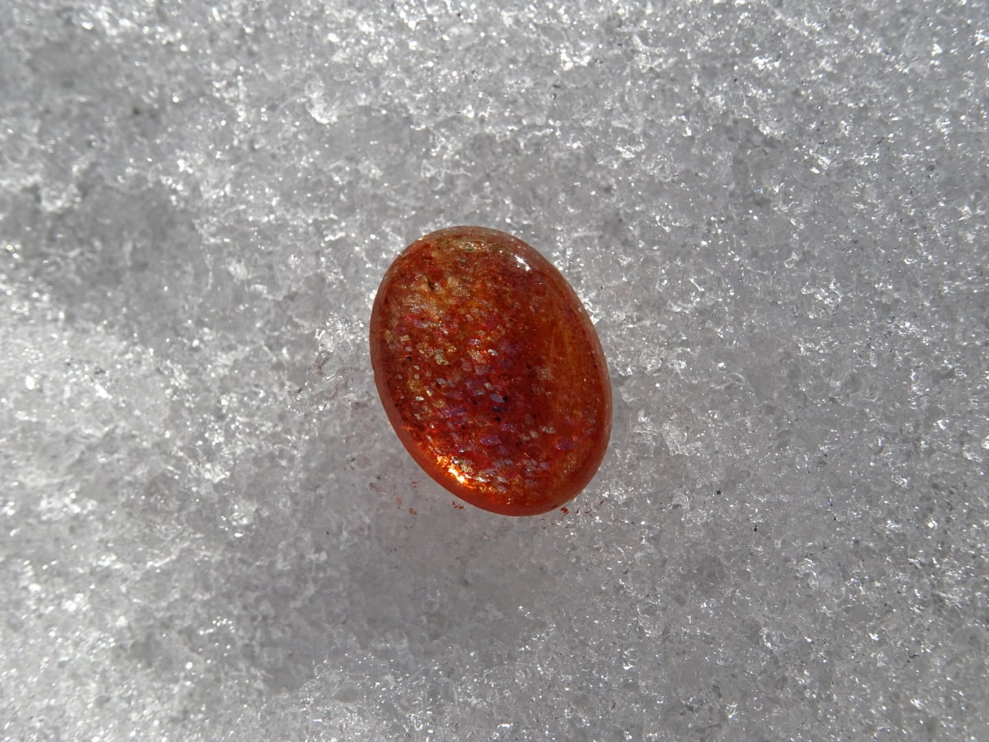 オレンジレッドにきらきらのレッセンスを浮かべた、サンストーンの小さなルース。