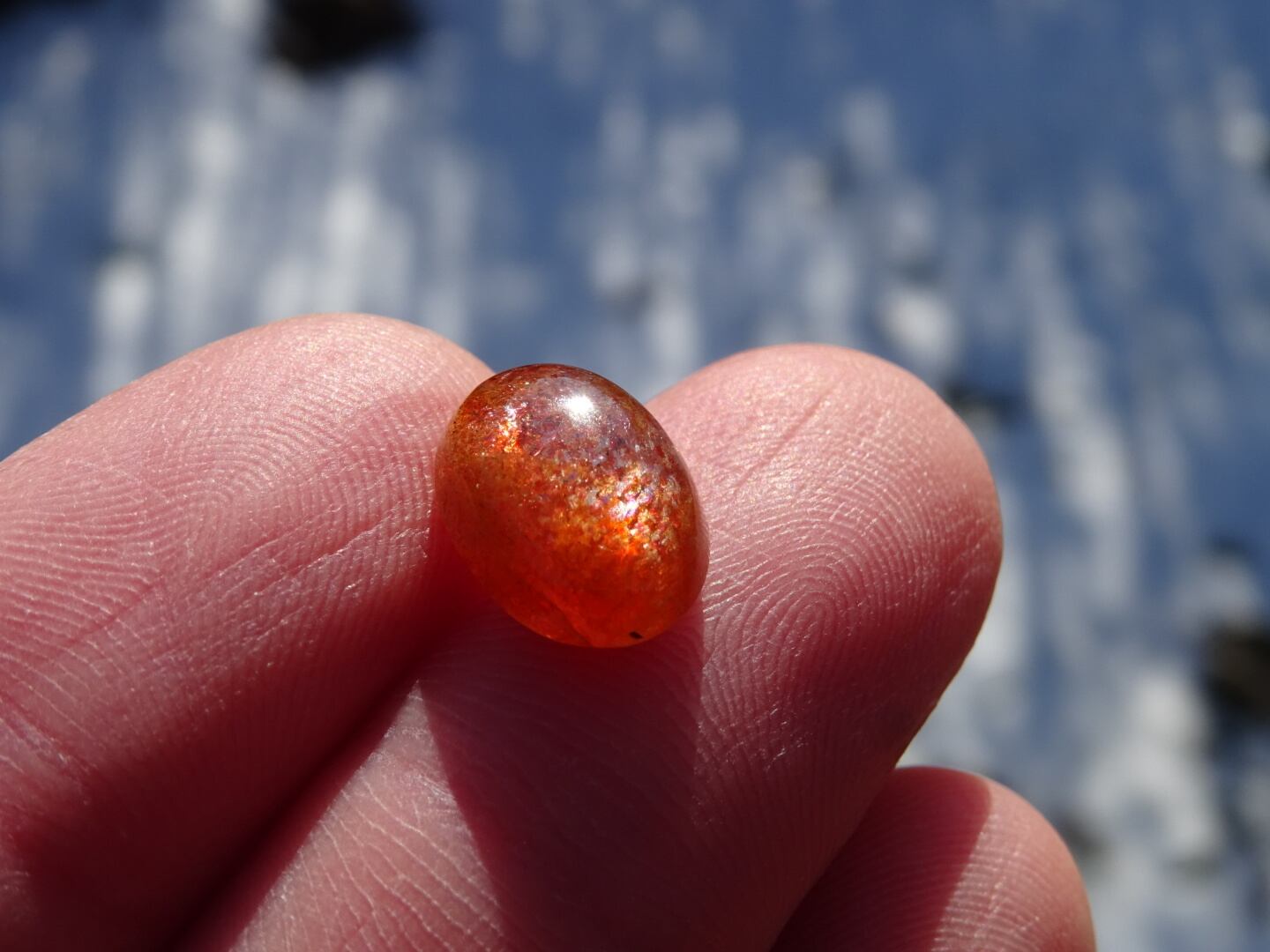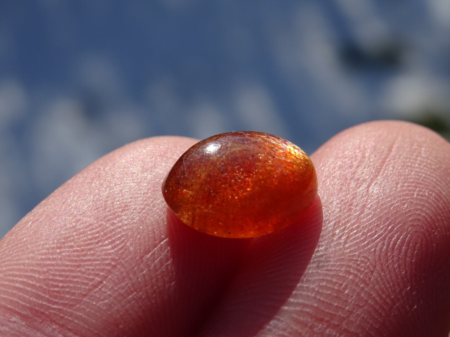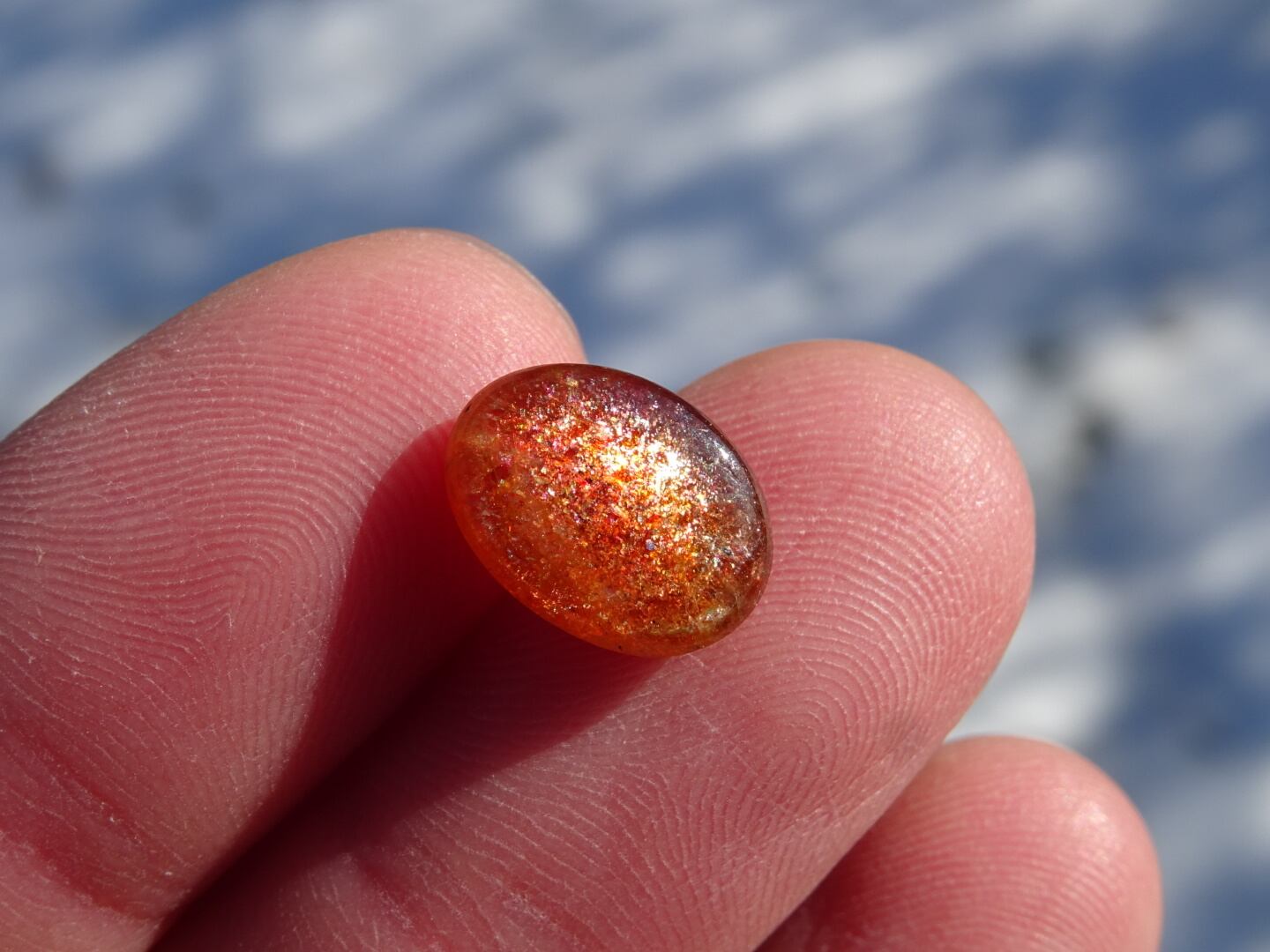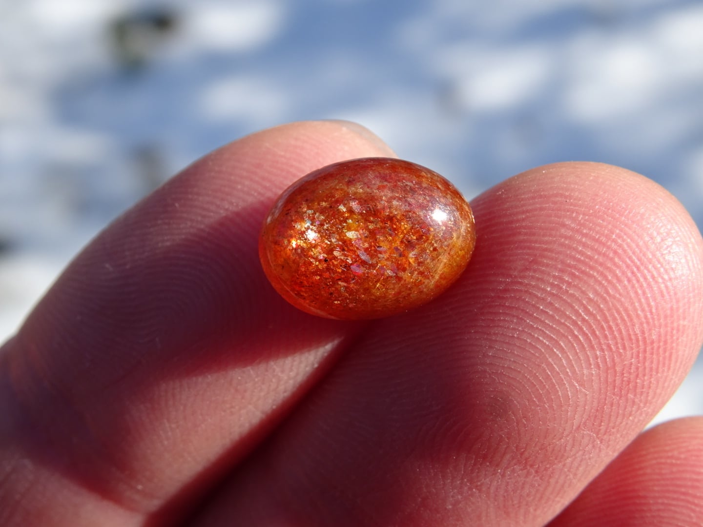 オレンジレッドにきらきらのレッセンスを浮かべた、サンストーンの小さなルース。