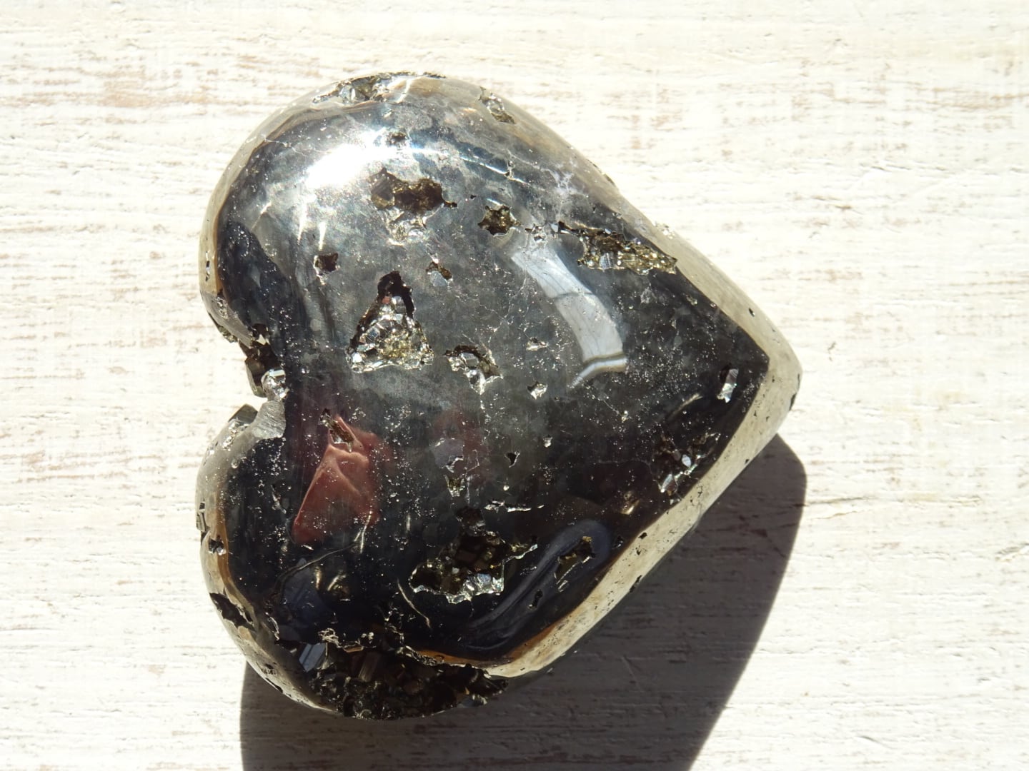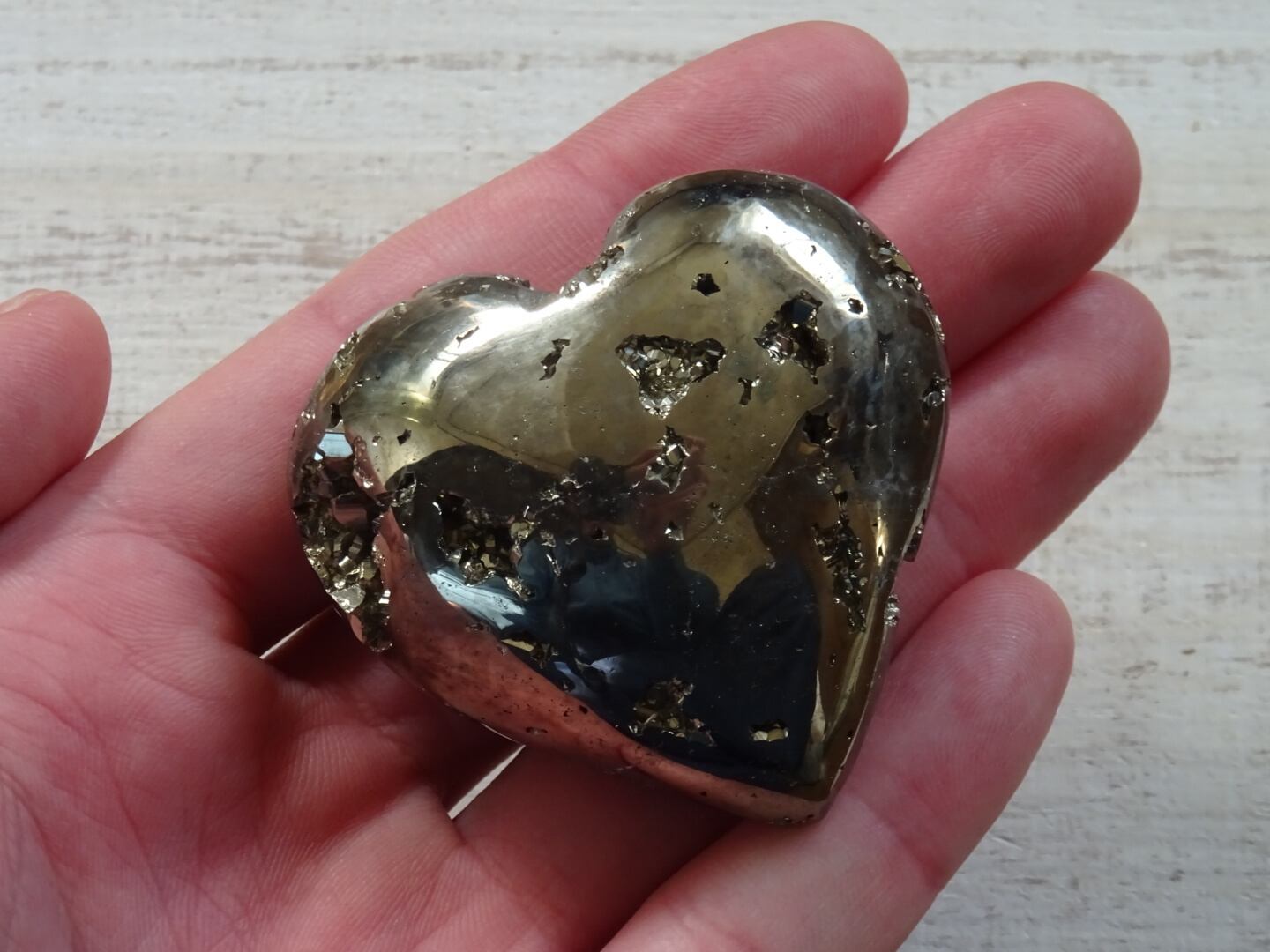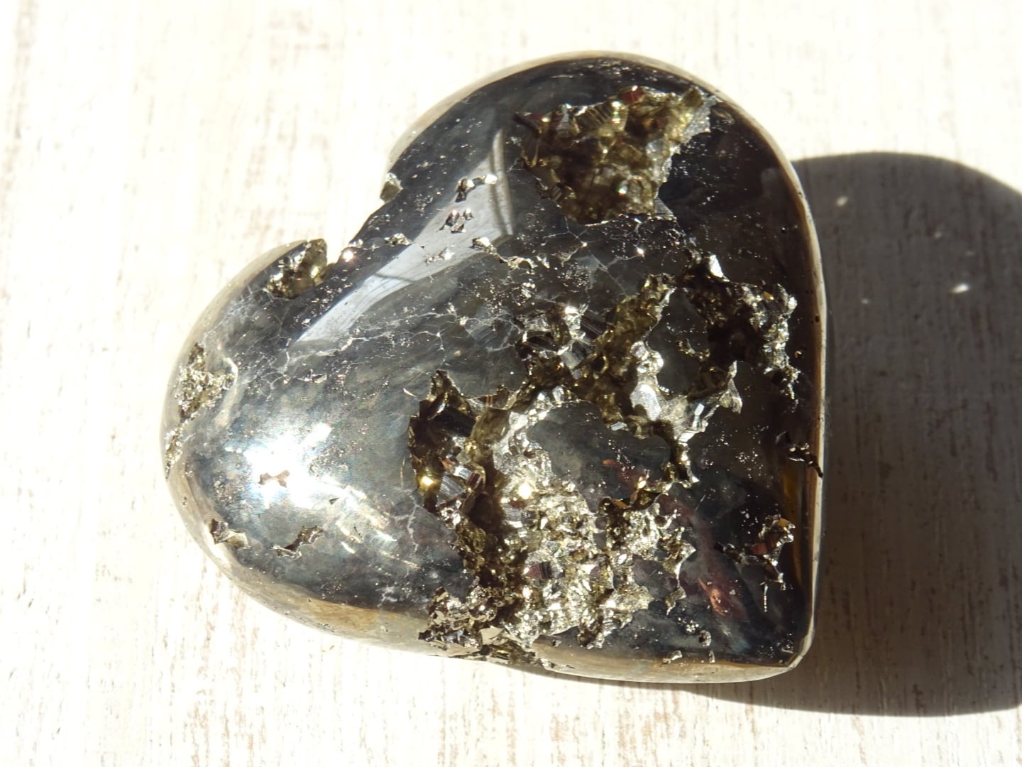メタリックゴールドのパイライト。ハートシェイプに象られたかわいい磨き石です。