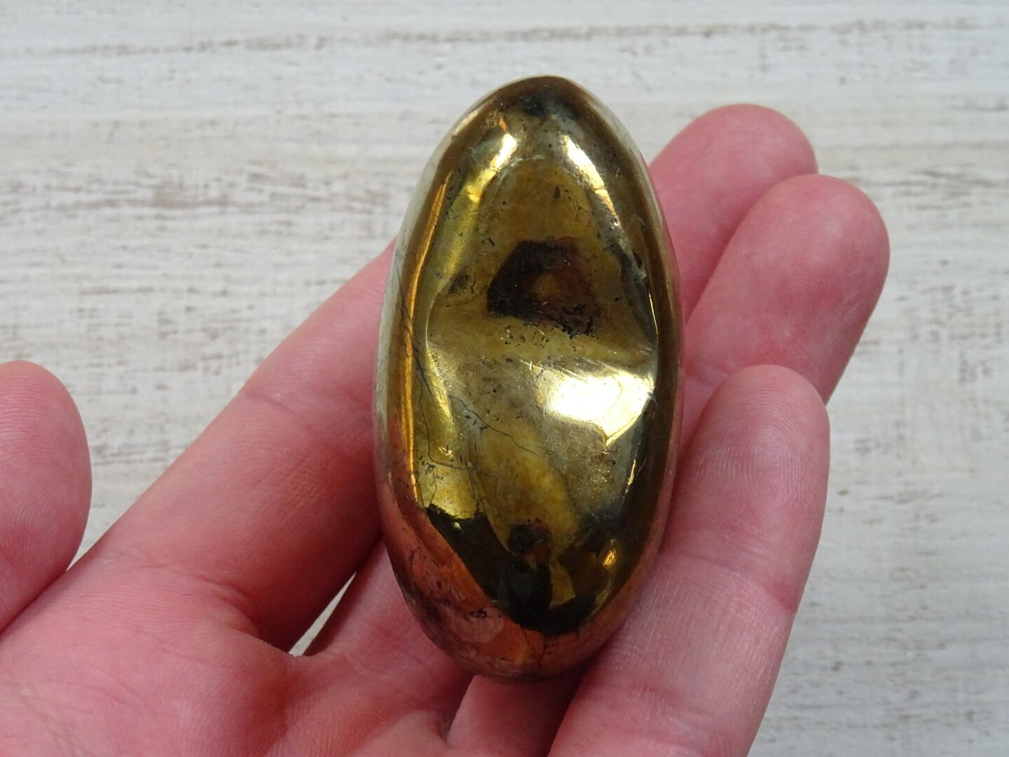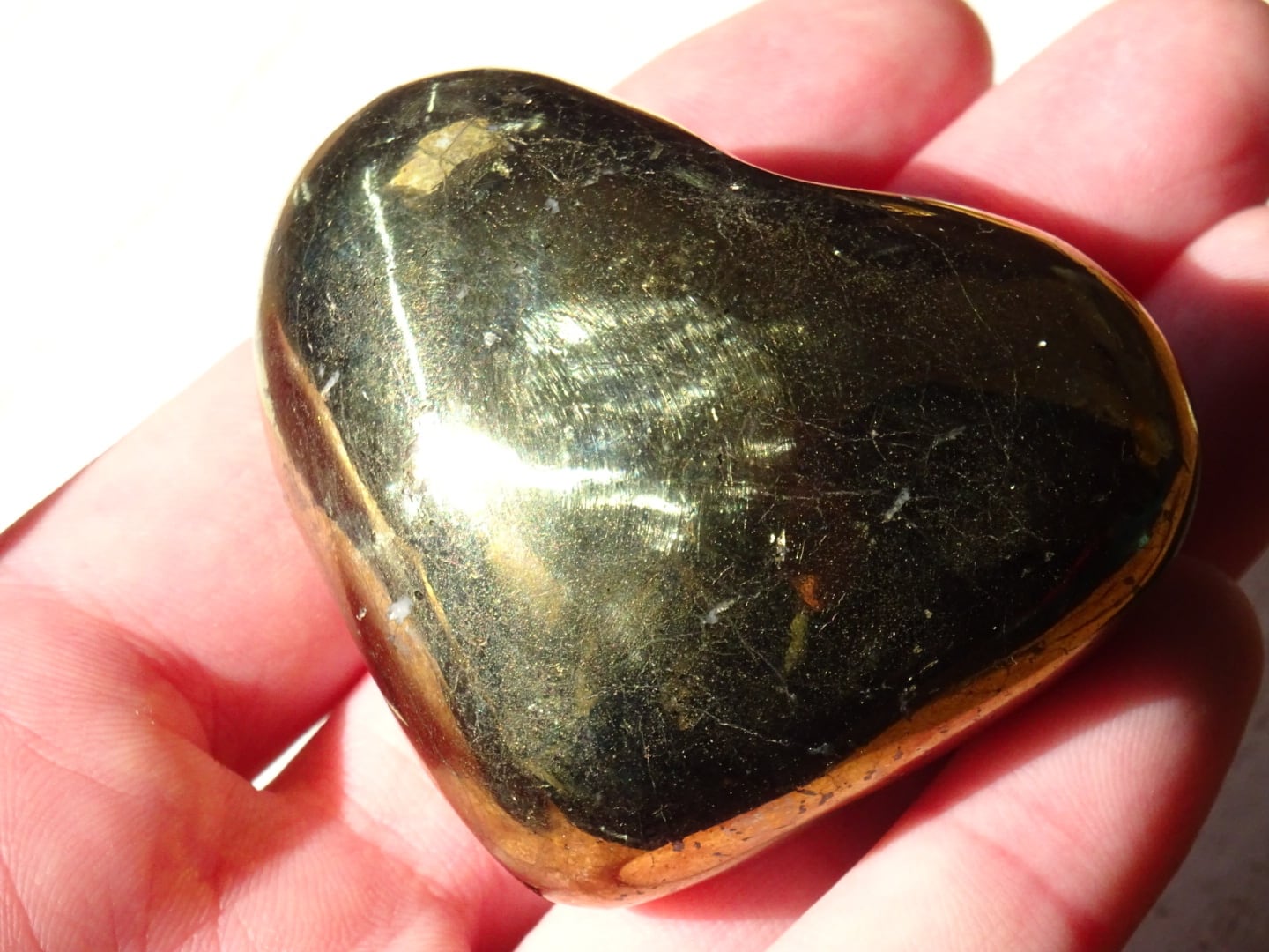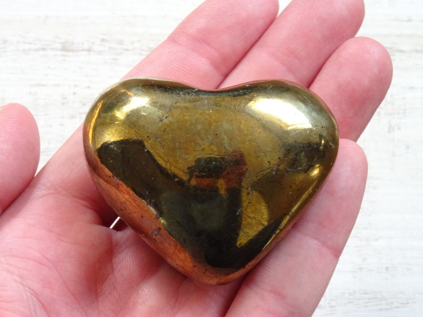 まばゆいゴールドカラーのチャルコパイライト。ハートシェイプに象られたかわいい磨き石です。